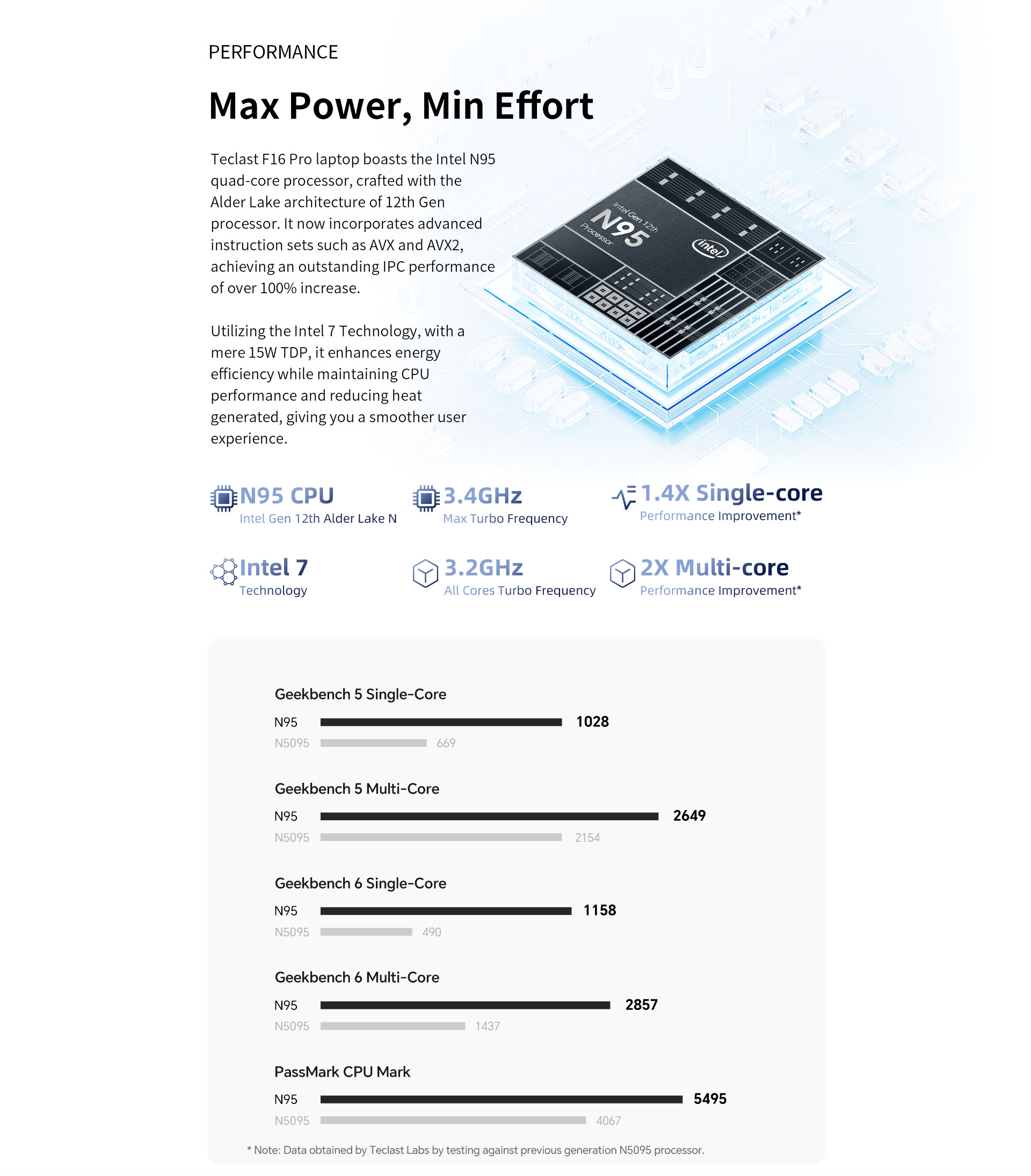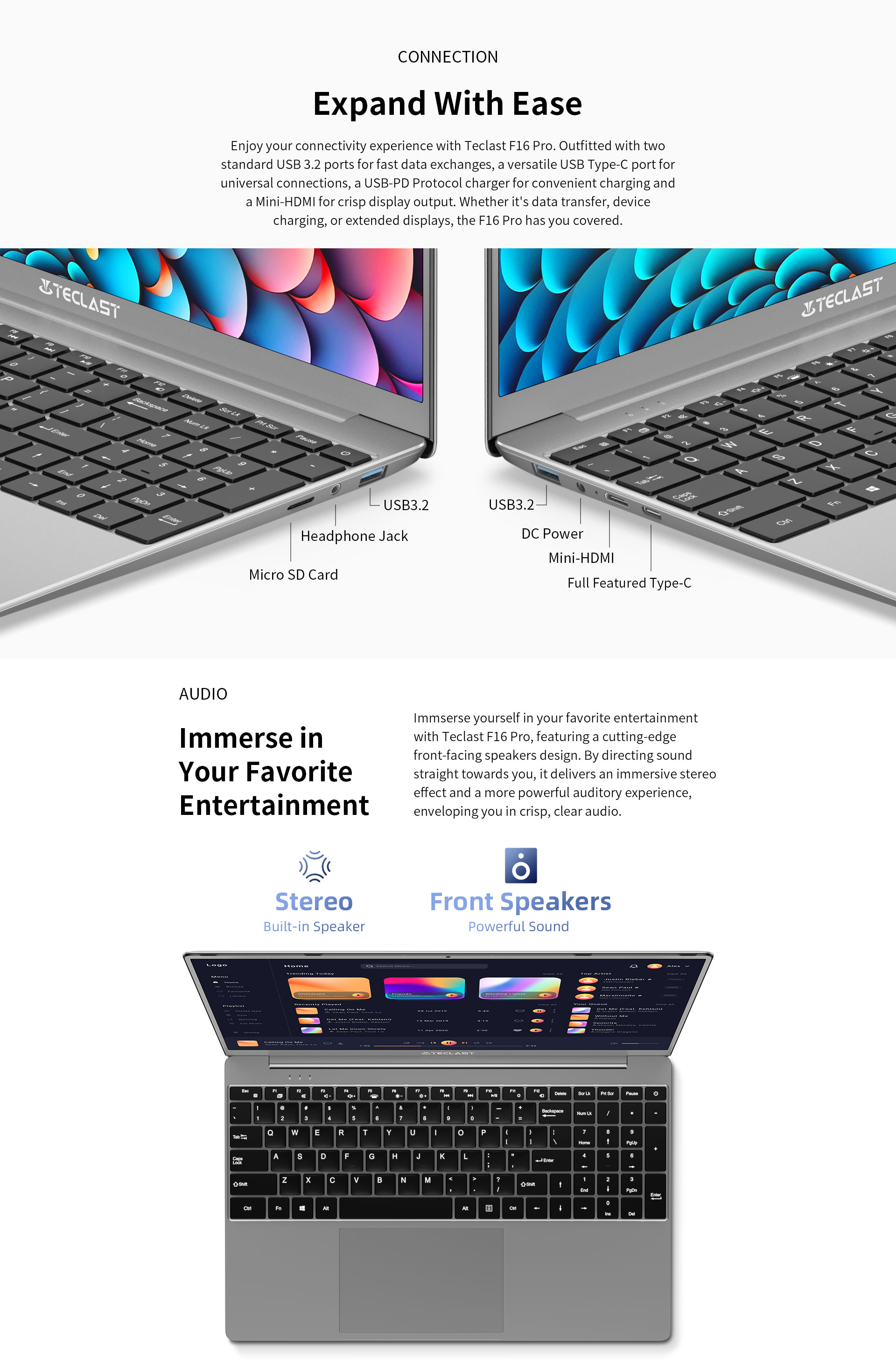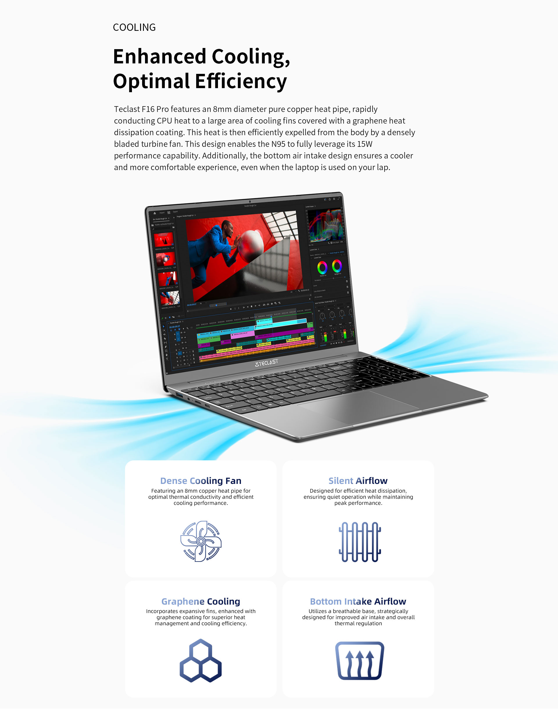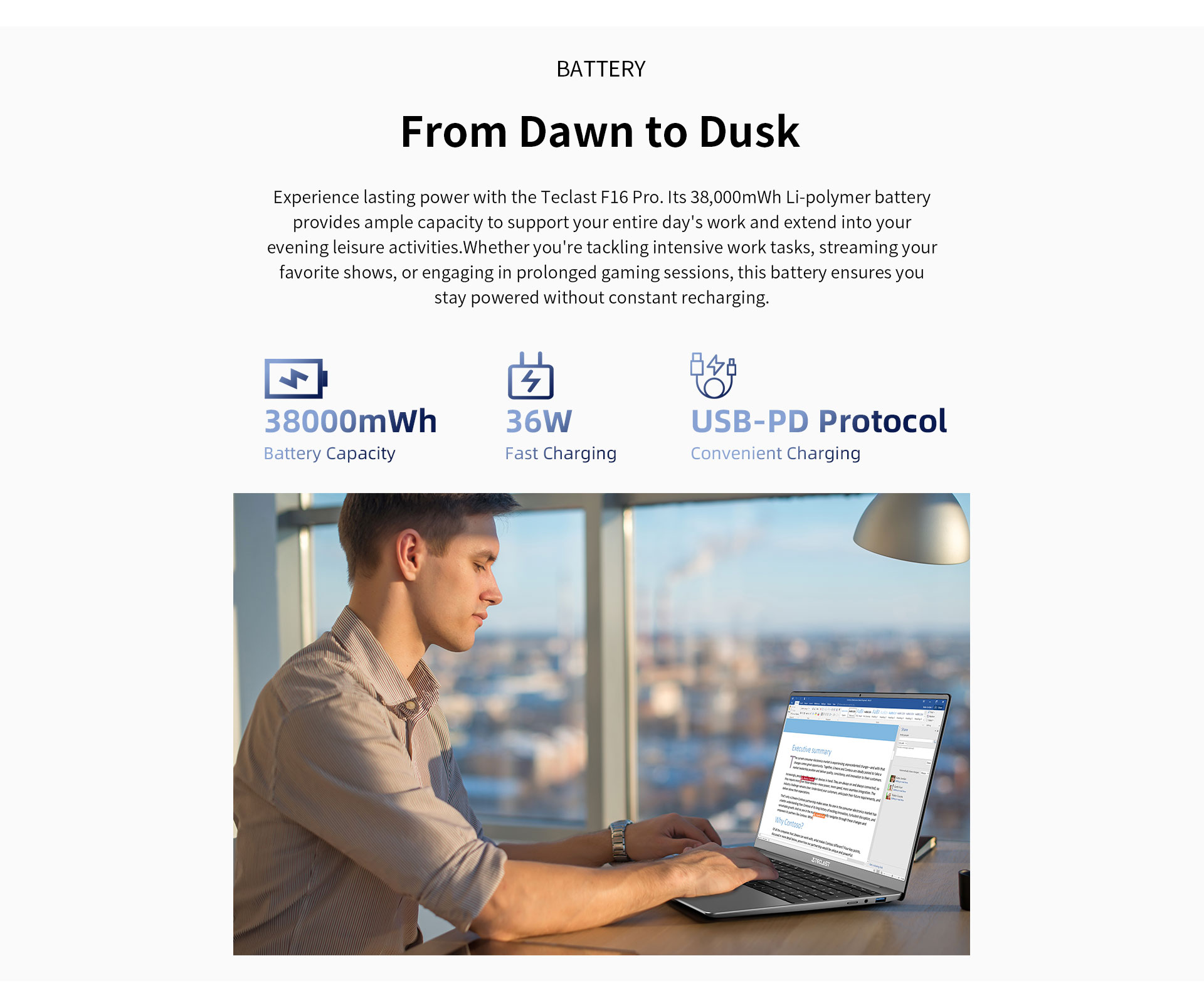 [Intel® Gen 12th N95] Powered by the Intel® Gen 12th Alder Lake N95 Processor, the F16 Pro reaches up to 3.4GHz with Turbo Boost, delivering exceptional speed and responsiveness for multitasking and demanding applications.