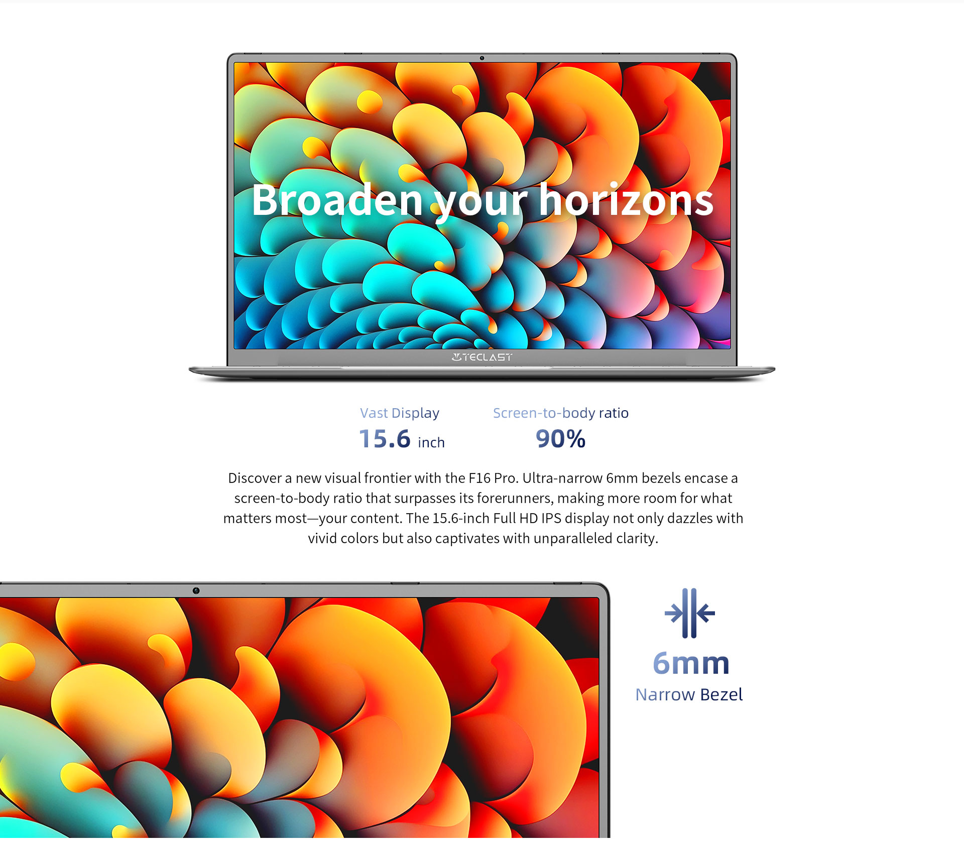 [15.6-inch IPS Screen] The 15.6-inch IPS display, framed by 6mm narrow bezels, offers vivid colors and crisp details, making it perfect for both work and entertainment.
