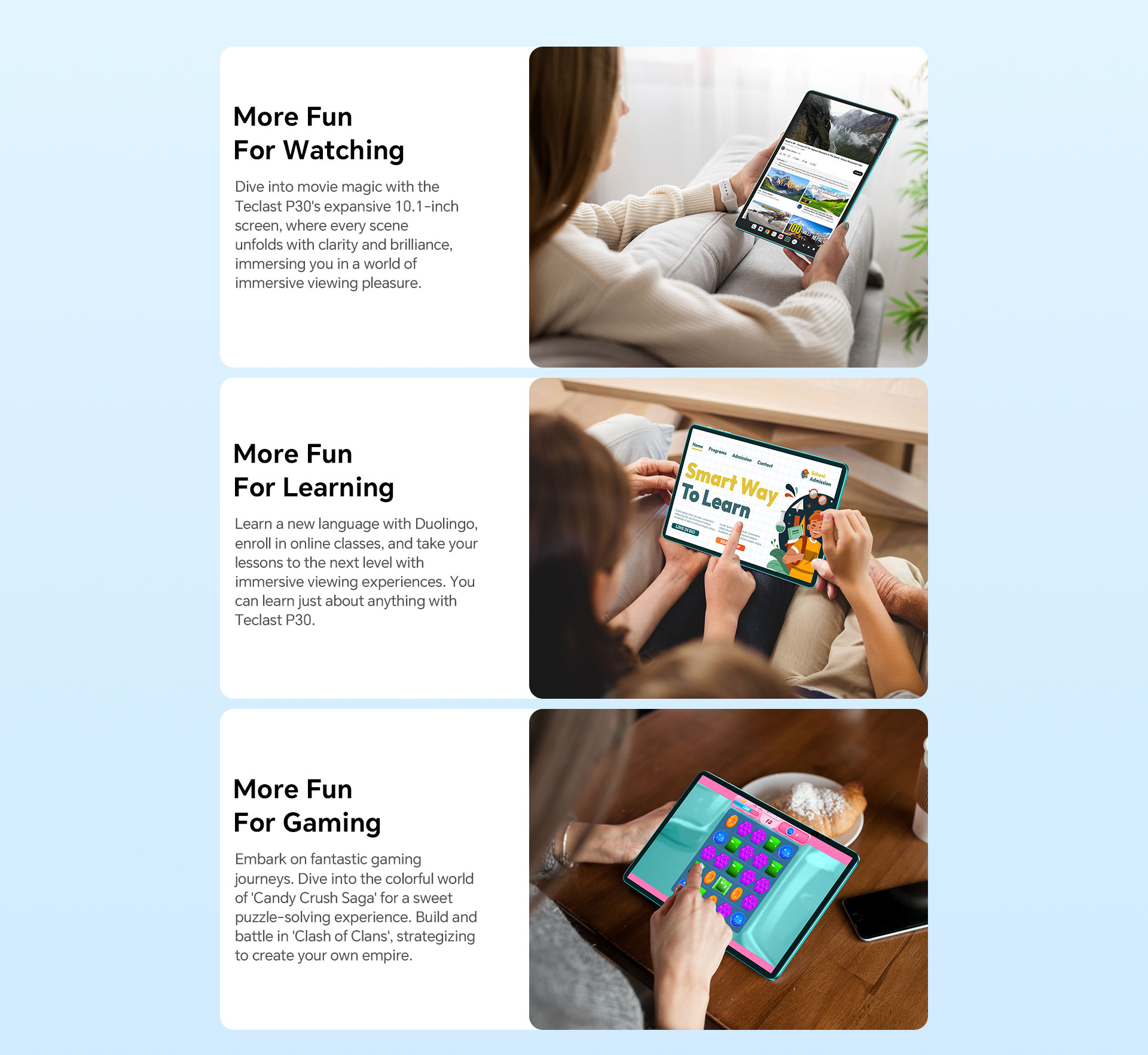 [Stunning Visuals] Boasting a TDDI Fully Laminated Display with a 1280x800 high-definition resolution, the P30 tablet ensures vivid and crisp visuals, enhancing your viewing experience.
