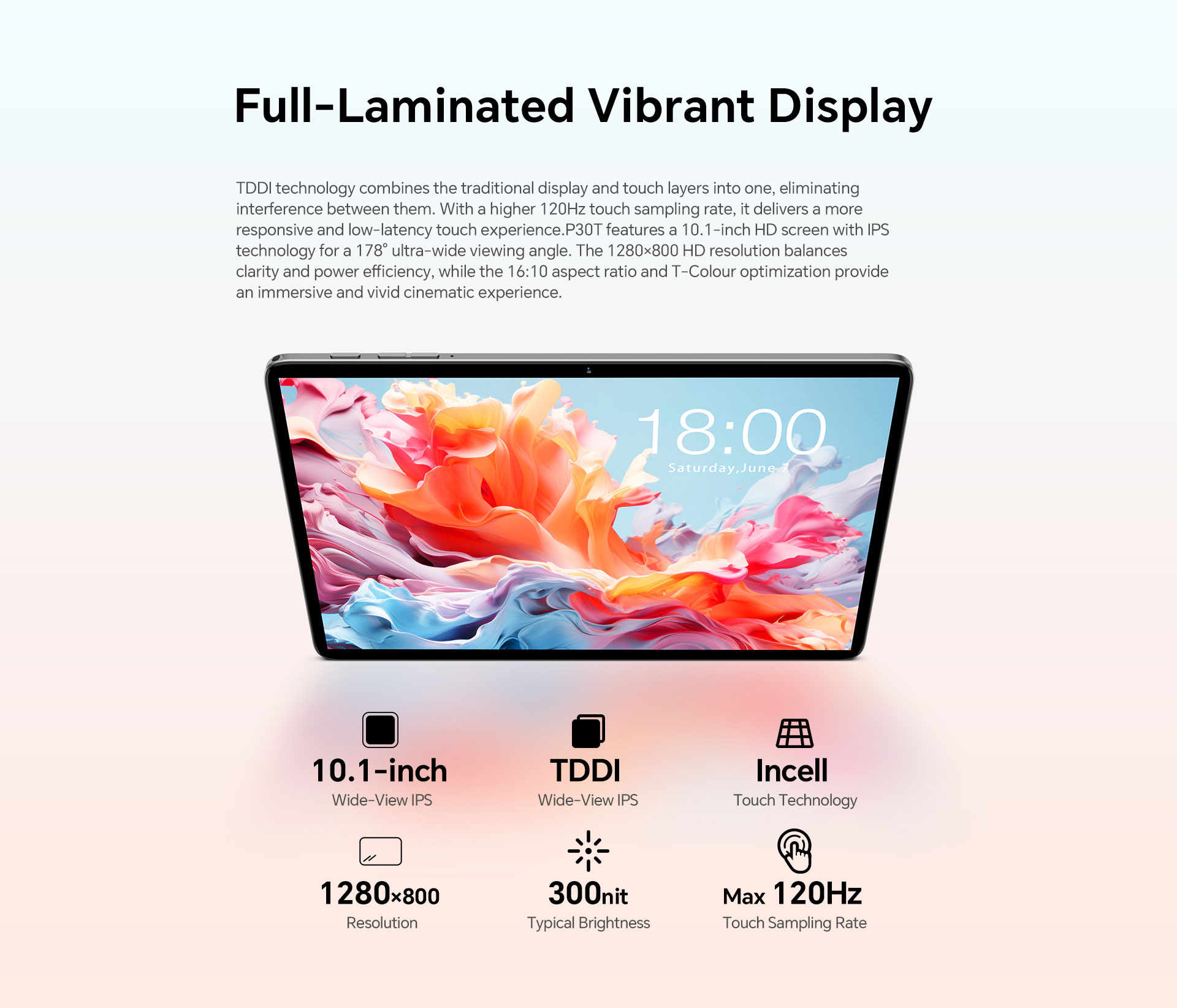 [Stunning Visuals] Boasting a TDDI Fully Laminated Display with a 1280x800 high-definition resolution, the P30 tablet ensures vivid and crisp visuals, enhancing your viewing experience.