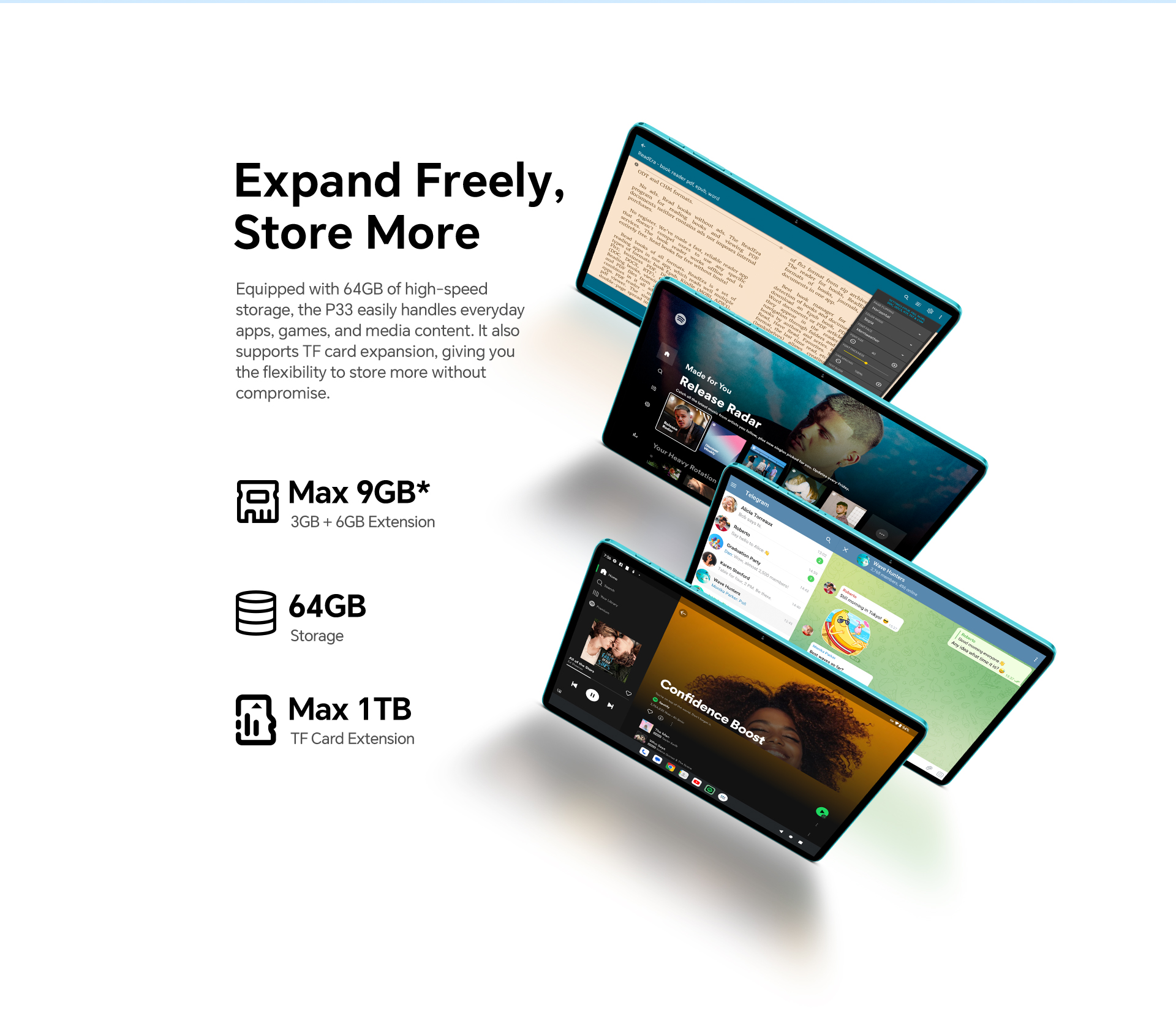[Practical Storage] The P33 tablet has up to 9GB RAM and 64GB storage (expandable to 1TB via Micro SD), enough for your daily apps and files.