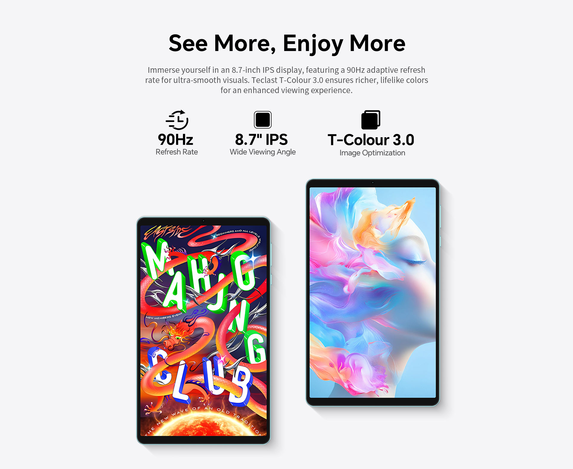 [Vibrant 8.7-inch Display] The Teclast P50 Mini Tablet features a vibrant 8.7-inch display with a 90Hz refresh rate, providing smooth visuals and an immersive viewing experience that's easy on the eyes, whether you're working or relaxing.