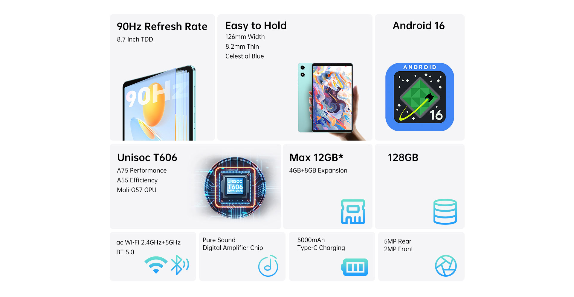 [Powerful Performance] Powered by the efficient Unisoc T606 Octa-Core processor and Mali-G57 GPU, the P50 Mini handles multitasking effortlessly. With up to 12GB RAM (4GB base + 8GB expansion) and 128GB storage, this tablet ensures fast performance and plenty of room for apps, media, and more.