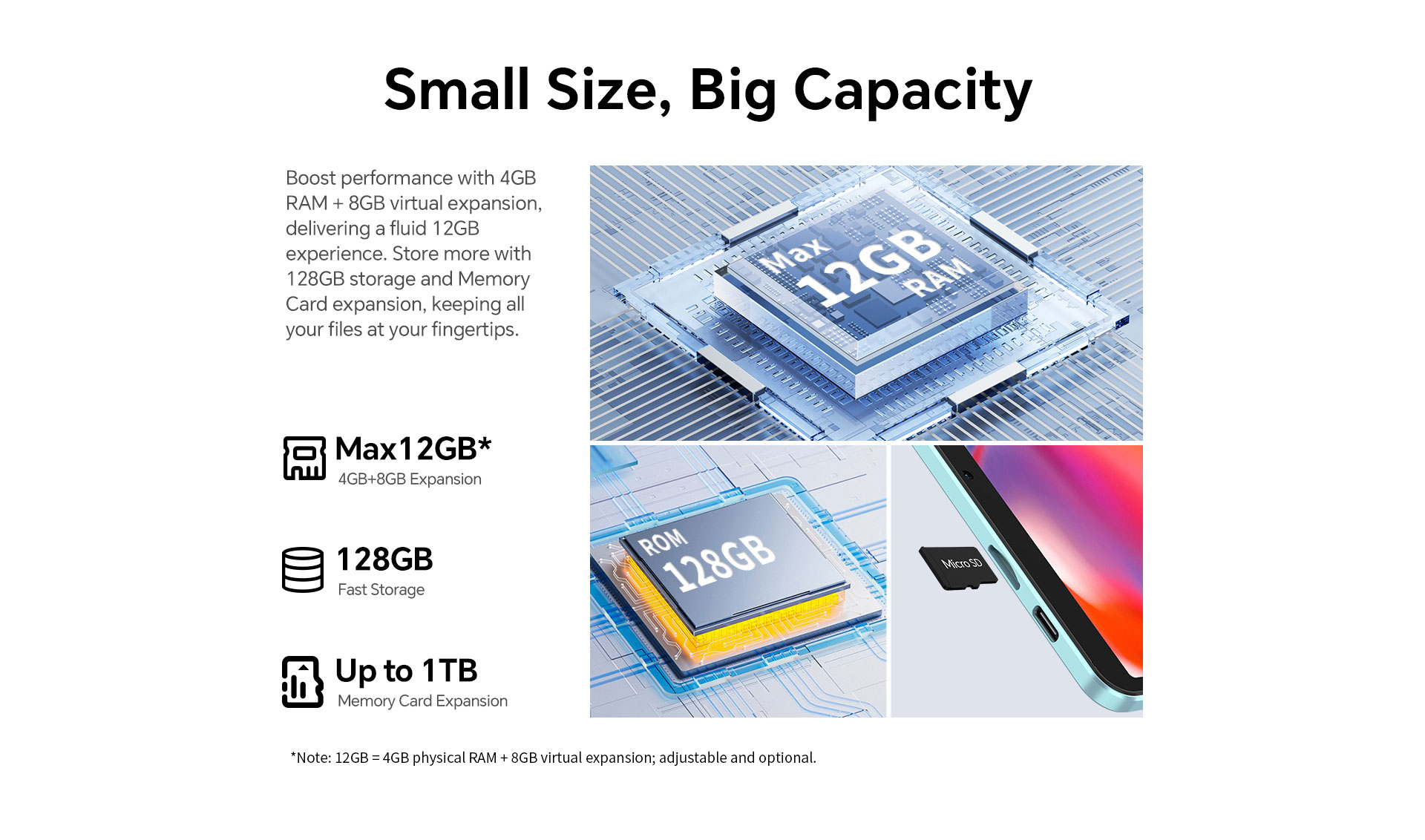 - Max 12GB (4GB RAM + 8GB Expansion)
