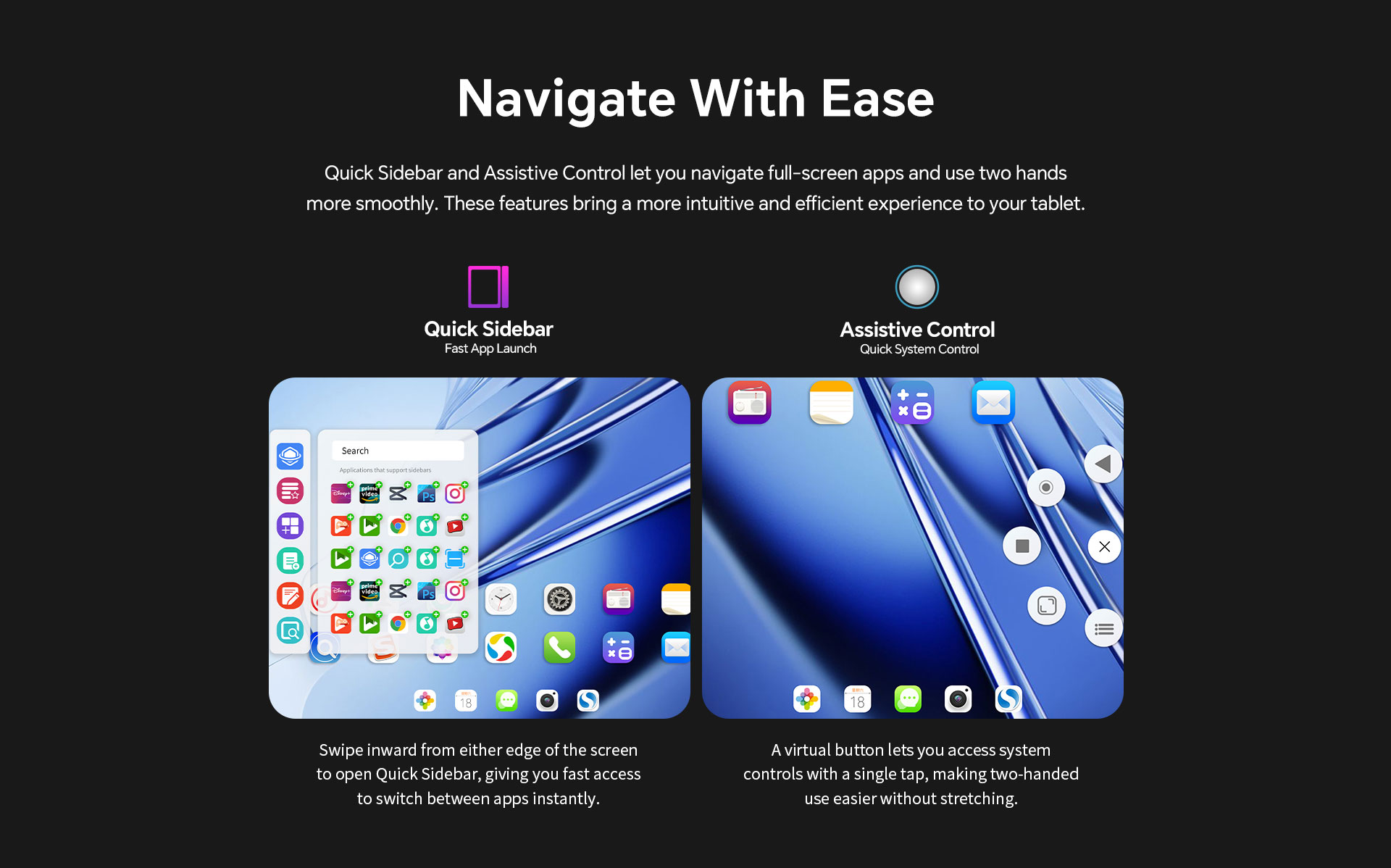[Effortless Navigation] With Android 15 / 16, Quick Sidebar lets you swiftly switch between apps with a simple swipe, while Assistive Control enables quick system adjustments with a single tap, enhancing comfort for two-handed use.