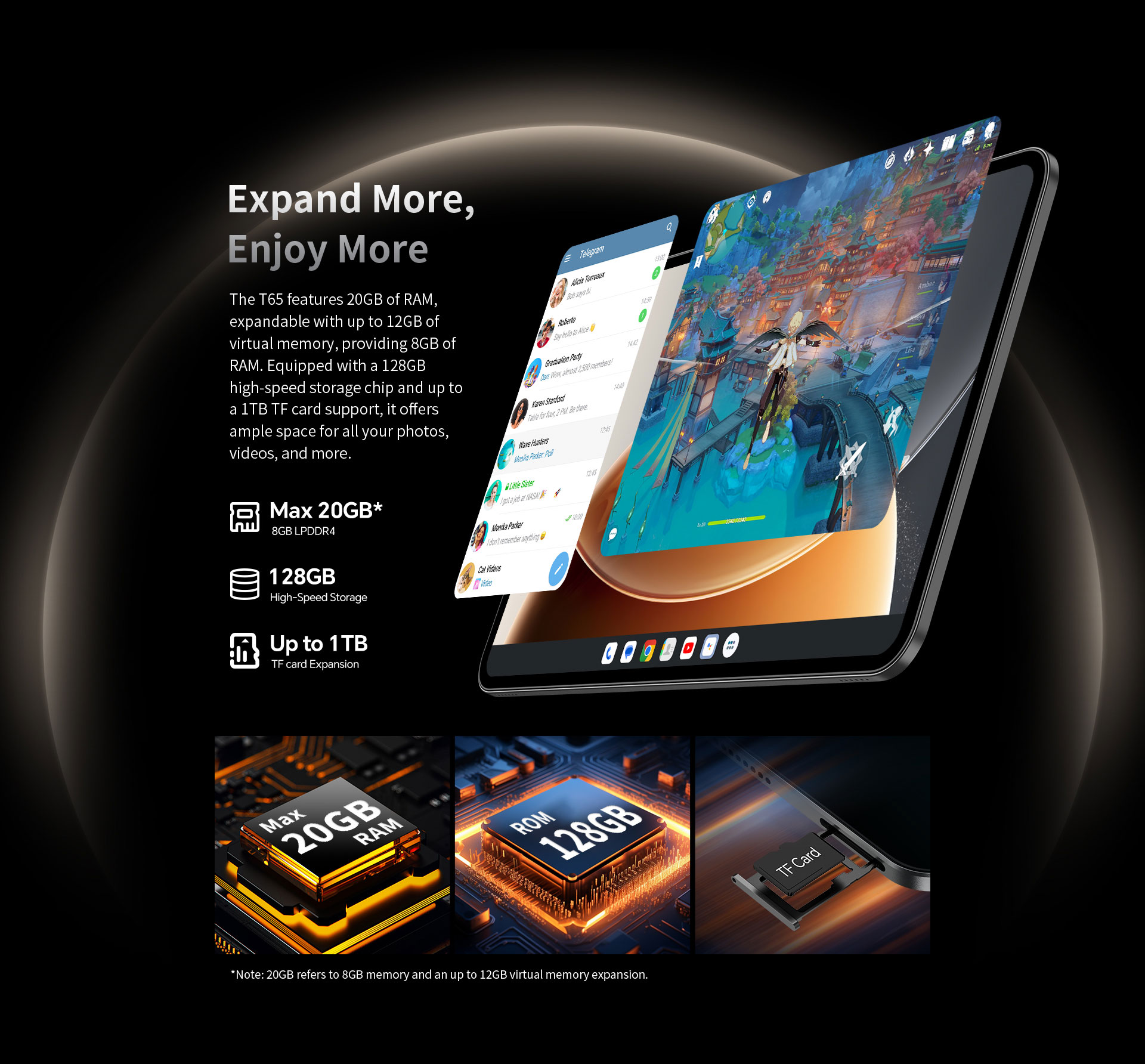 [Expandable Storage] With up to 20GB RAM (Max 8GB + 12GB virtual expansion) and Max 256GB of storage, expandable up to 1TB, you’ll have ample space and power to run apps, store content, and work seamlessly.