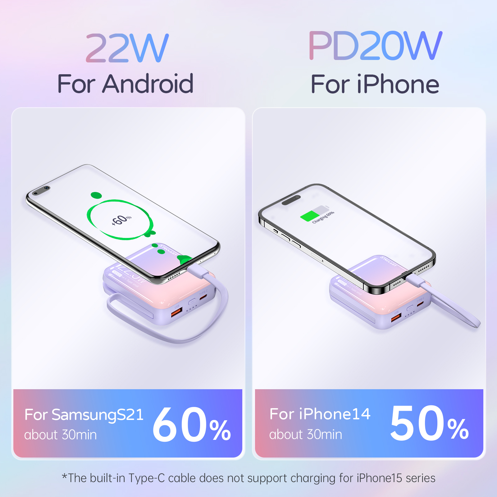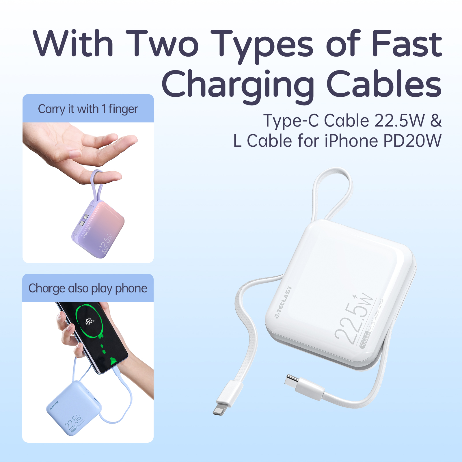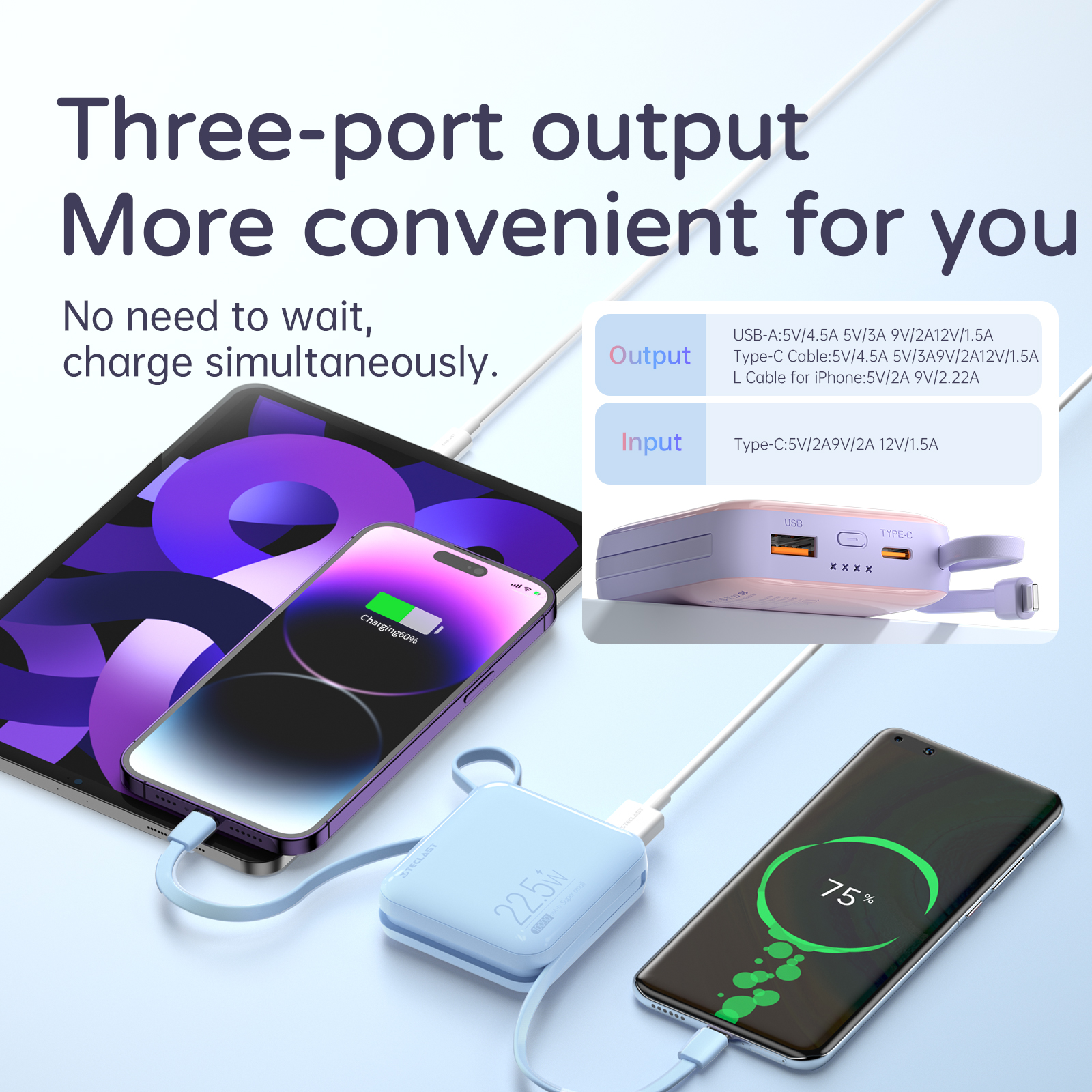 Built-in Type-C (22.5W) & Lightning (20W) cables, plus 3-port output for simultaneous multi-device charging.