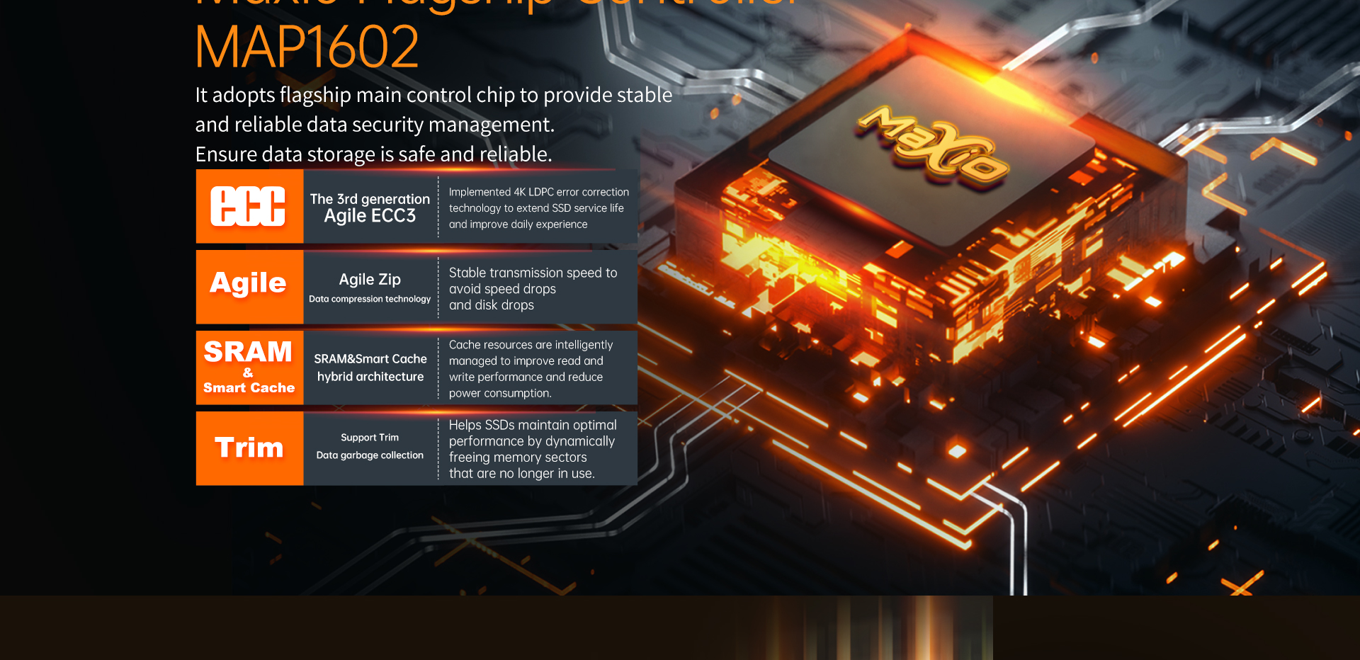 [Maxio Flagship Controller MAP1602] The high-performance main control chip features Agie ECC for enhanced data correction, SRAM-based cache for faster access, and Trim support for long-term storage optimization, delivering reliable and secure data handling.