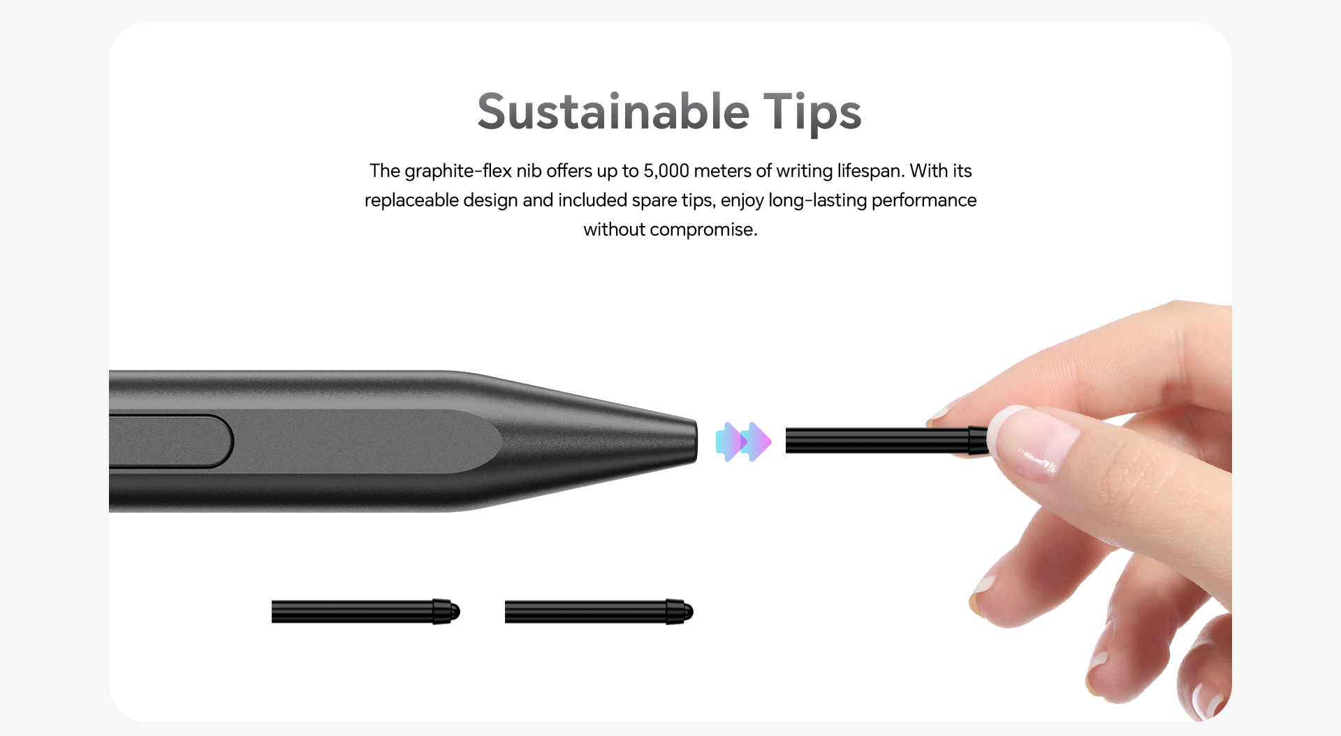 [Sustainable, Replaceable Tips] Equipped with a graphite-flex nib offering up to 5,000 meters of writing lifespan, the T-Pen includes replaceable tips for long-term use without sacrificing performance or precision.