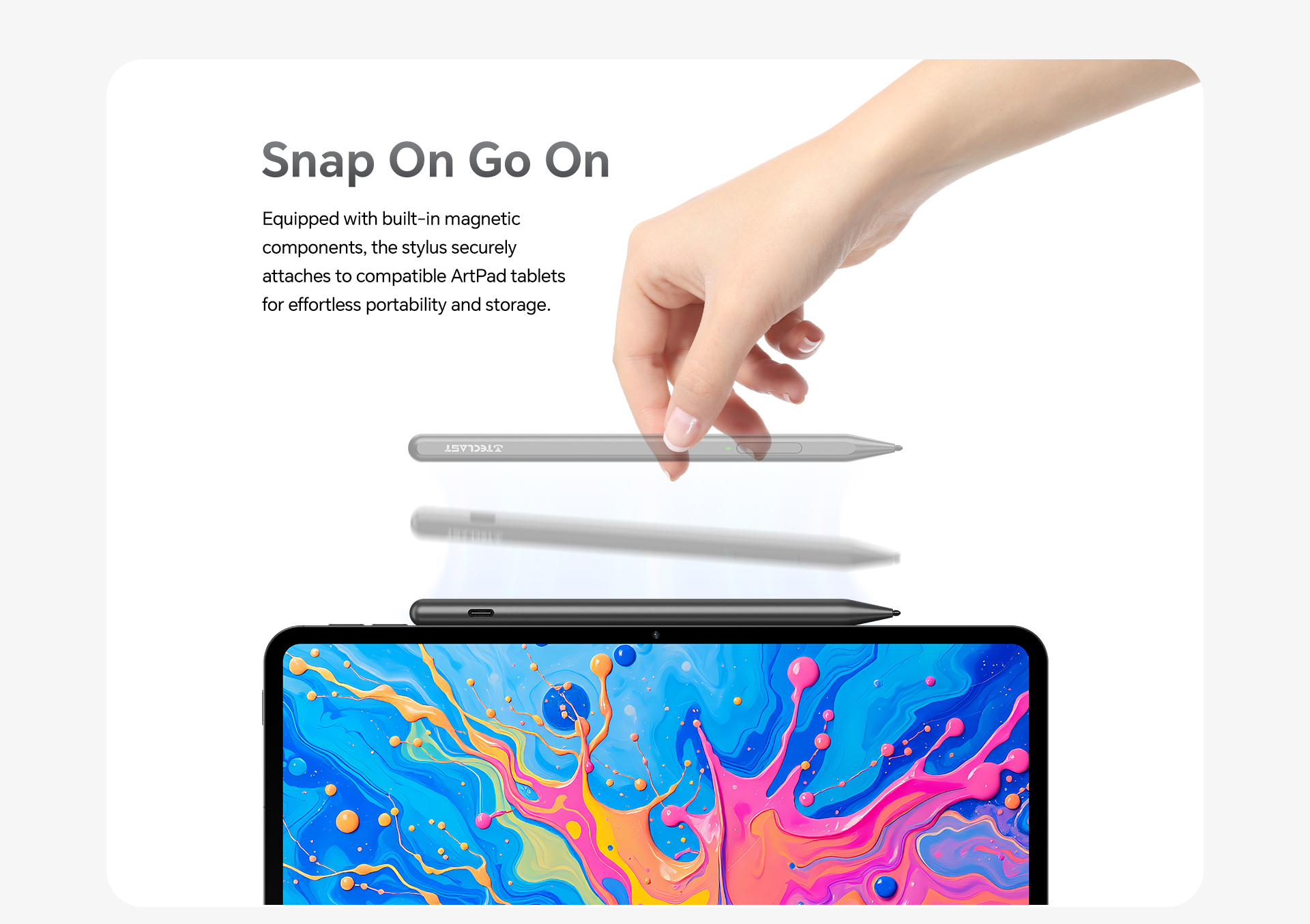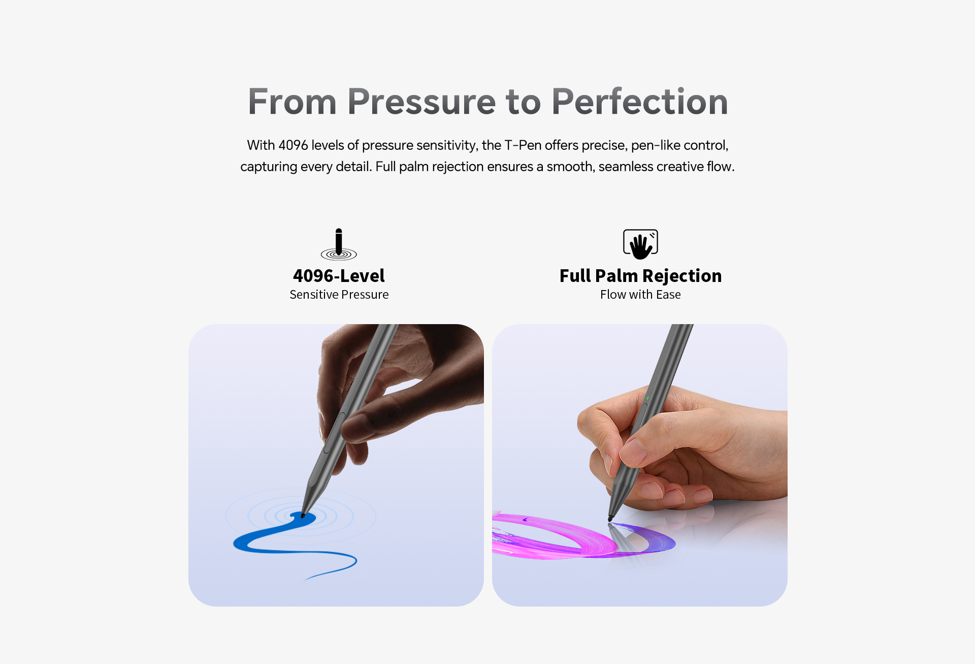 [Global Palm Rejection] Rest your hand comfortably on the screen while you work. The T-Pen intelligently ignores accidental palm touches for uninterrupted creativity.