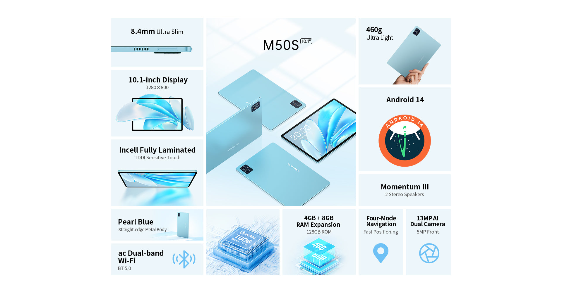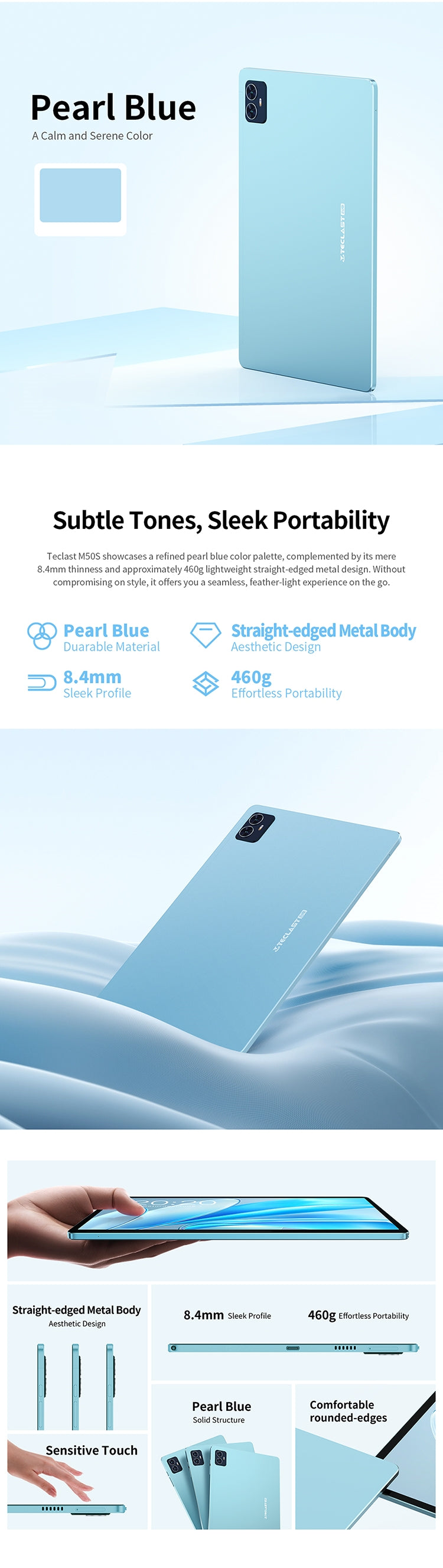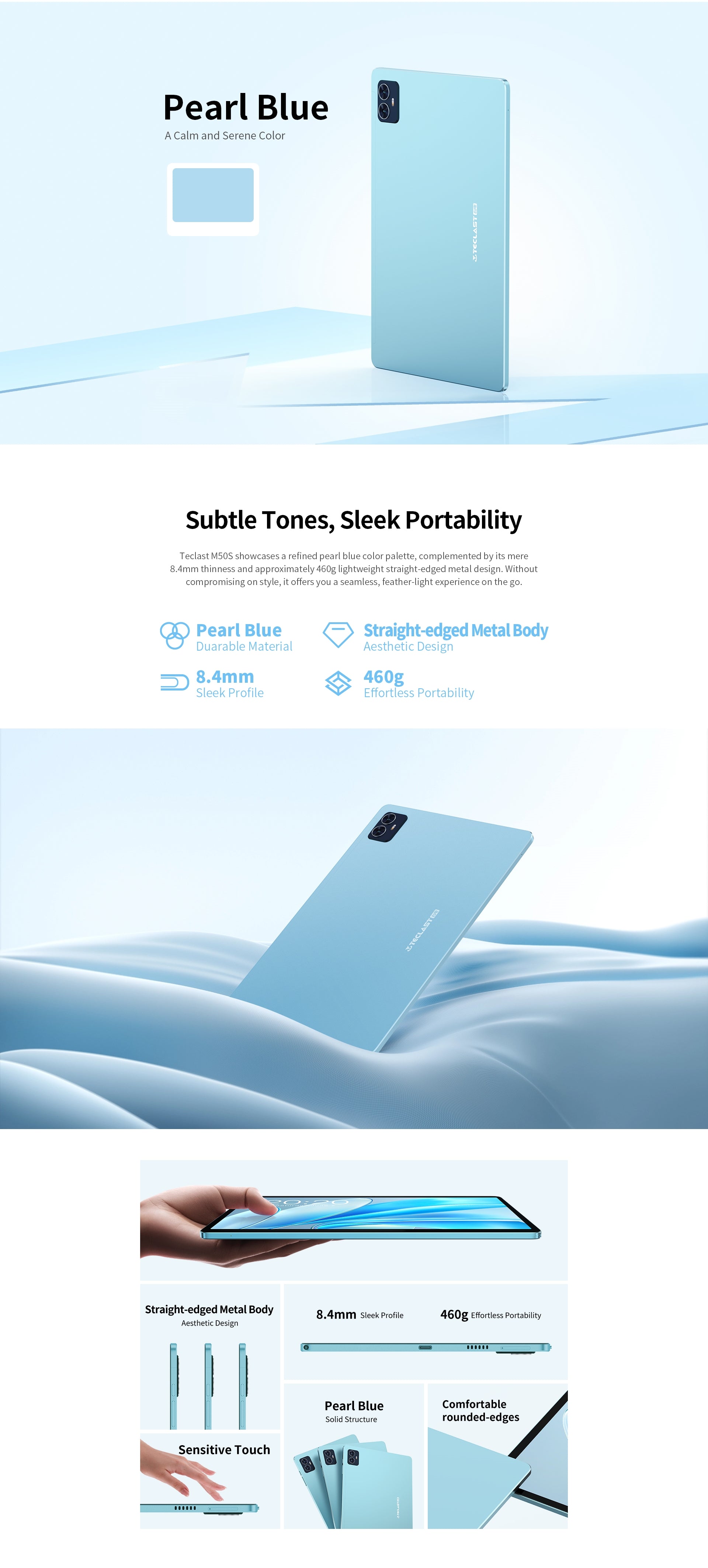[Pearl Blue Design] Der M50S hat einen „Pearl Blue“-Farbton, ein schlankes 8,4-mm-Profil und wiegt nur 460 g. Dank seiner kompakten und federleichten Form ist es bequem zu tragen, sodass Sie unterwegs arbeiten oder spielen können.