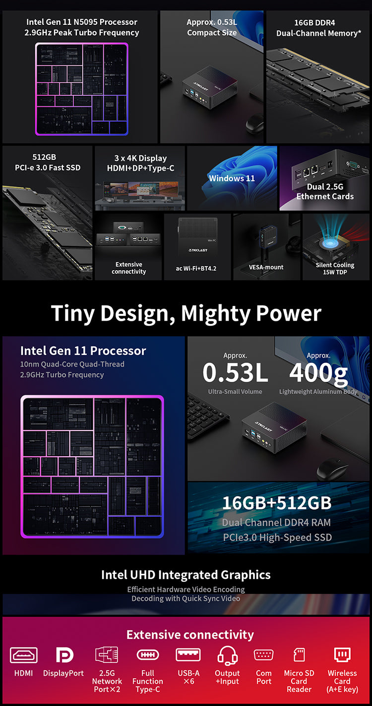 [Powerful CPU] The heart of N15 is the innovative 10nm process N5095 processor, based on Intel's 11th generation Jasper Lake architecture. This quad-core, quad-thread design offers a peak turbo frequency reaching an impressive 2.9GHz and 4MB high-speed cache, smooth multitasking.