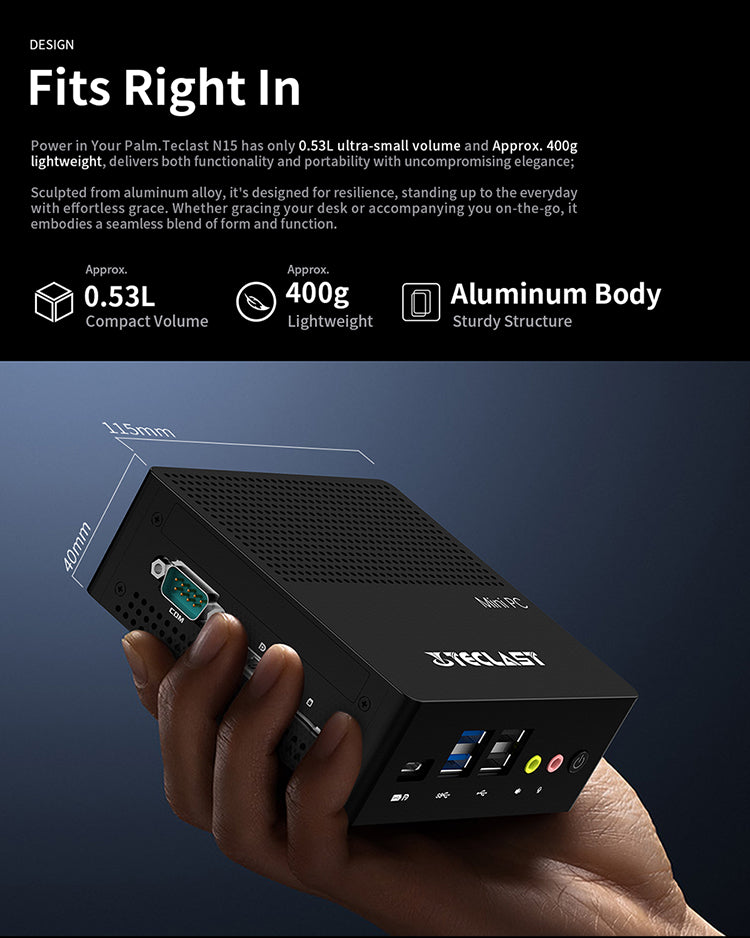 [Lightweight & Portable] N15 defines elegance and portability in its ultra-compact 0.53L volume and lightweight design of approximately 400g. Crafted from durable aluminum alloy, it's designed for resilience and is suitable for a wide range of applications.
