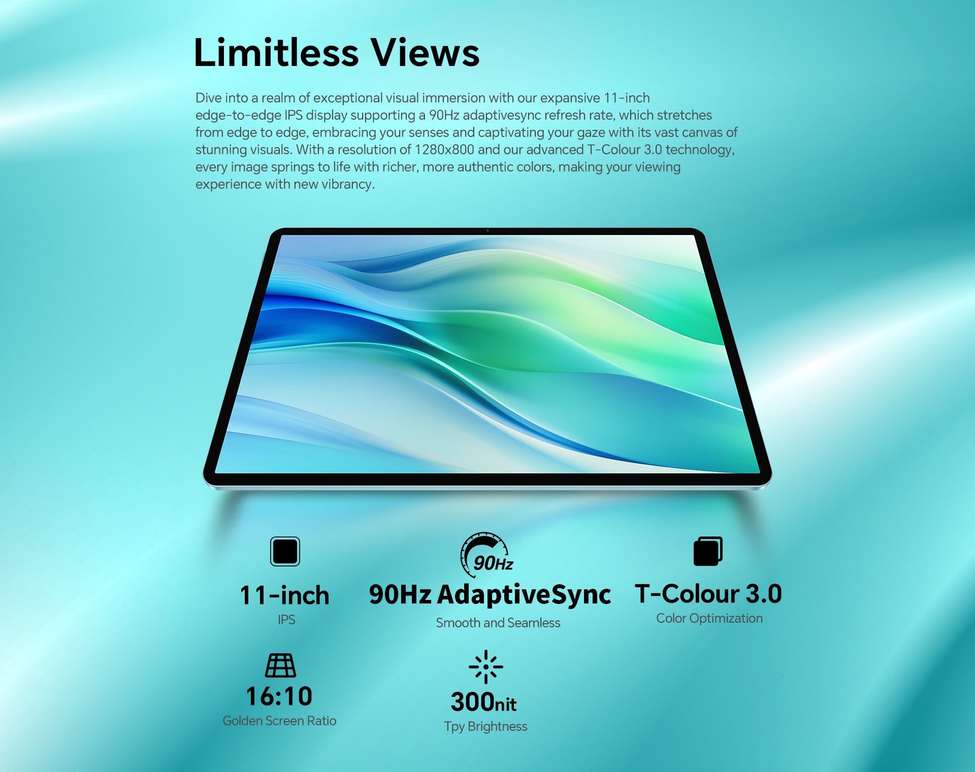 [11-Zoll-Display mit Augenkomfort] Dieses Tablet bietet einen 11-Zoll-Bildschirm mit einem Seitenverhältnis von 16:10 und einer Auflösung von 1280 x 800 sowie einer Bildwiederholfrequenz von 90 Hz. Es ist vom TÜV Rheinland zertifiziert und sorgt für minimale Augenbelastung bei längeren Betrachtungssitzungen.