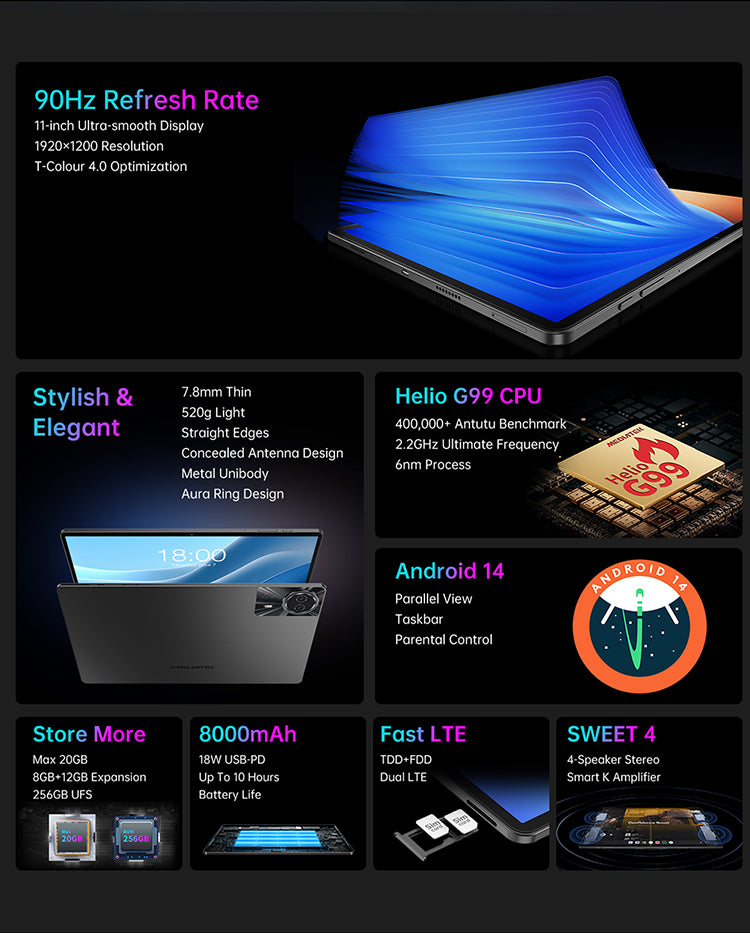 [Kompaktes und robustes Design] Mit einem Gewicht von nur 520g und einer schlanken Dicke von 7,8 mm ist dieses Tablet dank seines CNC-gefrästen Aluminiumgehäuses für den mobilen Einsatz ohne Einbußen bei der Stabilität konzipiert sandgestrahlte Oberfläche.