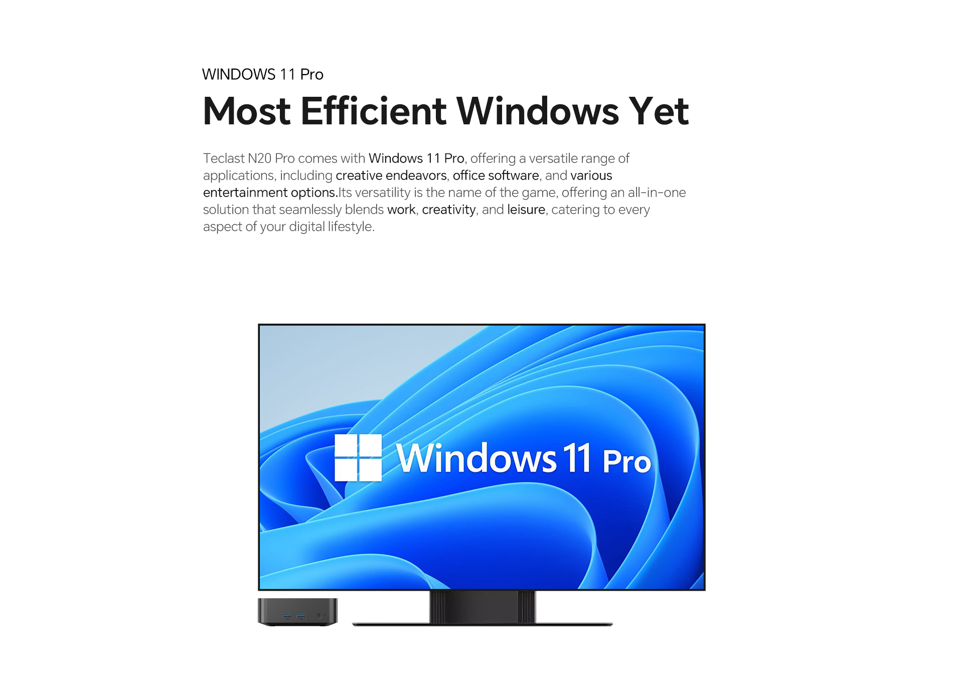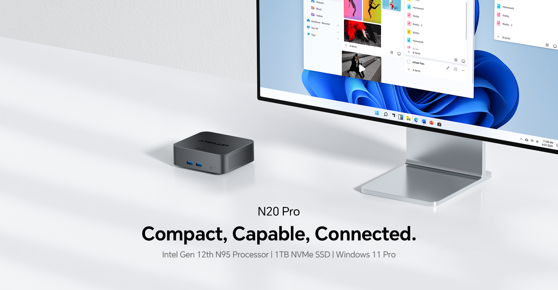 [Windows 11 Pro Enabled] The N20 Pro runs Windows 11 Pro, offering a versatile range of applications, including creative endeavors, office software, and various entertainment options.