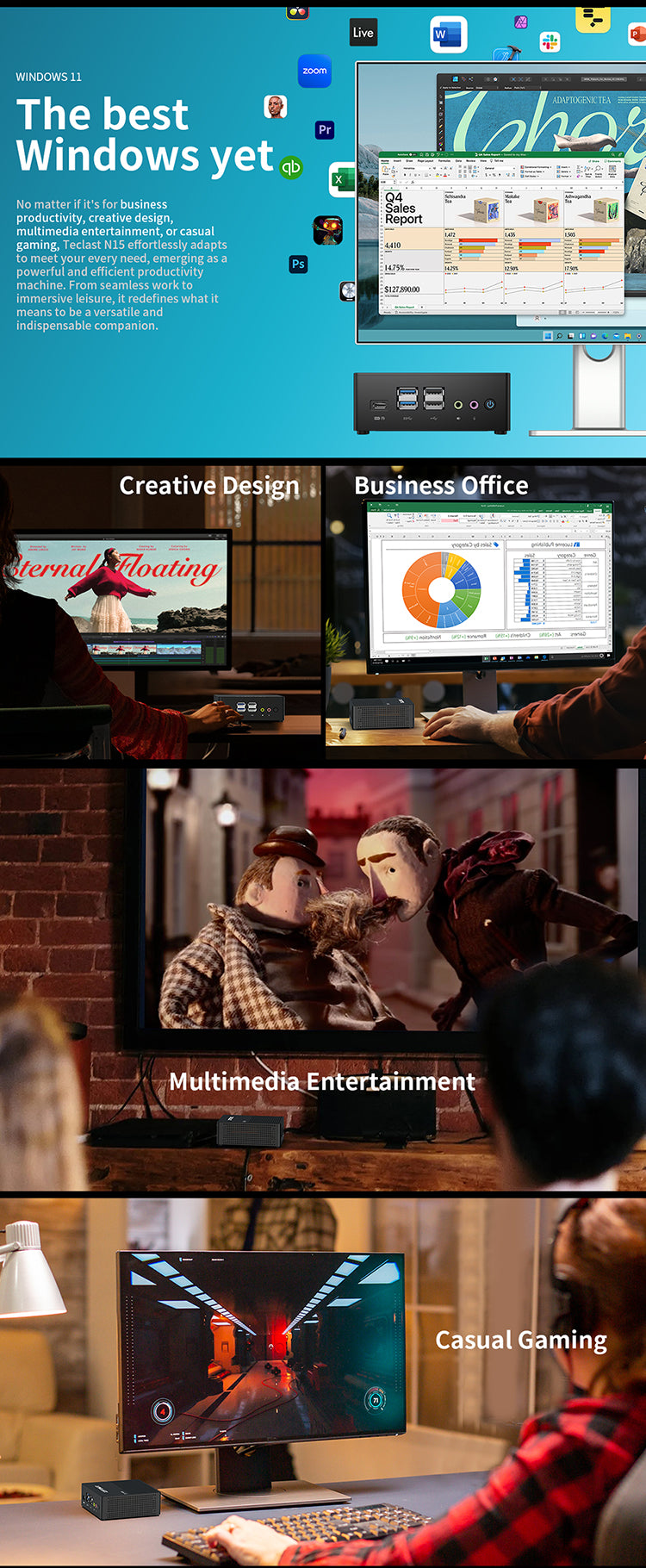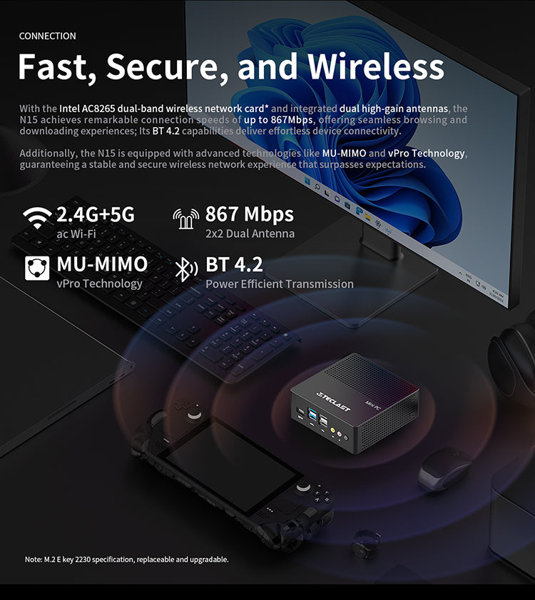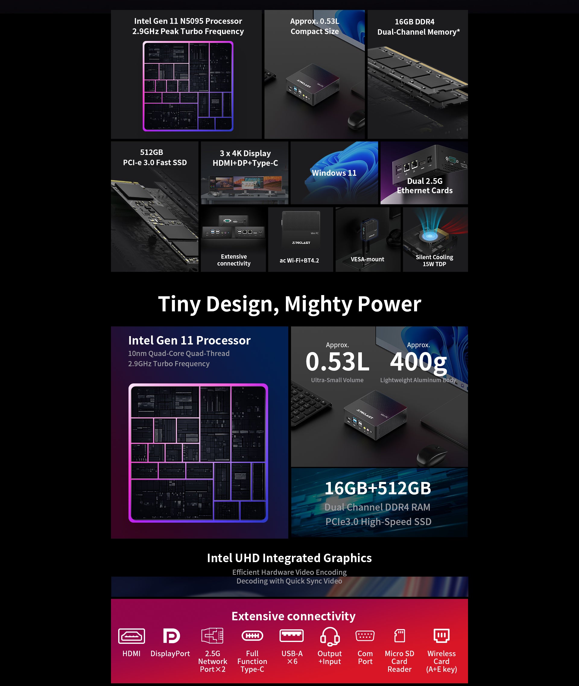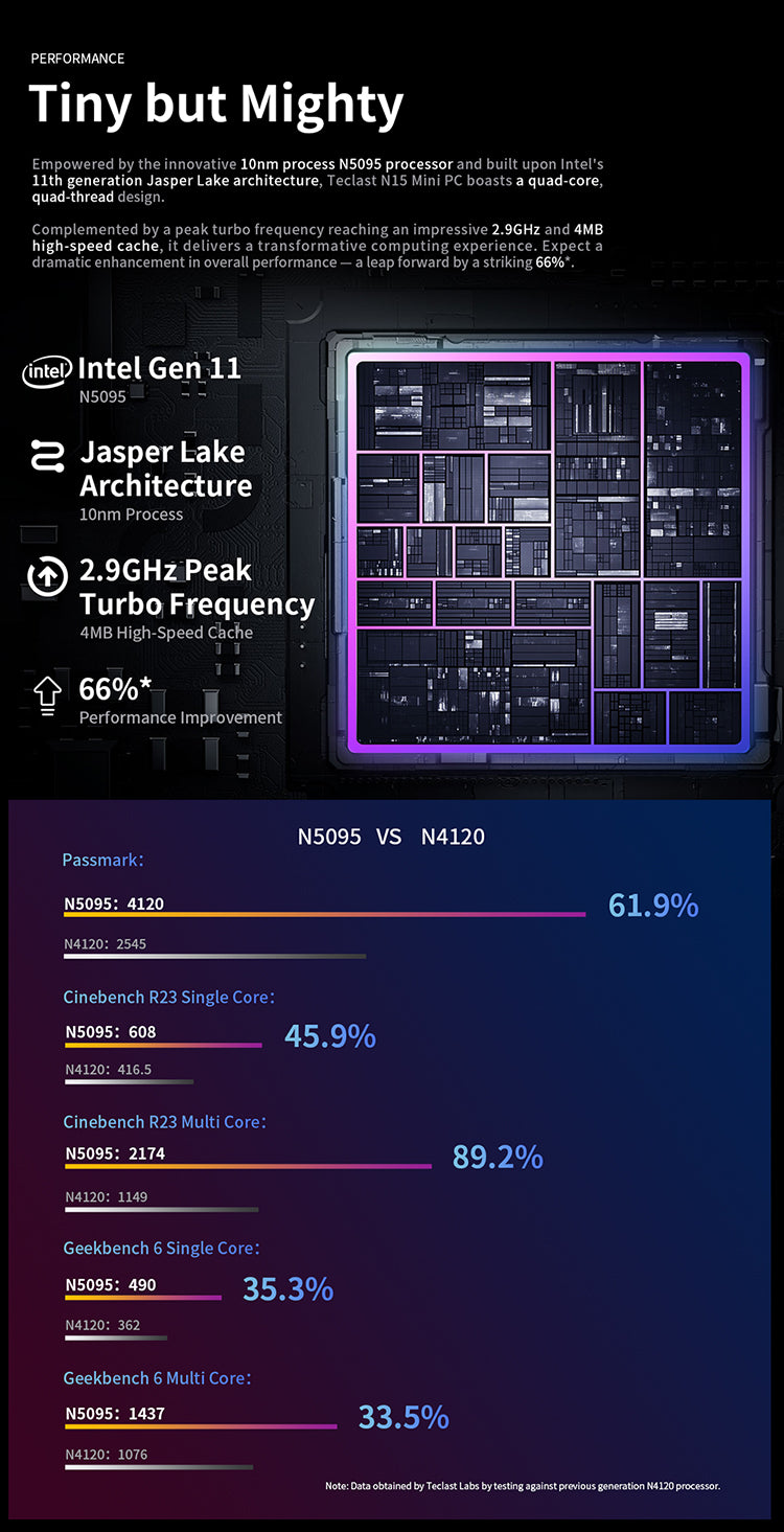 [Powerful CPU] The heart of N15 is the innovative 10nm process N5095 processor, based on Intel's 11th generation Jasper Lake architecture. This quad-core, quad-thread design offers a peak turbo frequency reaching an impressive 2.9GHz and 4MB high-speed cache, smooth multitasking.