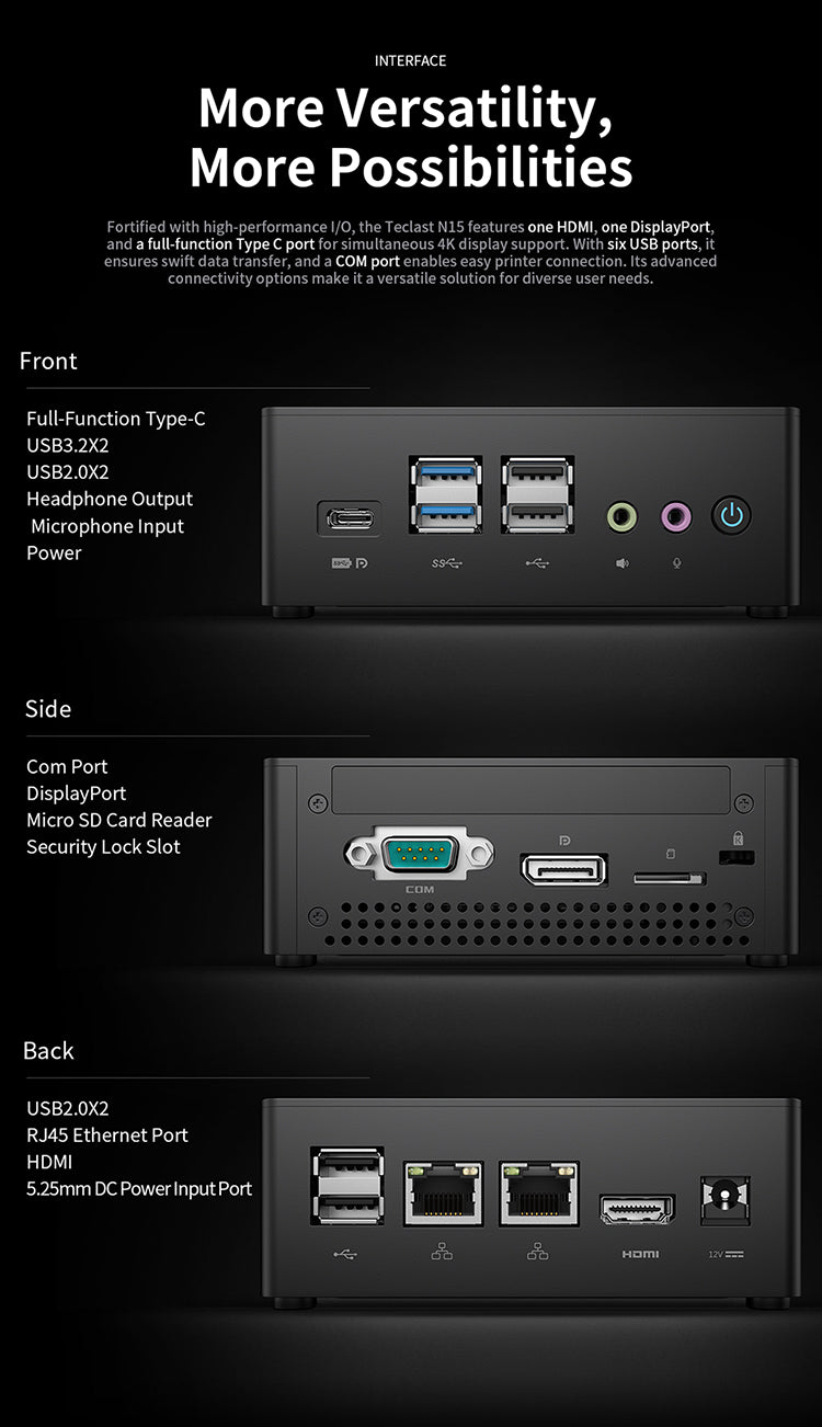 [Ultimate Interface Collection] N15 is equipped with one HDMI, one DisplayPort, a full-function Type C port for 4K display support, and six USB ports for swift data transfer. A COM port enables easy printer connection, making it a perfect fit for any computer.