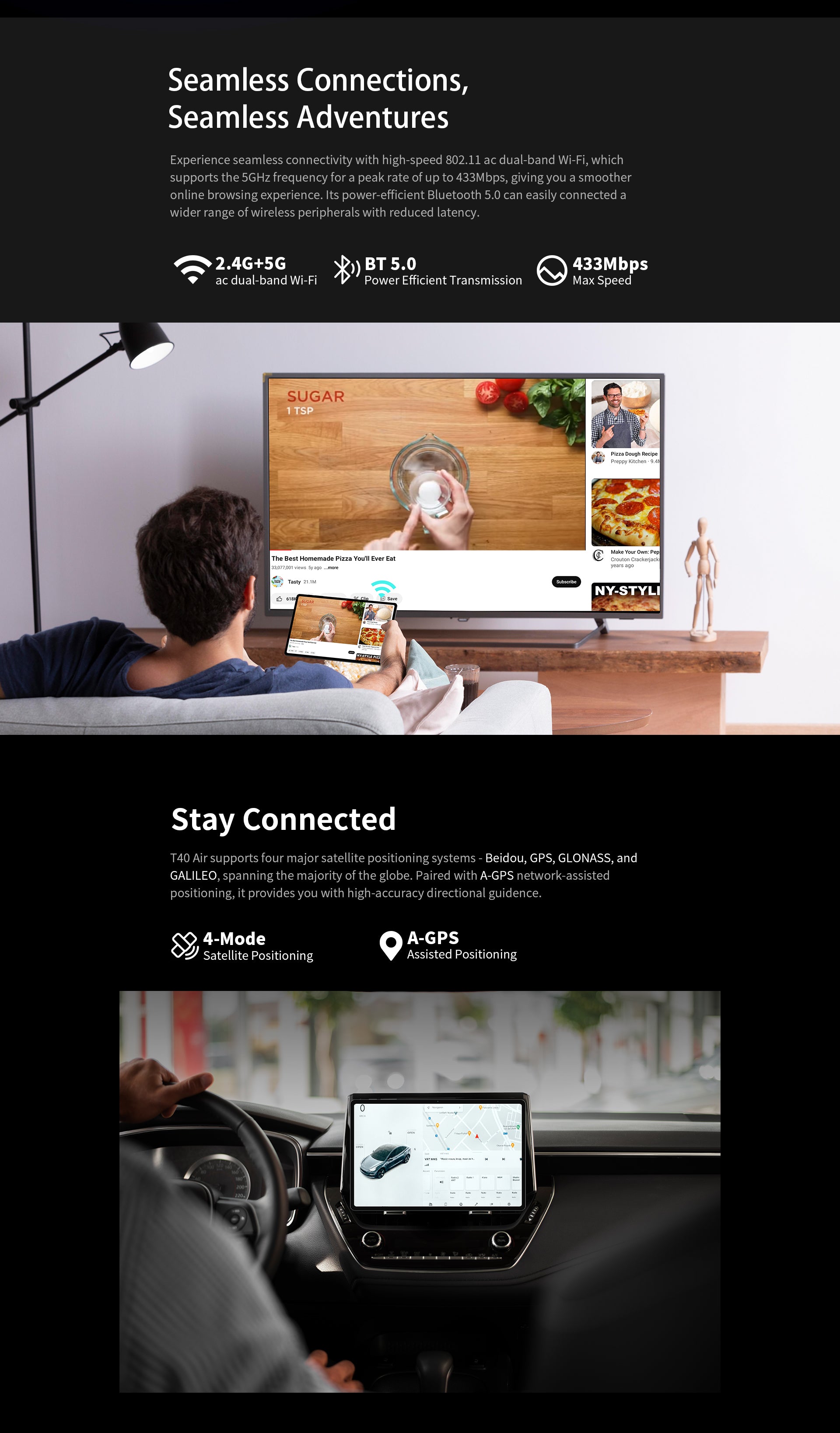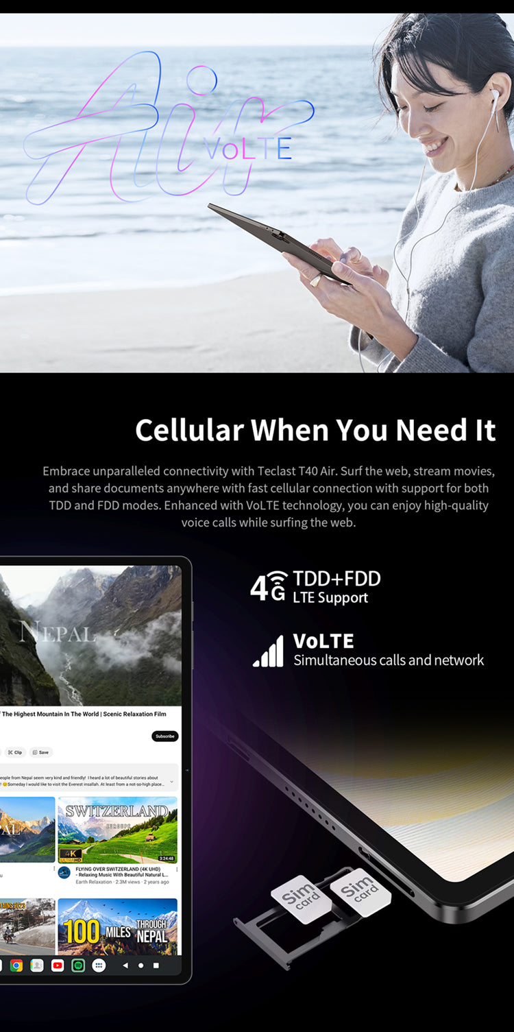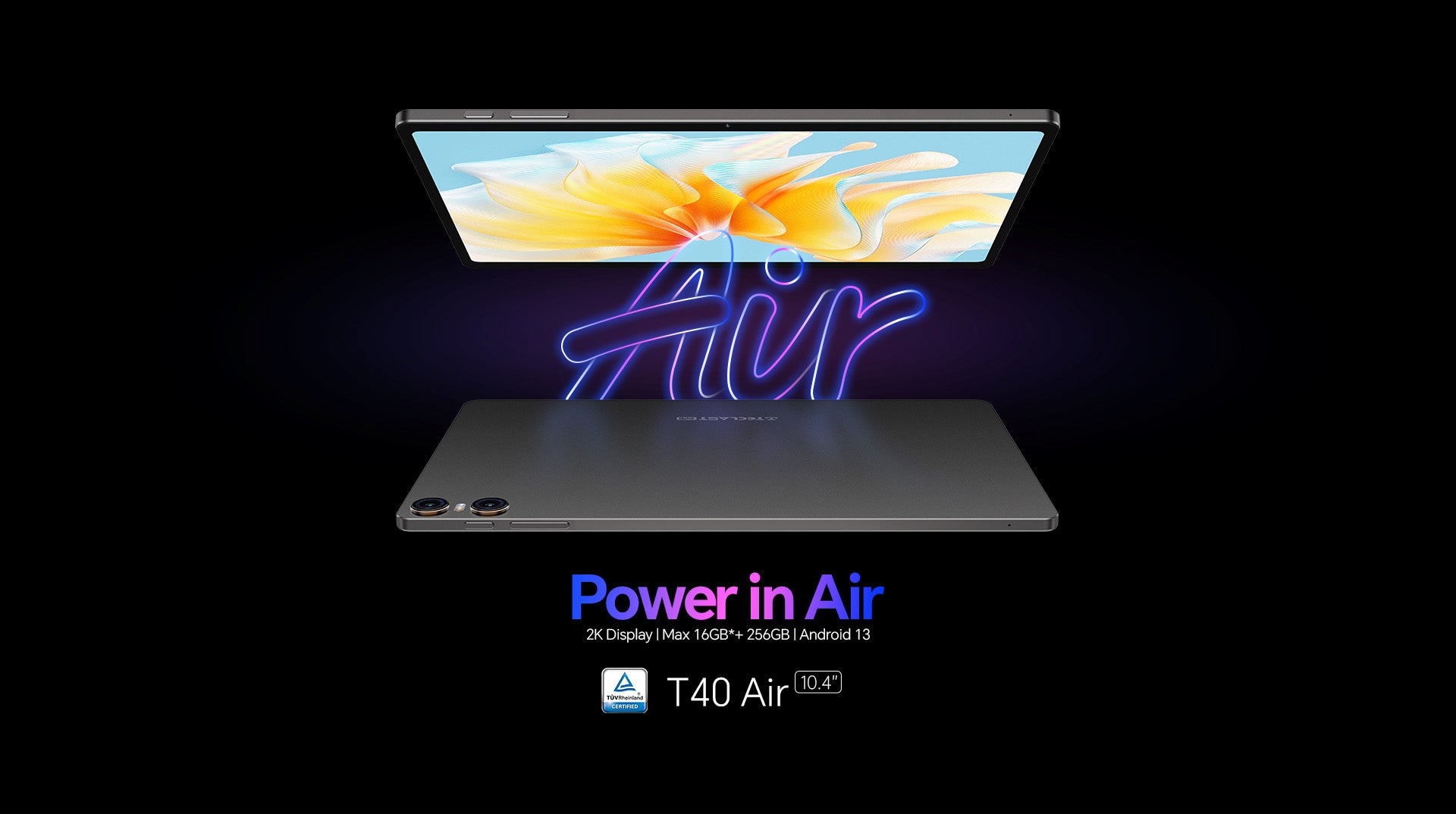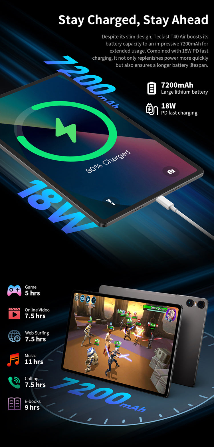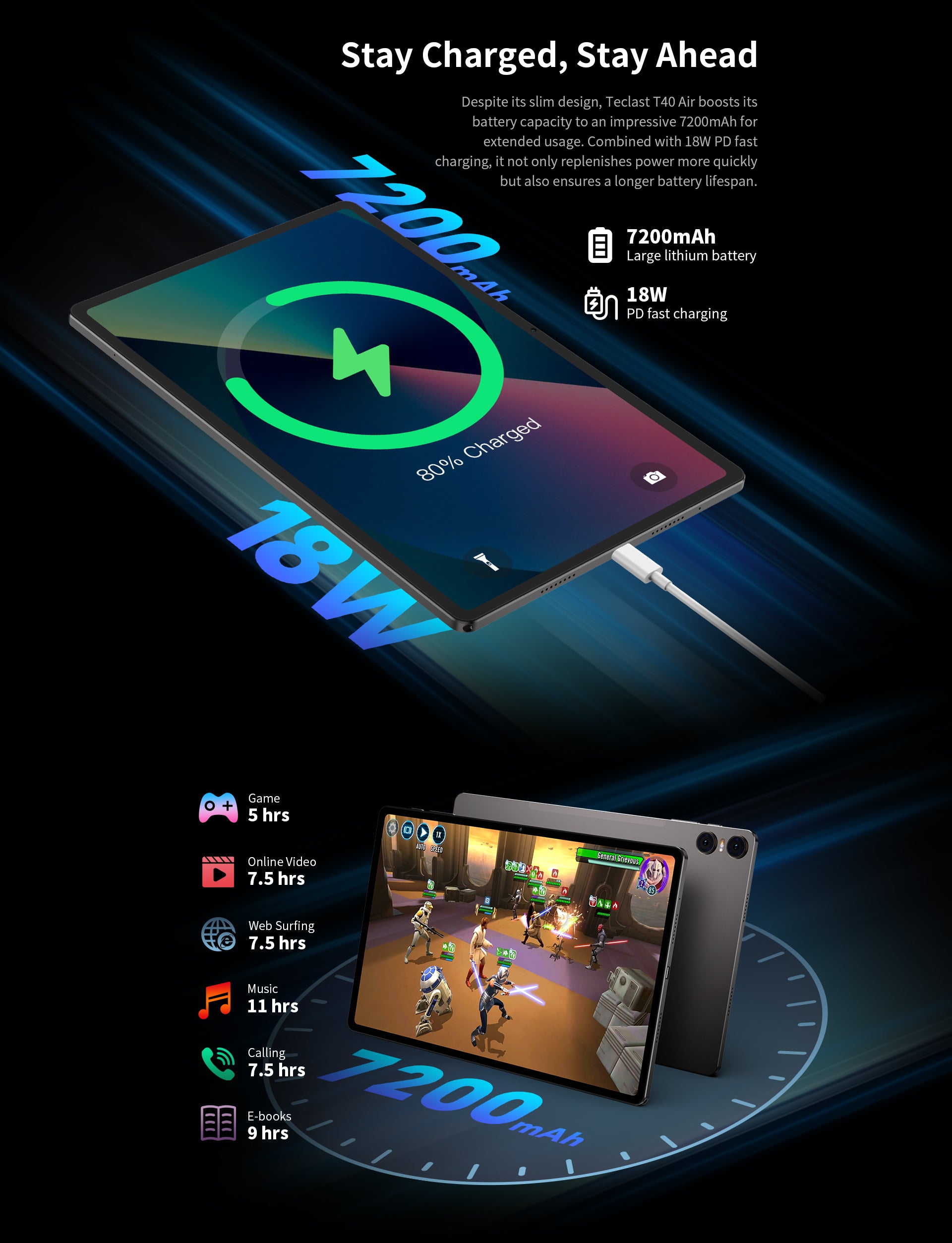 - [Air in Big Power] Disfruta del rendimiento durante todo el día y de una recarga rápida con la batería de 7200 mAh del T40 Air y la carga rápida PD de 18 W.