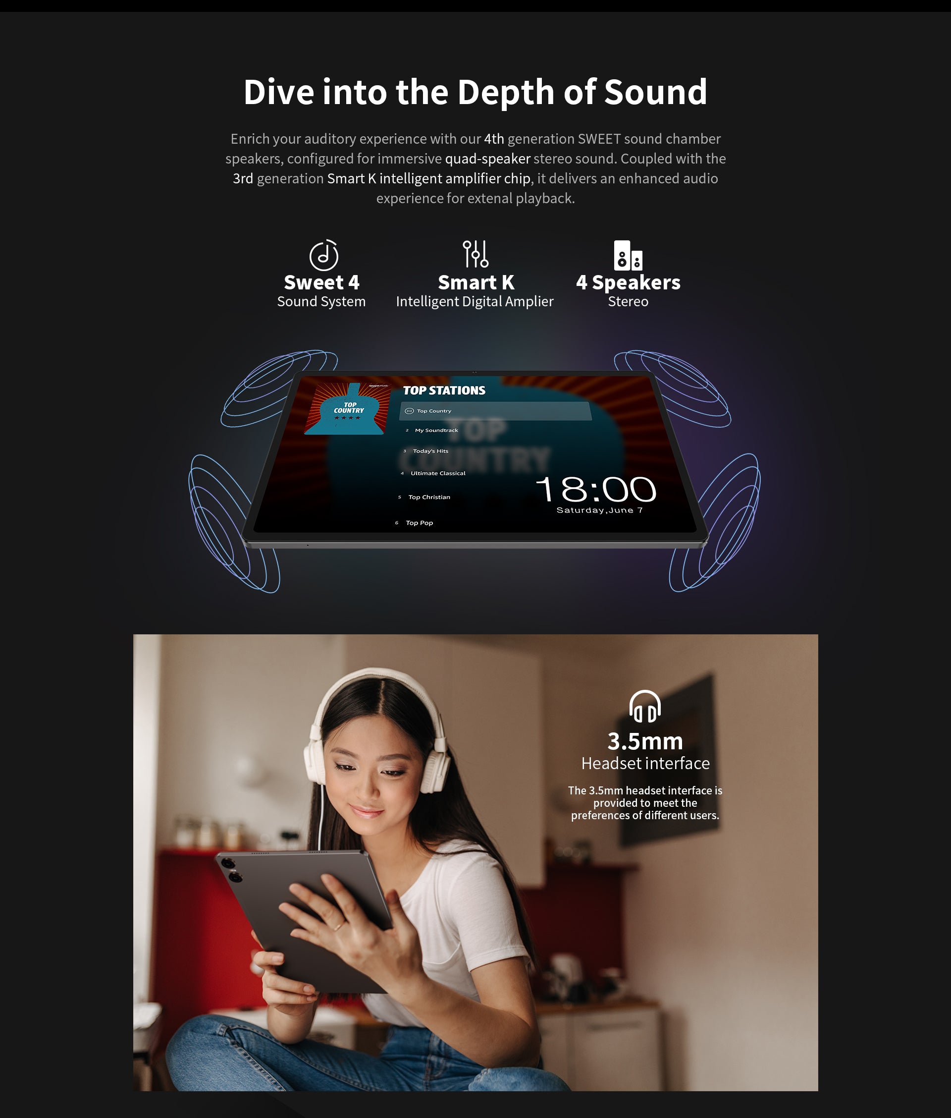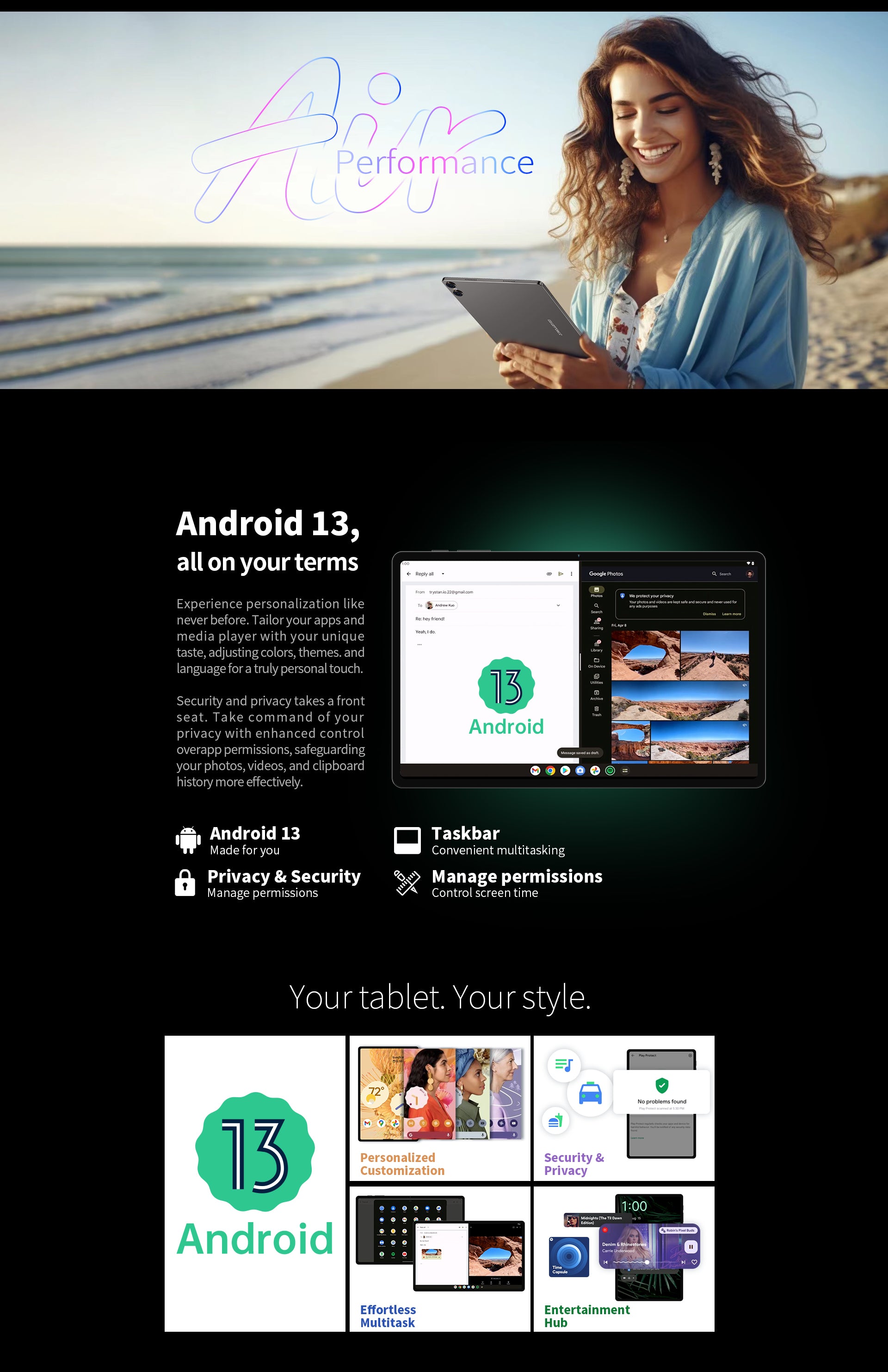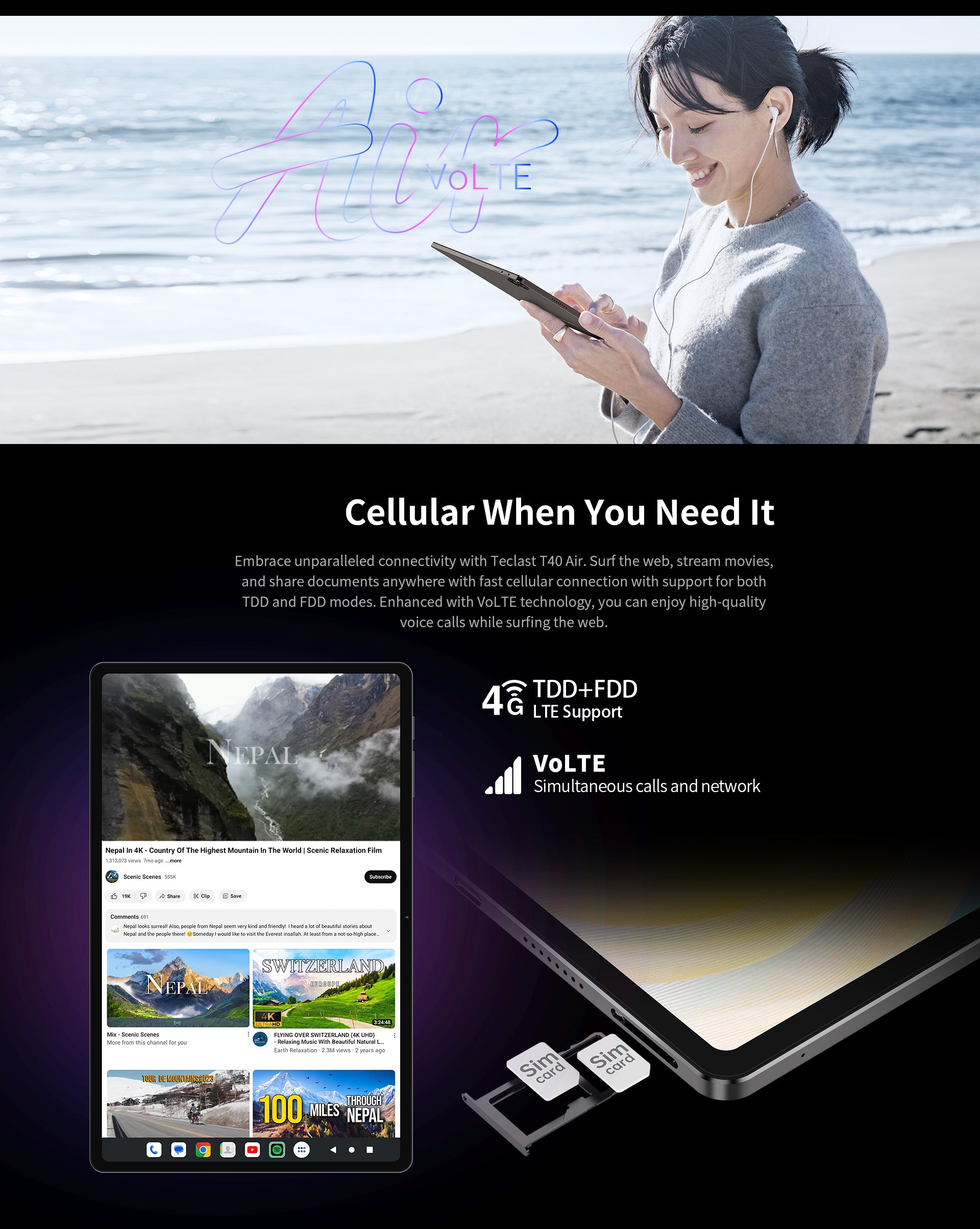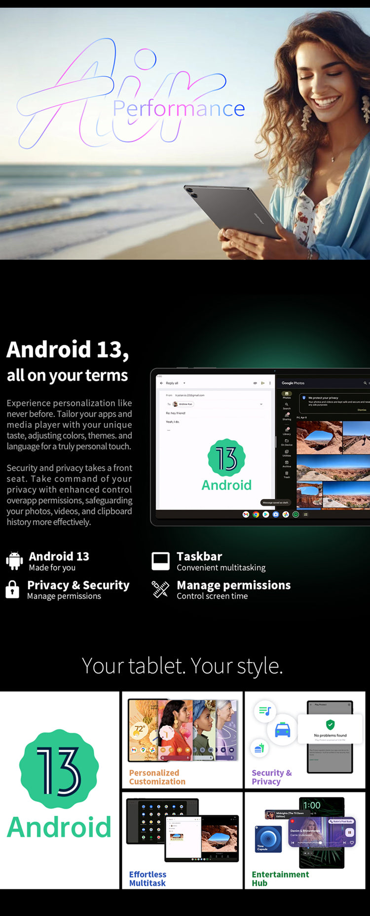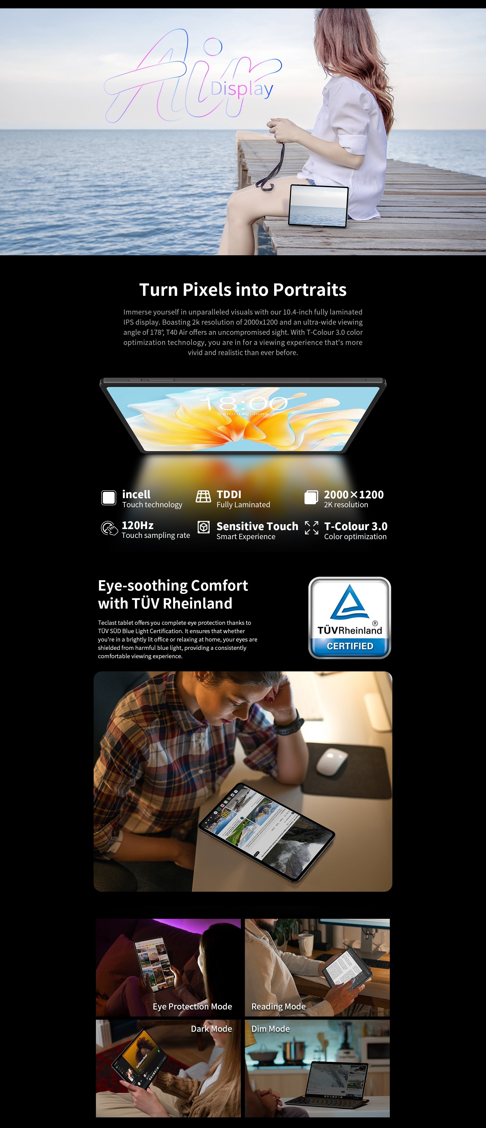 - [Air en Android 14] Con Android 14, la tableta T40 Air ofrece una vista paralela mejorada en formato horizontal, una práctica barra de tareas para realizar múltiples tareas de manera eficiente y sólidas opciones de control parental para un uso seguro.