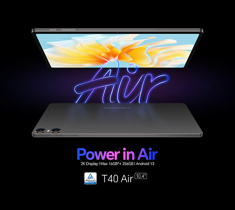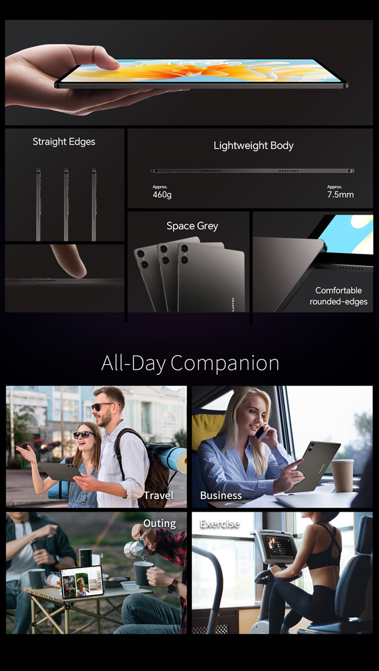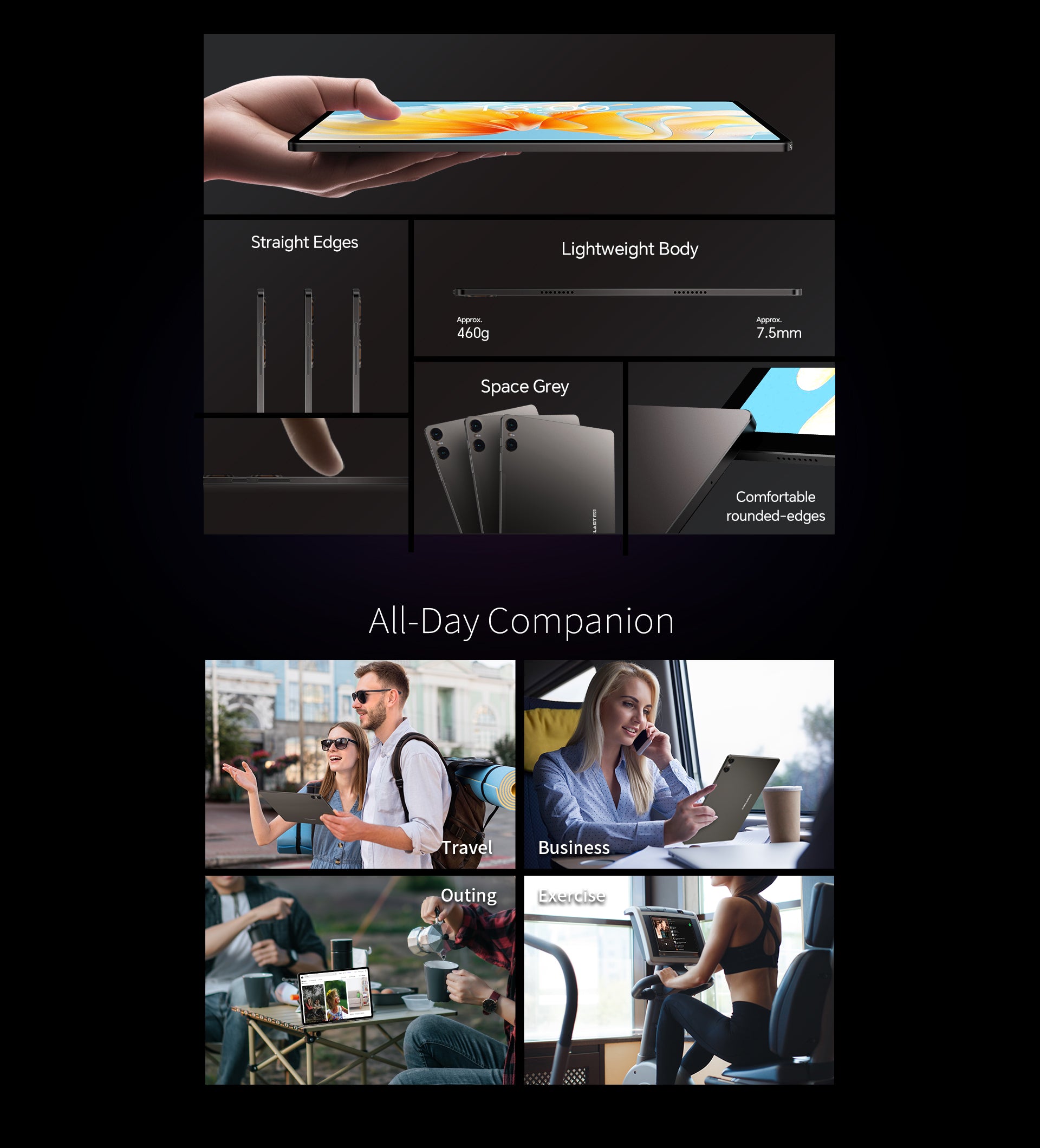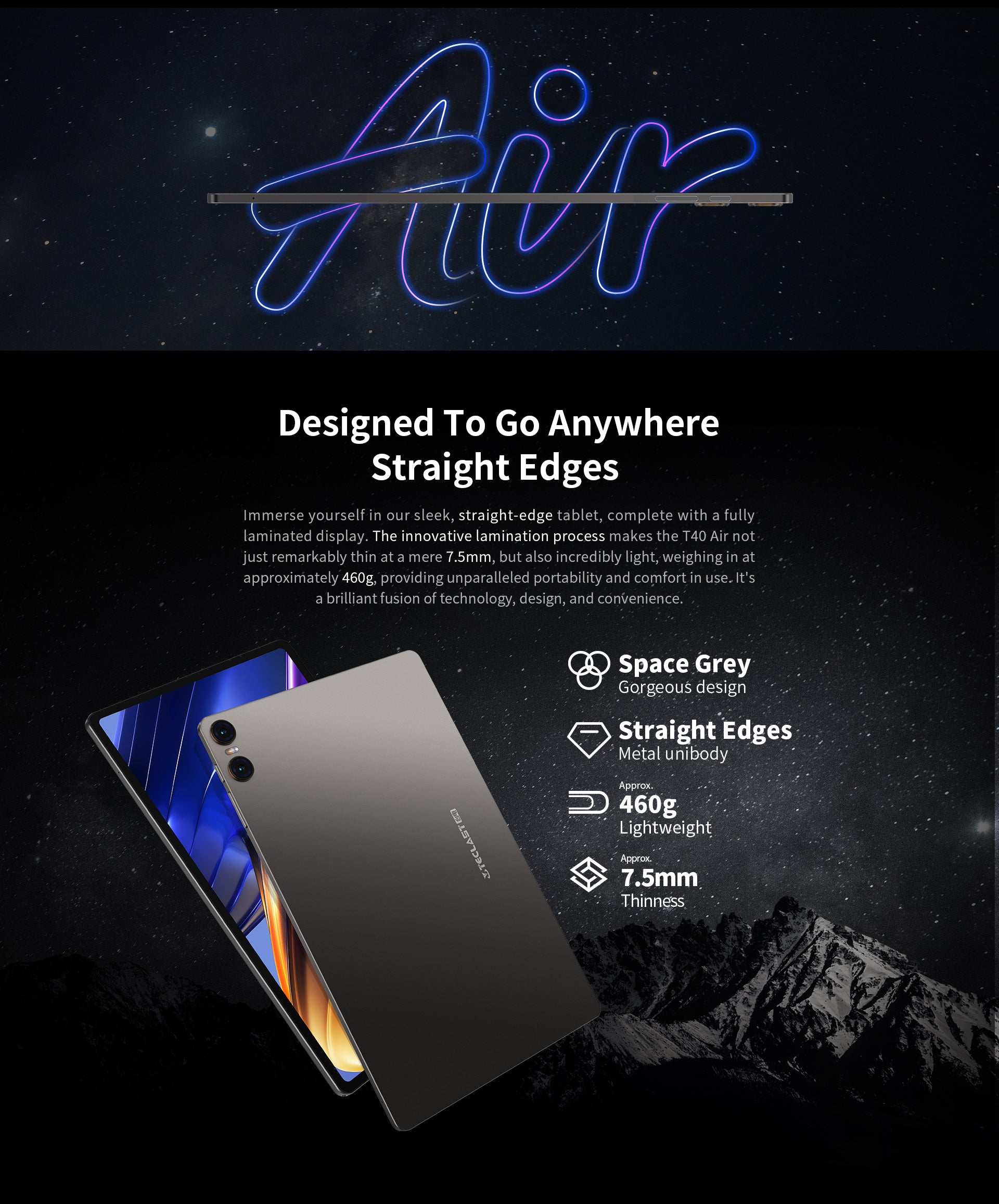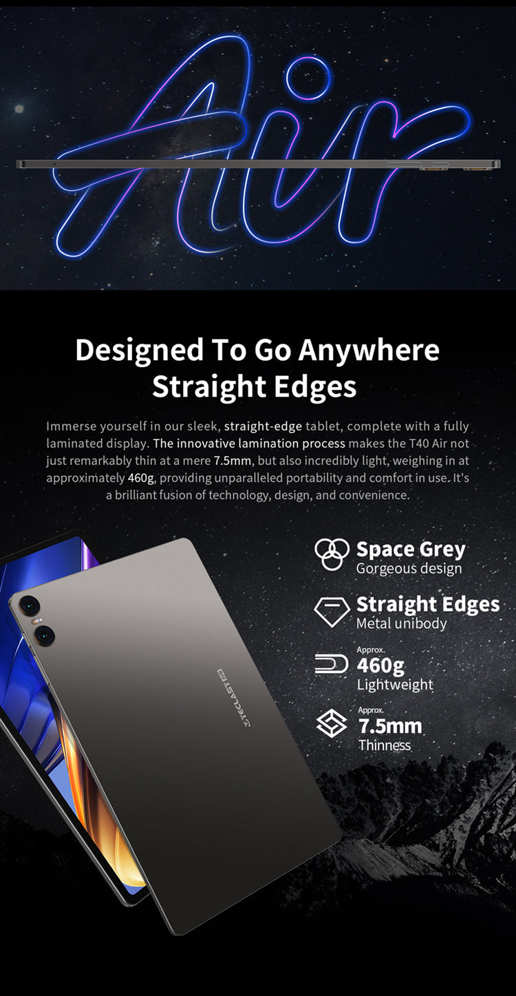 - [Aire en bordes rectos] Redefina la movilidad con la tableta T40 Air: un elegante acabado en gris espacial, bordes rectos, 7,5 mm de grosor, 460 g de peso y rendimiento pesado.