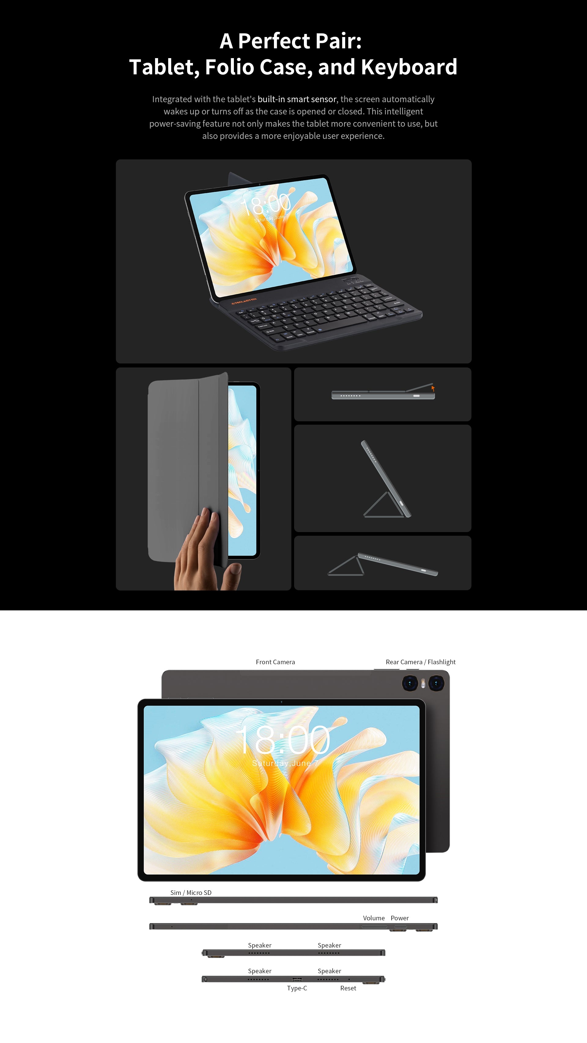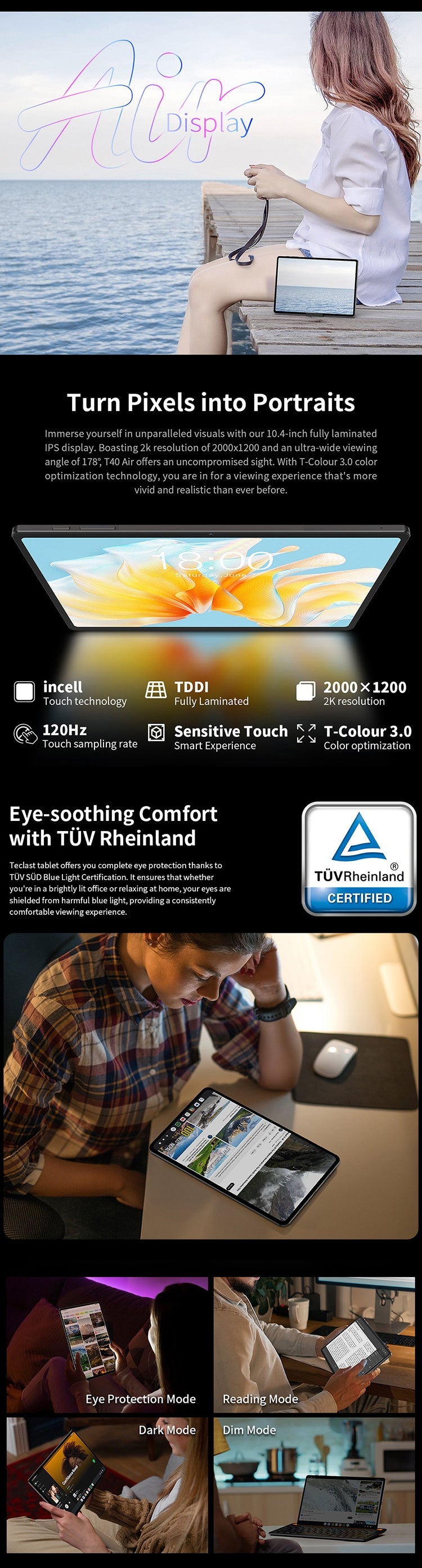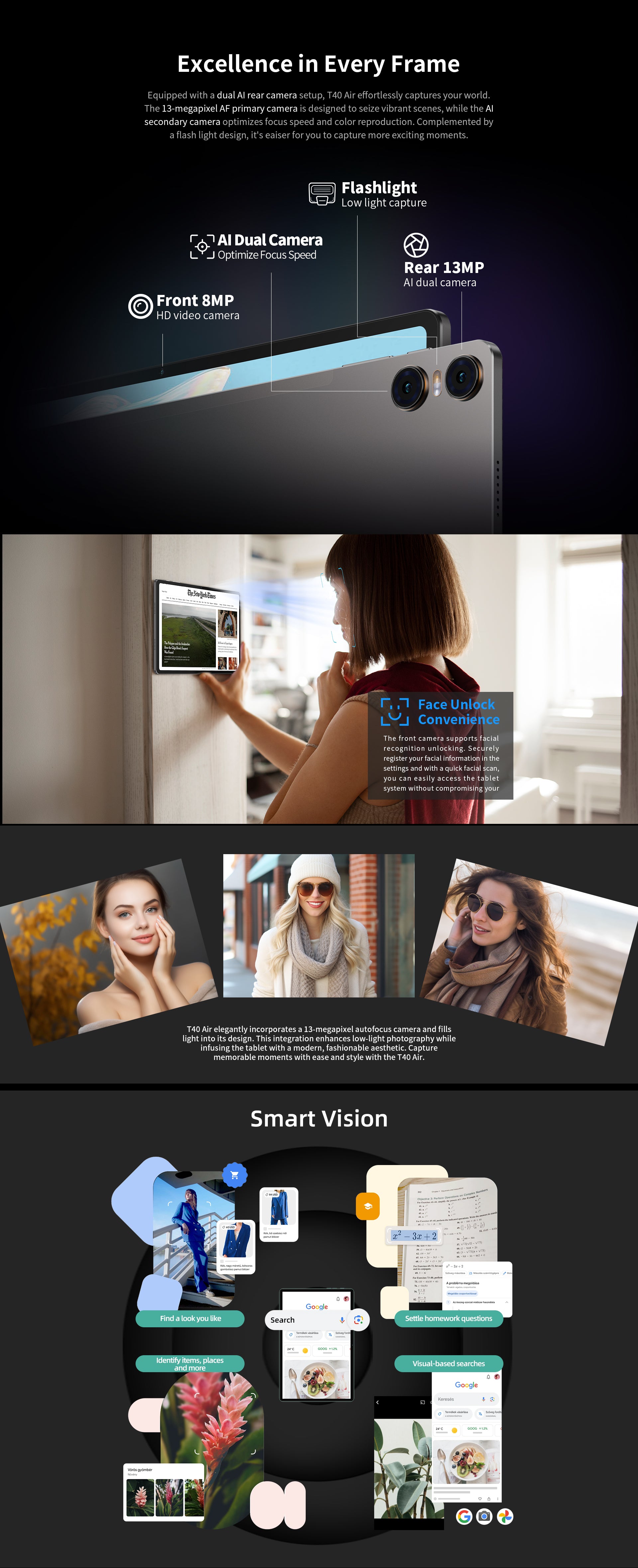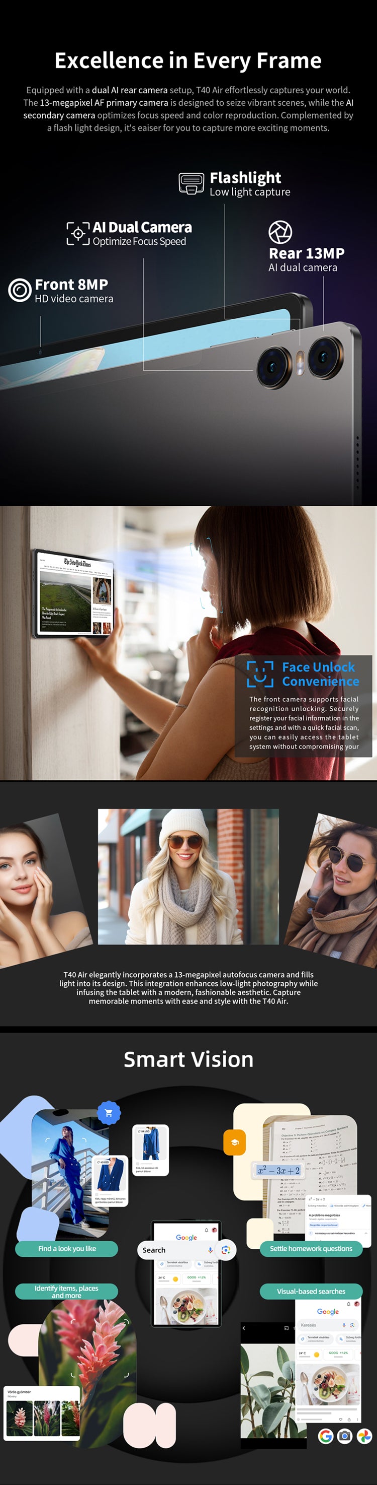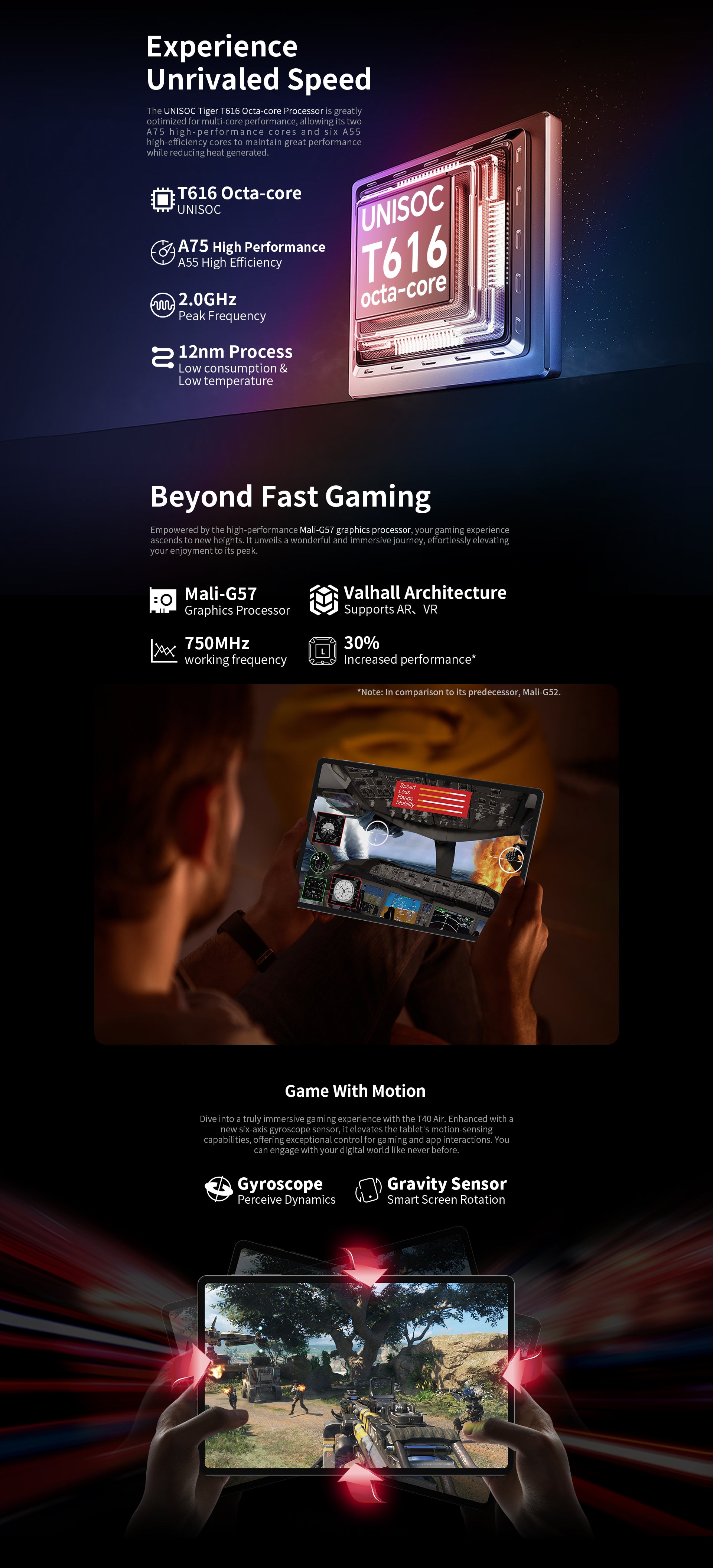- [Aire en bordes rectos] Redefina la movilidad con la tableta T40 Air: un elegante acabado en gris espacial, bordes rectos, 7,5 mm de grosor, 460 g de peso y rendimiento pesado.