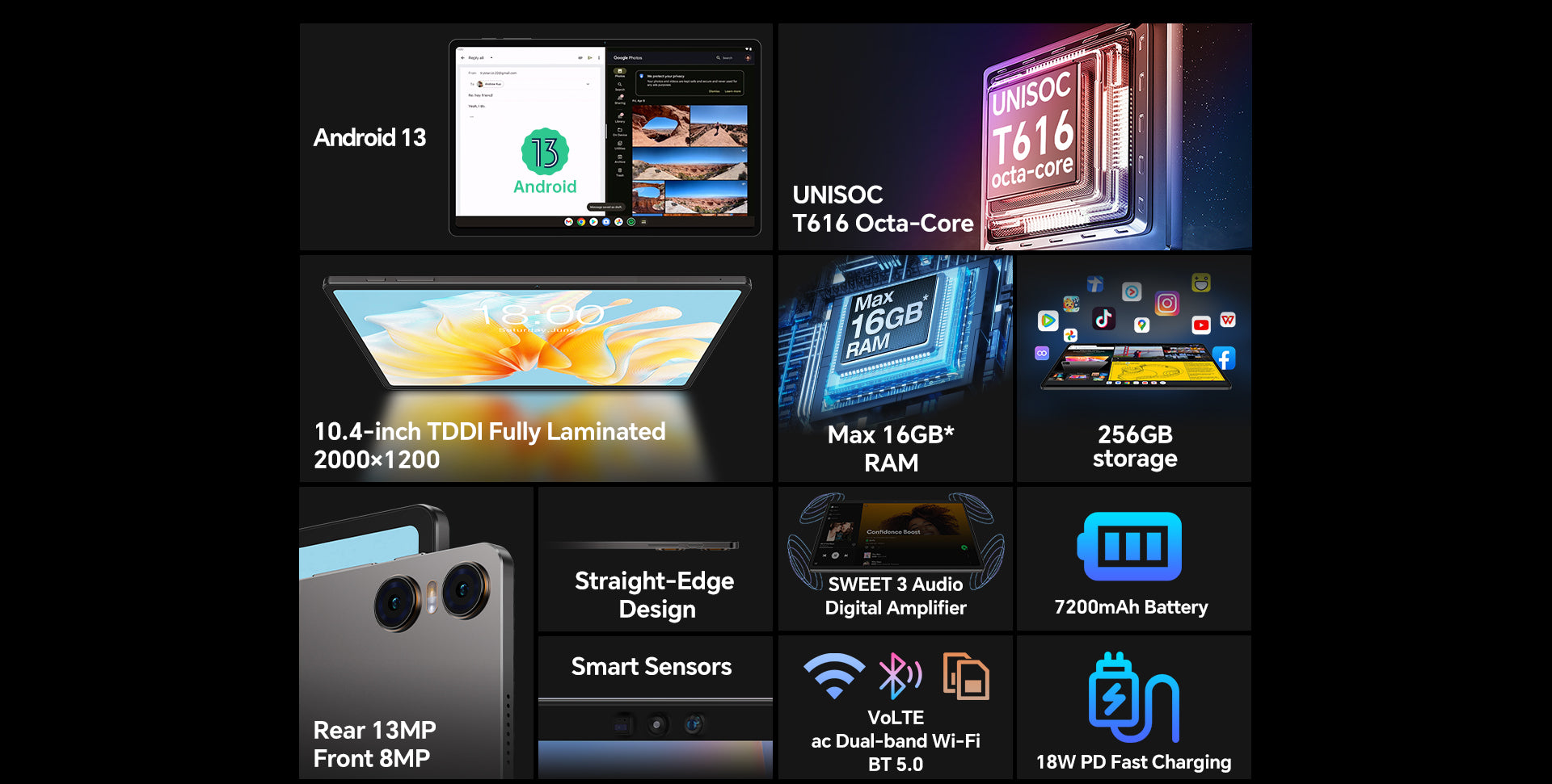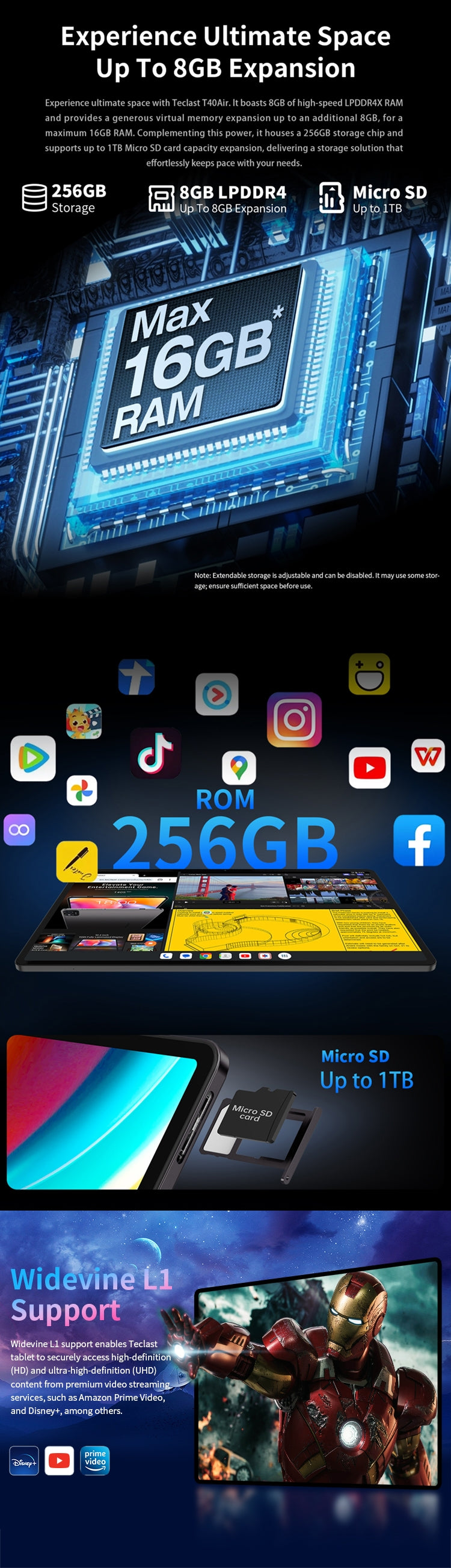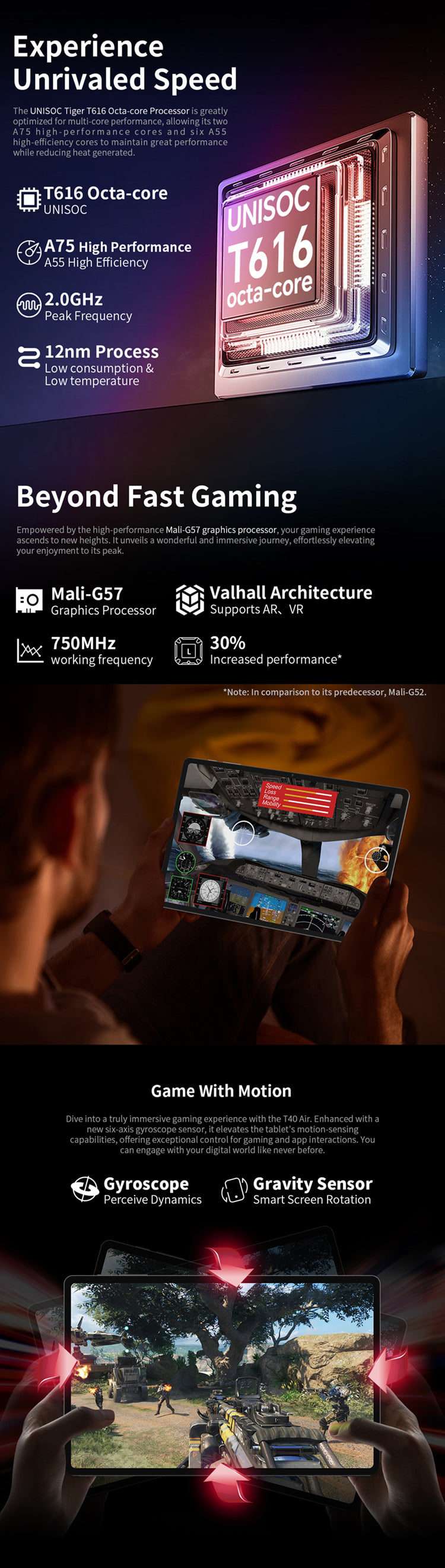 - [Air in Unisoc T616] Desarrollado por un procesador Unisoc T616 Octa-core y GPU Mali-G57 a 750 MHz, 8 GB de RAM + 8 GB de expansión y 256 GB de almacenamiento (ampliable a 1 TB mediante Micro SD) para realizar múltiples tareas , almacenamiento y juegos.