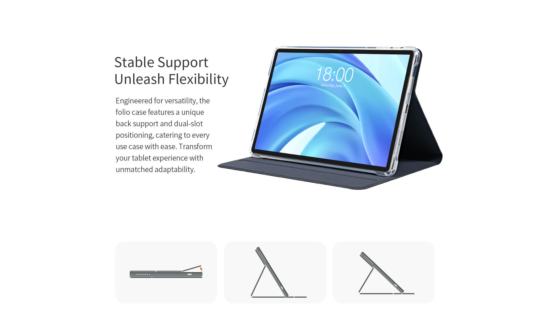 La cubierta frontal se puede usar como un soporte triple para bloquear de forma segura su tableta en diferentes ángulos para una lectura, visualización y lectura óptimas. experiencia mecanográfica.