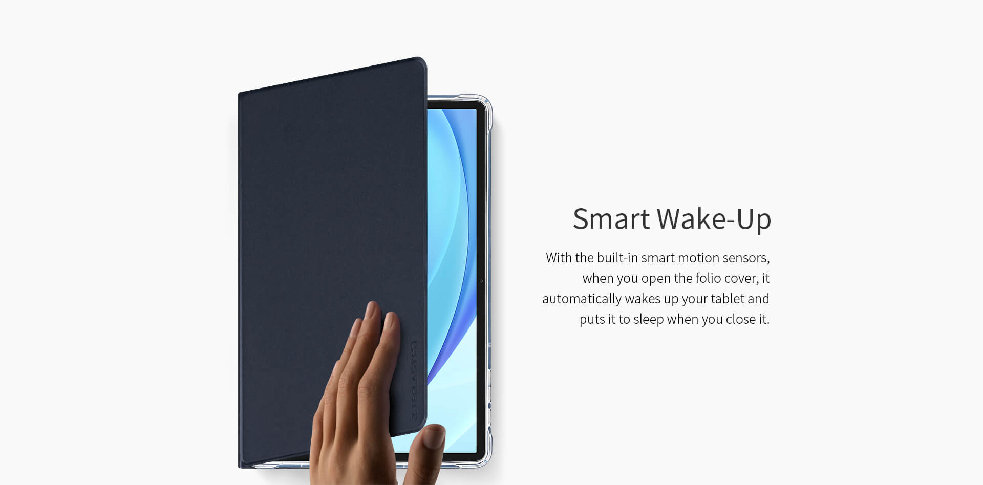 Con los sensores de movimiento inteligentes incorporados, cuando abres la cubierta tipo folio, automáticamente activa tu tableta y la pone en modo de suspensión cuando la cierras.