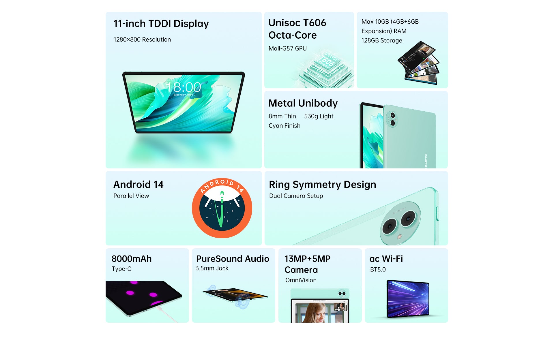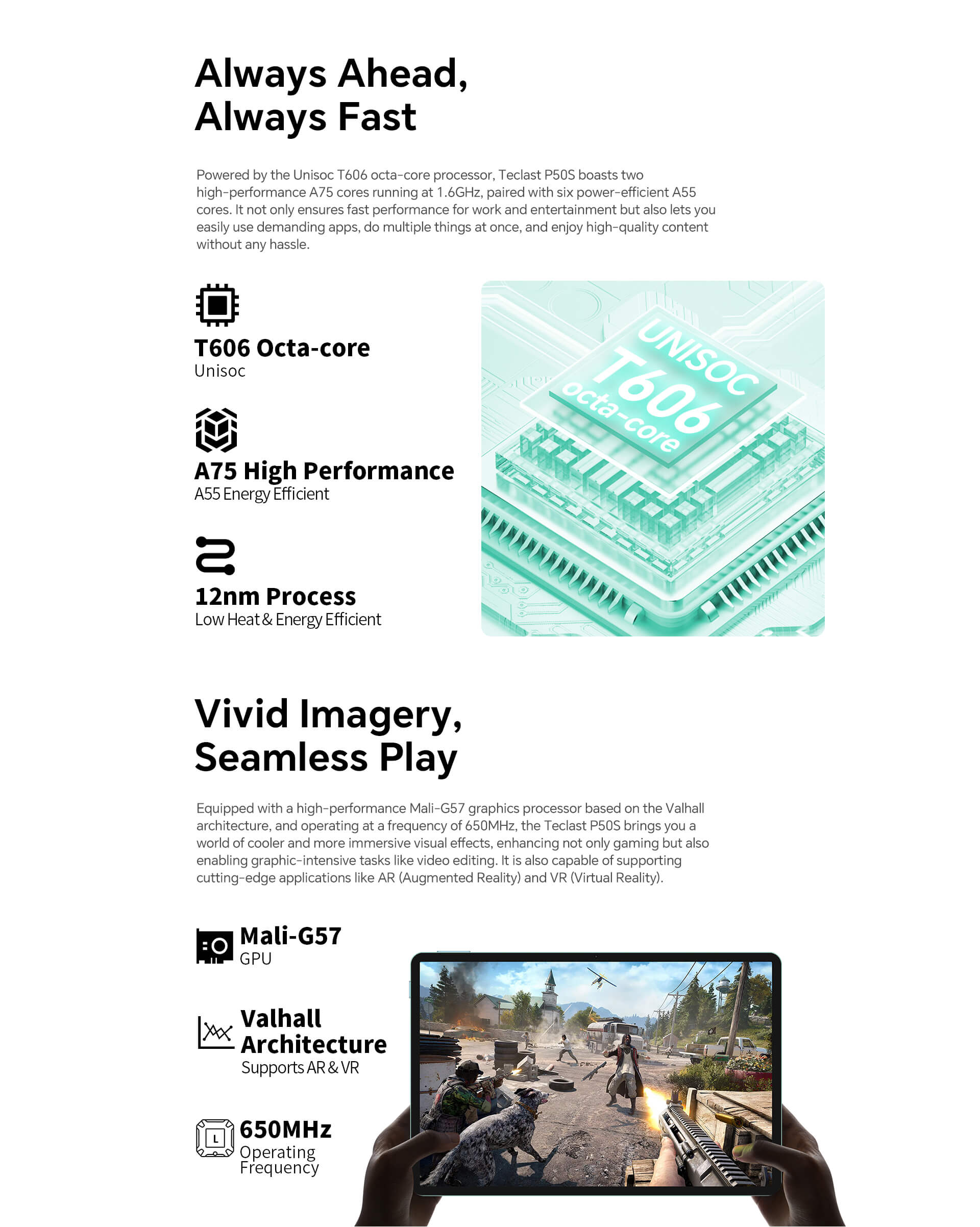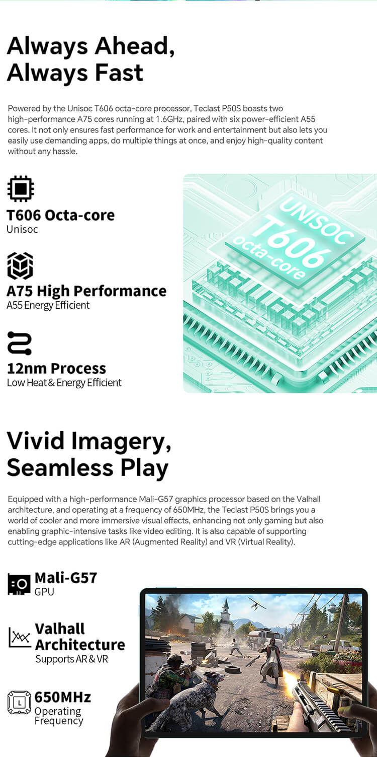 [Rendimiento eficiente] Equipada con un procesador Unisoc T606 Octa-Core y una GPU Mali-G57, esta tableta admite hasta 10 GB de RAM (4 GB de base más 6 GB de expansión) y proporciona 128 GB de almacenamiento para realizar múltiples tareas de manera eficaz.