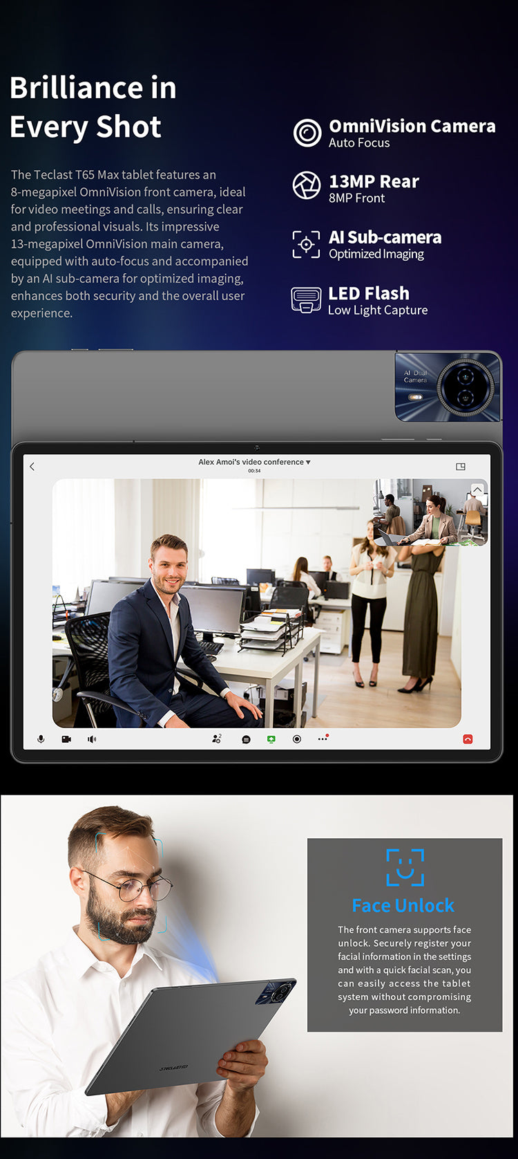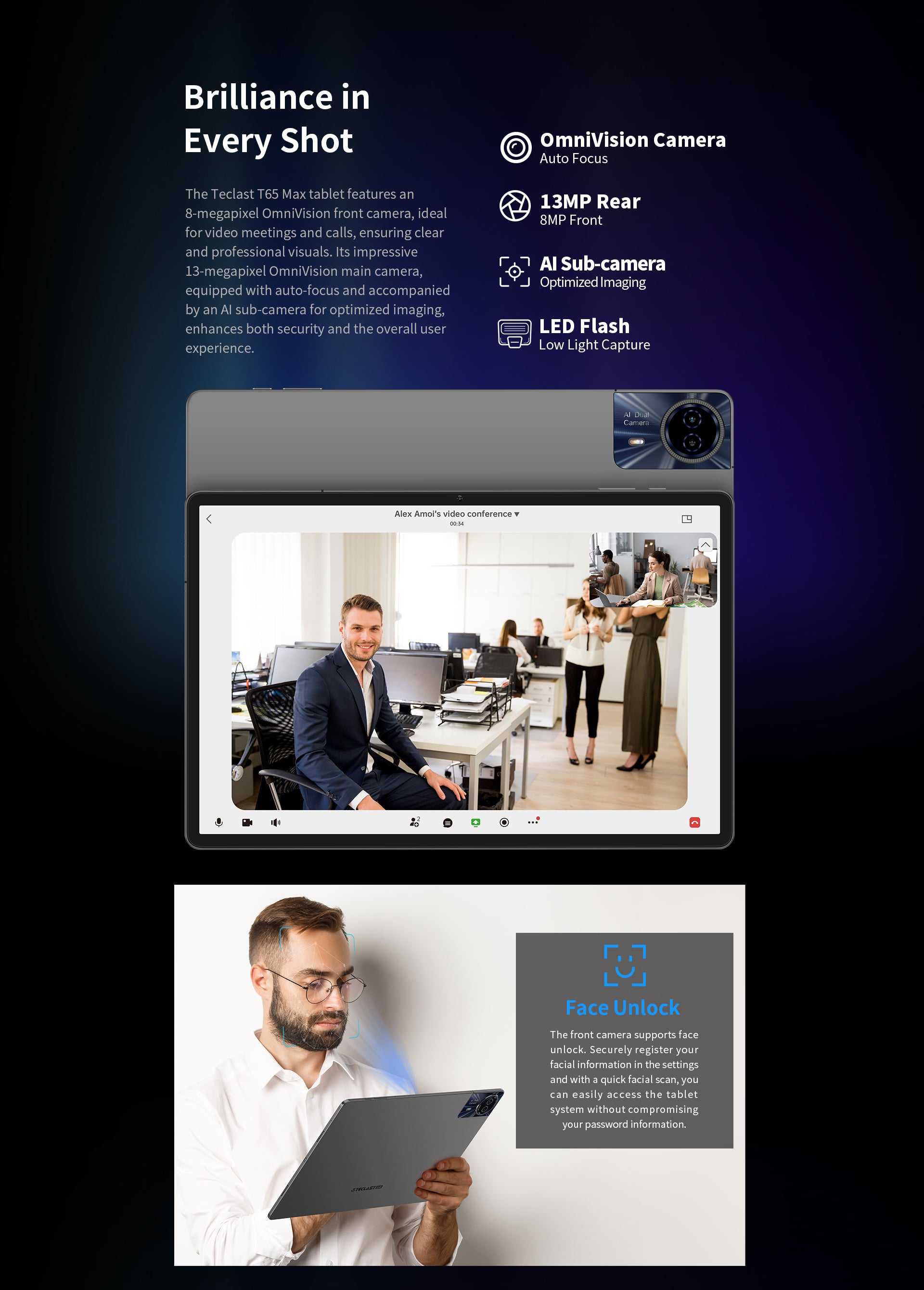 [Capturar la perfección] Capture la esencia de la perfección con la avanzada cámara trasera con enfoque automático de 13MP del T65Max y una refinada cámara frontal de 8MP. Estas cámaras de alta fidelidad ofrecen imágenes sorprendentemente claras y videollamadas fluidas, encapsulando la esencia de la fotografía emblemática.