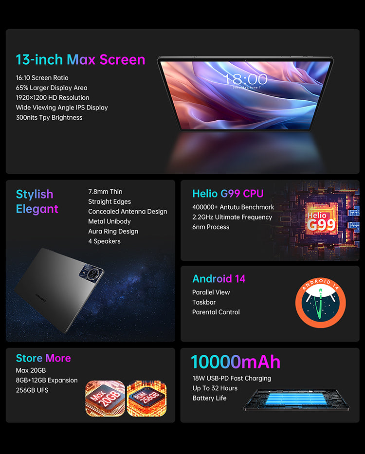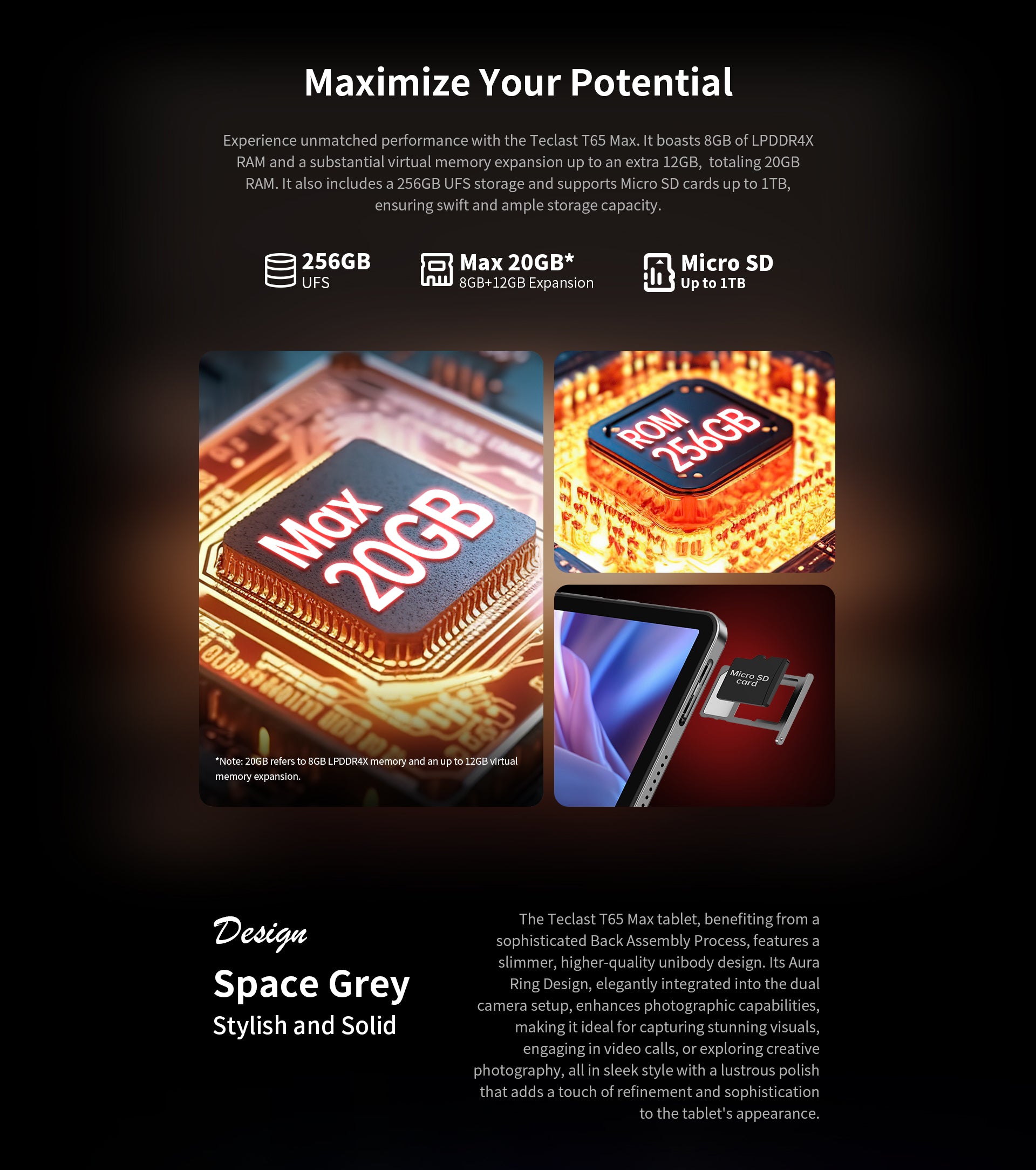 [Rendimiento de Helio G99] En el corazón del T65Max se encuentra el formidable procesador Helio G99, que establece un nuevo estándar de velocidad y eficiencia. Con hasta 20 GB de RAM (8 GB de base más una expansión de 12 GB de RAM) y 256 GB de almacenamiento UFS, ampliable a la colosal 1 TB, esta tableta está diseñada para manejar las aplicaciones más exigentes y realizar múltiples tareas con facilidad, definiendo la cúspide de la informática de alta gama.