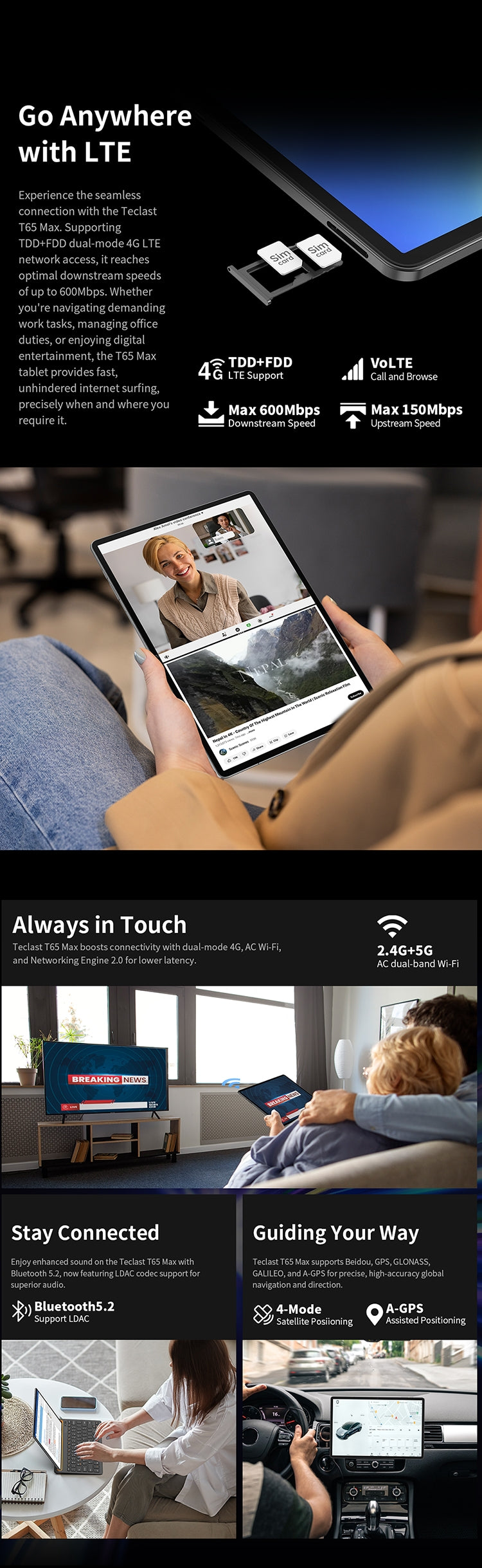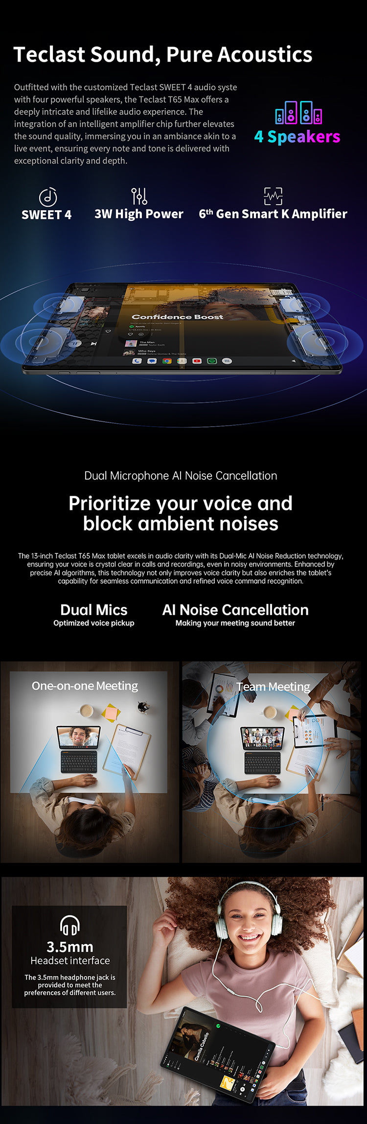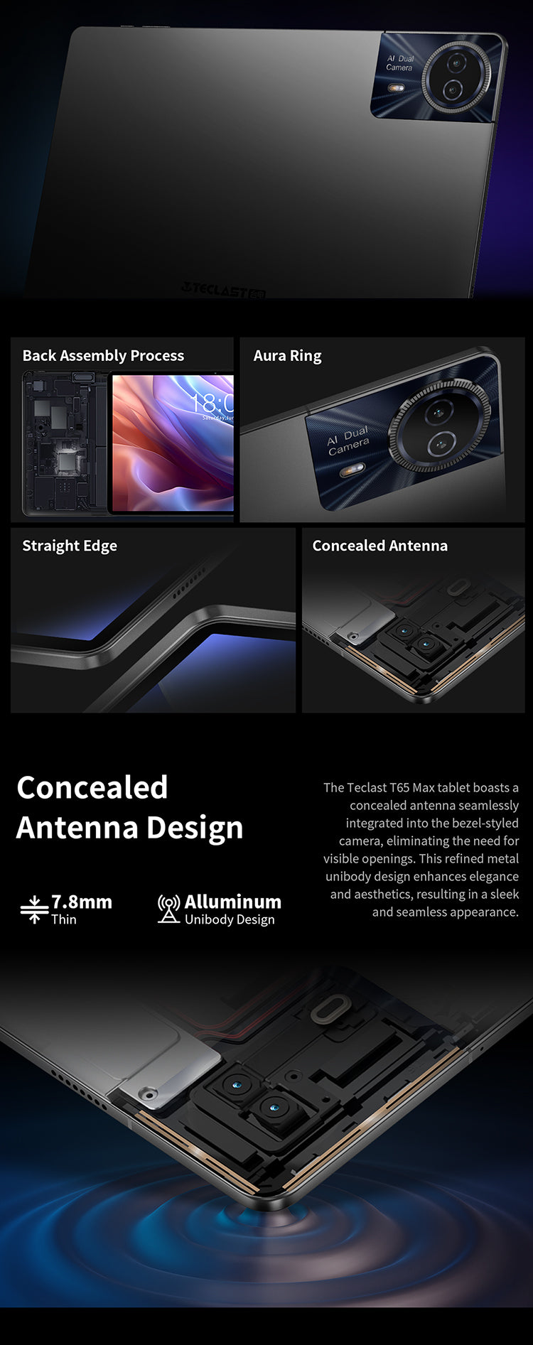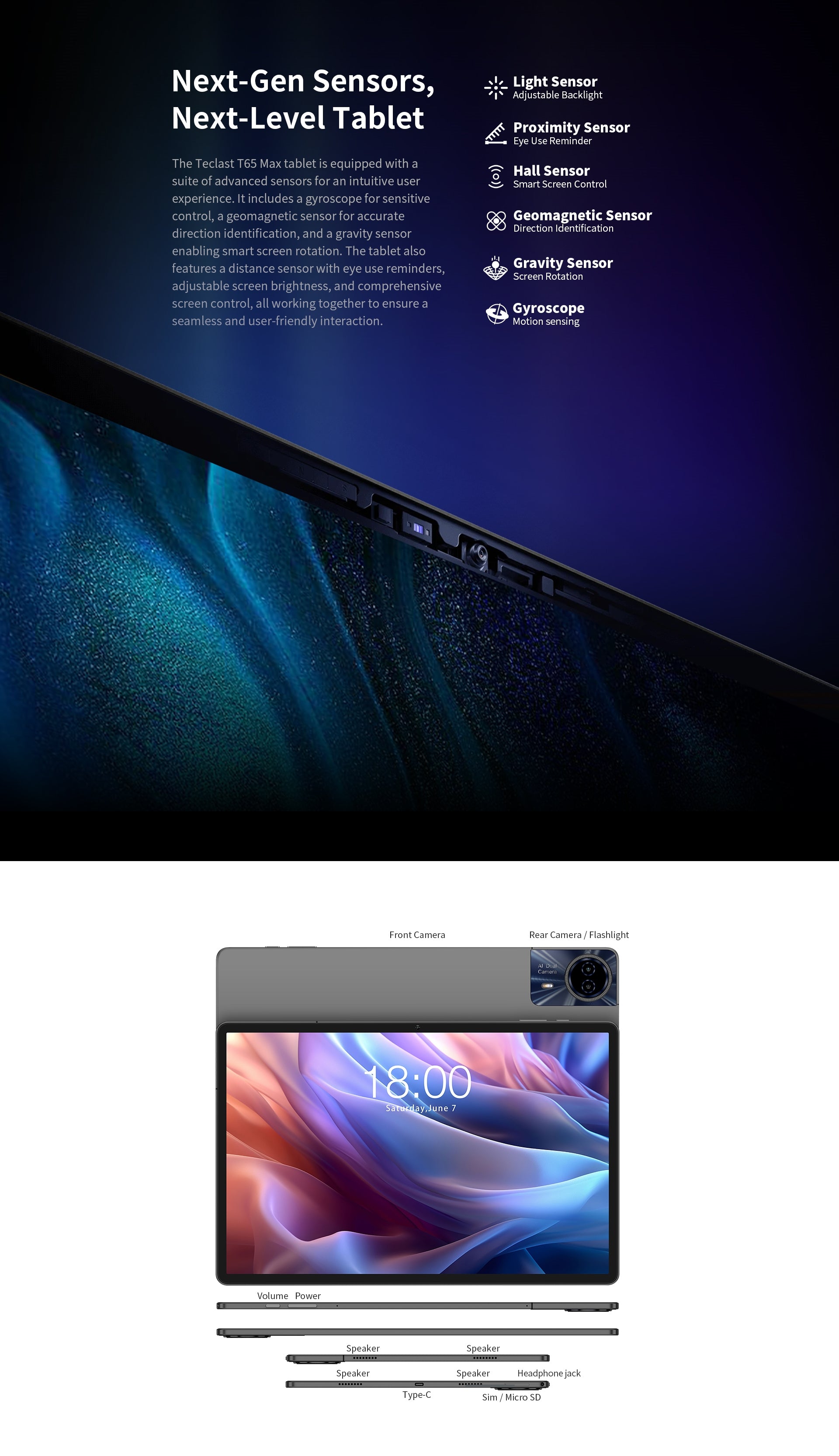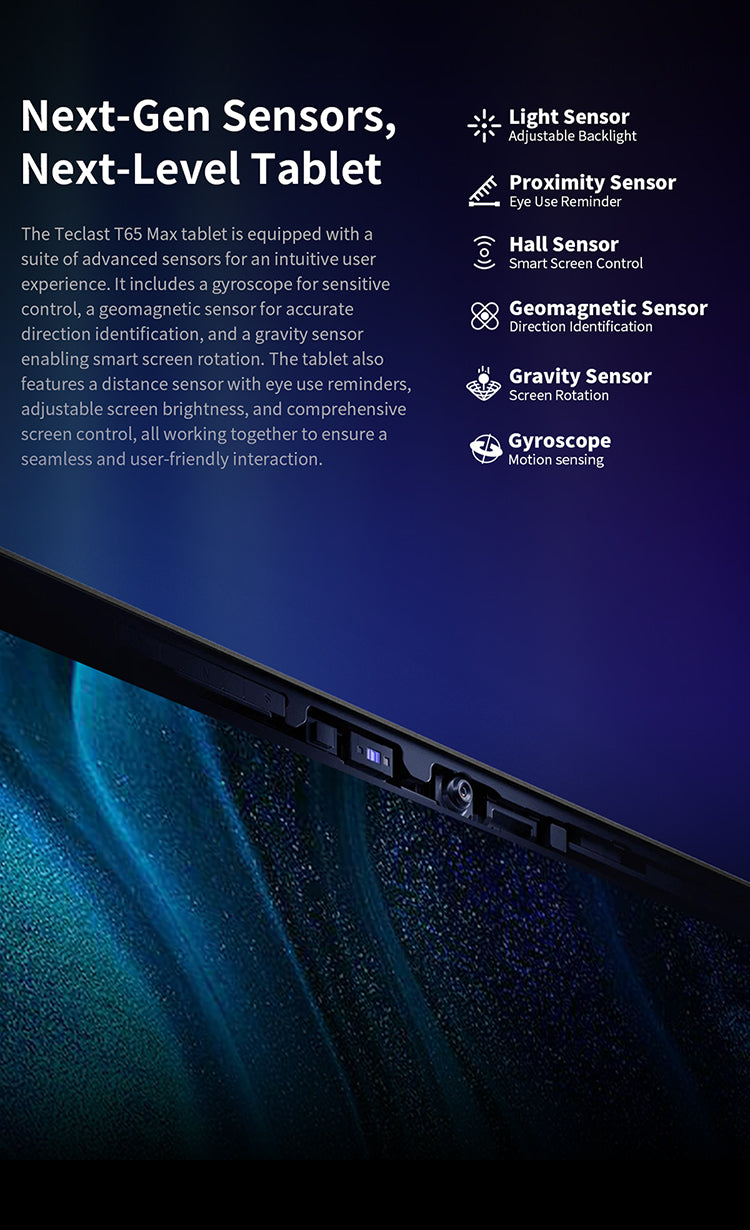 [Inteligencia sensorial] El T65Max está a la vanguardia de la innovación sensorial, presentando una variedad de sensores inteligentes que incluyen detectores de luz ambiental, pasillo y proximidad, complementados con un giroscopio intrincadamente calibrado. Esta integración armoniosa de tecnología ofrece una interacción de usuario receptiva y personalizada, redefiniendo los límites de las capacidades de las tabletas inteligentes.
