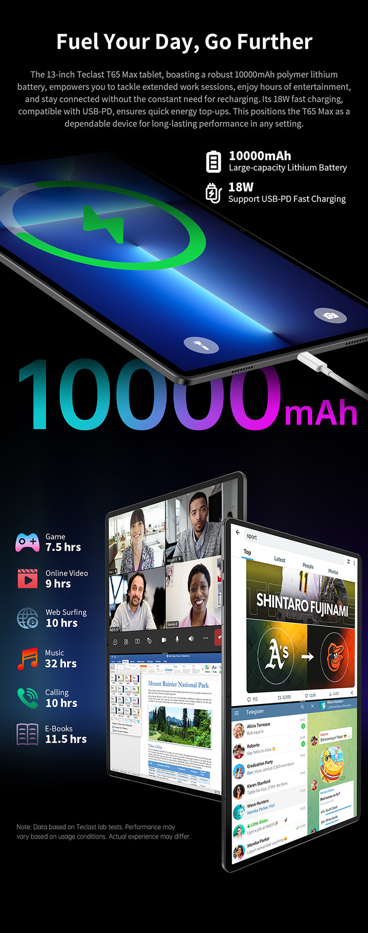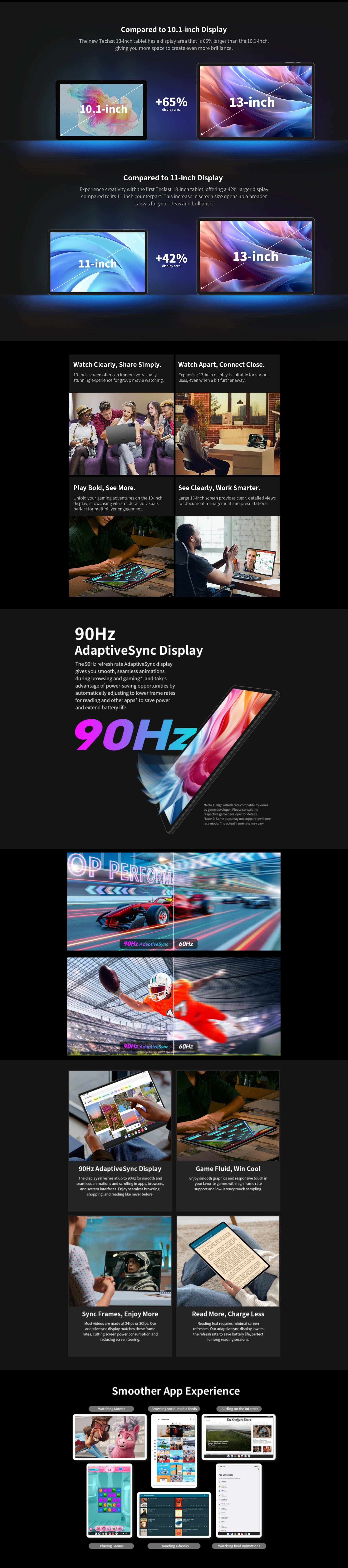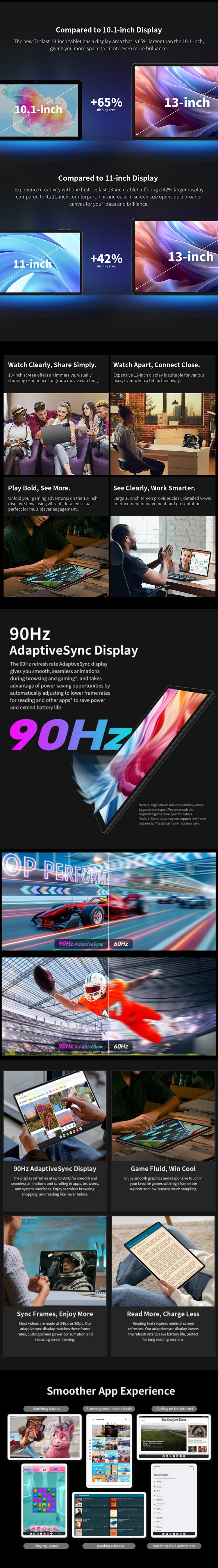 [Dominio visual de 13 pulgadas] La tableta T65 Max cuenta con una pantalla IPS de 13 pulgadas con resolución HD 1920x1200 y relación de aspecto 16:10 para una experiencia visual envolvente. La frecuencia de actualización de 90 Hz garantiza imágenes fluidas y suaves, perfectas tanto para trabajar como para jugar.