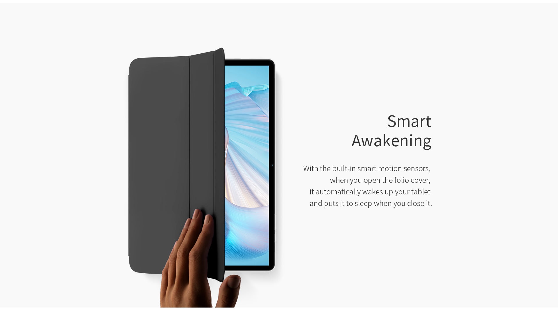 With the built-in smart motion sensors, when you open the folio cover, it automatically wakes up your tablet and puts it to sleep when you close it.