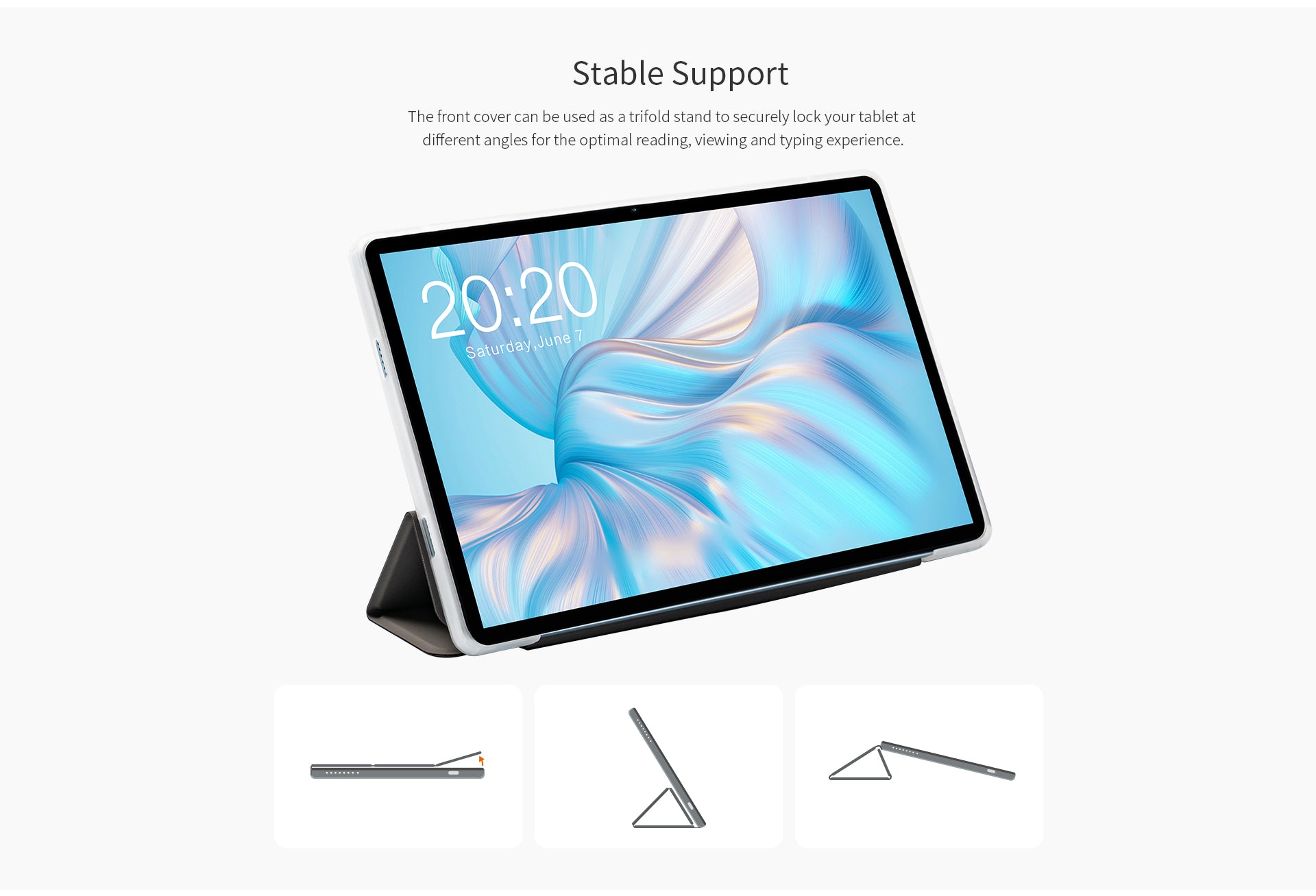 The front cover can be used as a trifold stand to securely lock your tablet at different angles for the optimal reading, viewing, and typing experience.