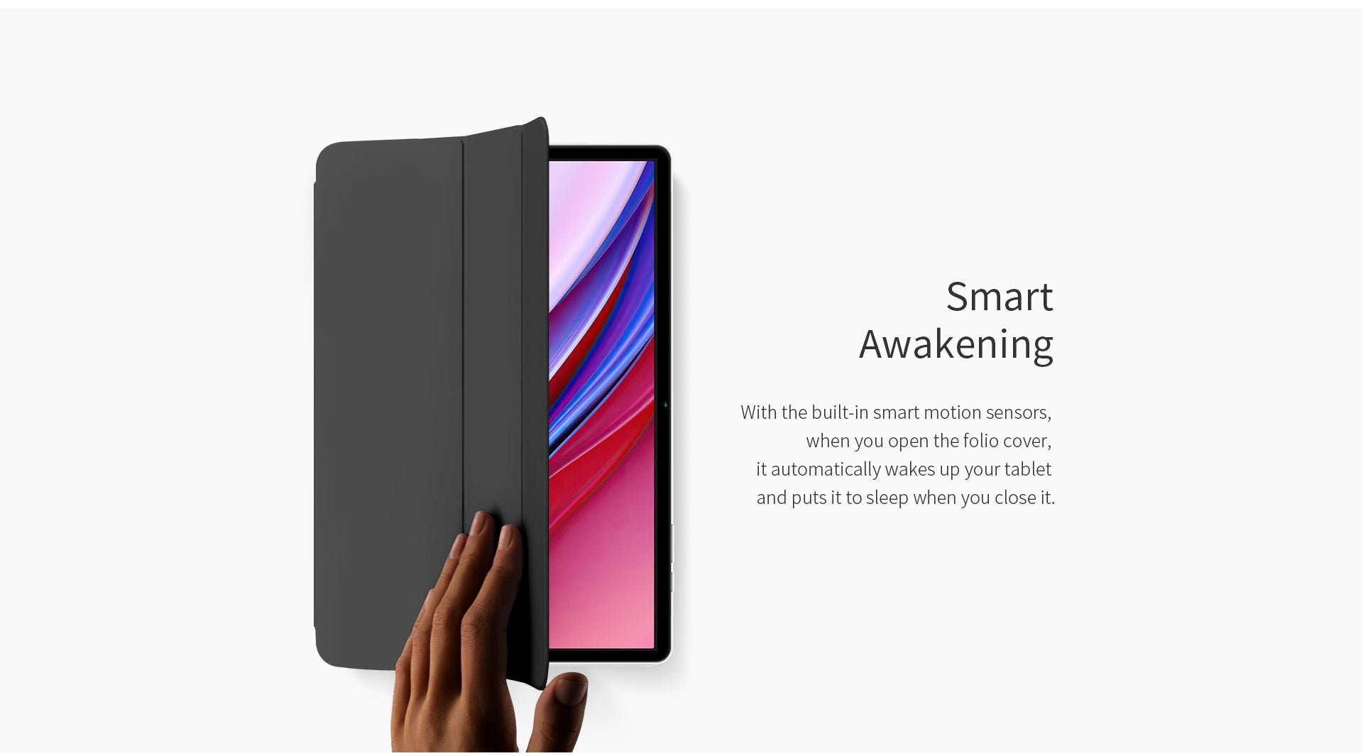Grâce aux capteurs de mouvement intelligents intégrés, lorsque vous ouvrez l'étui folio, il réveille automatiquement votre tablette et la met en veille lorsque vous la fermez.