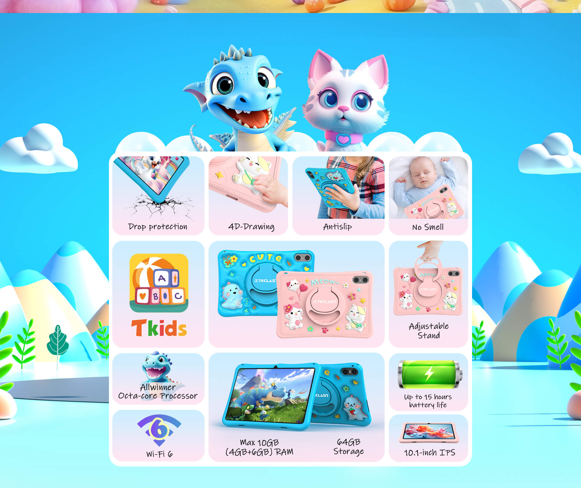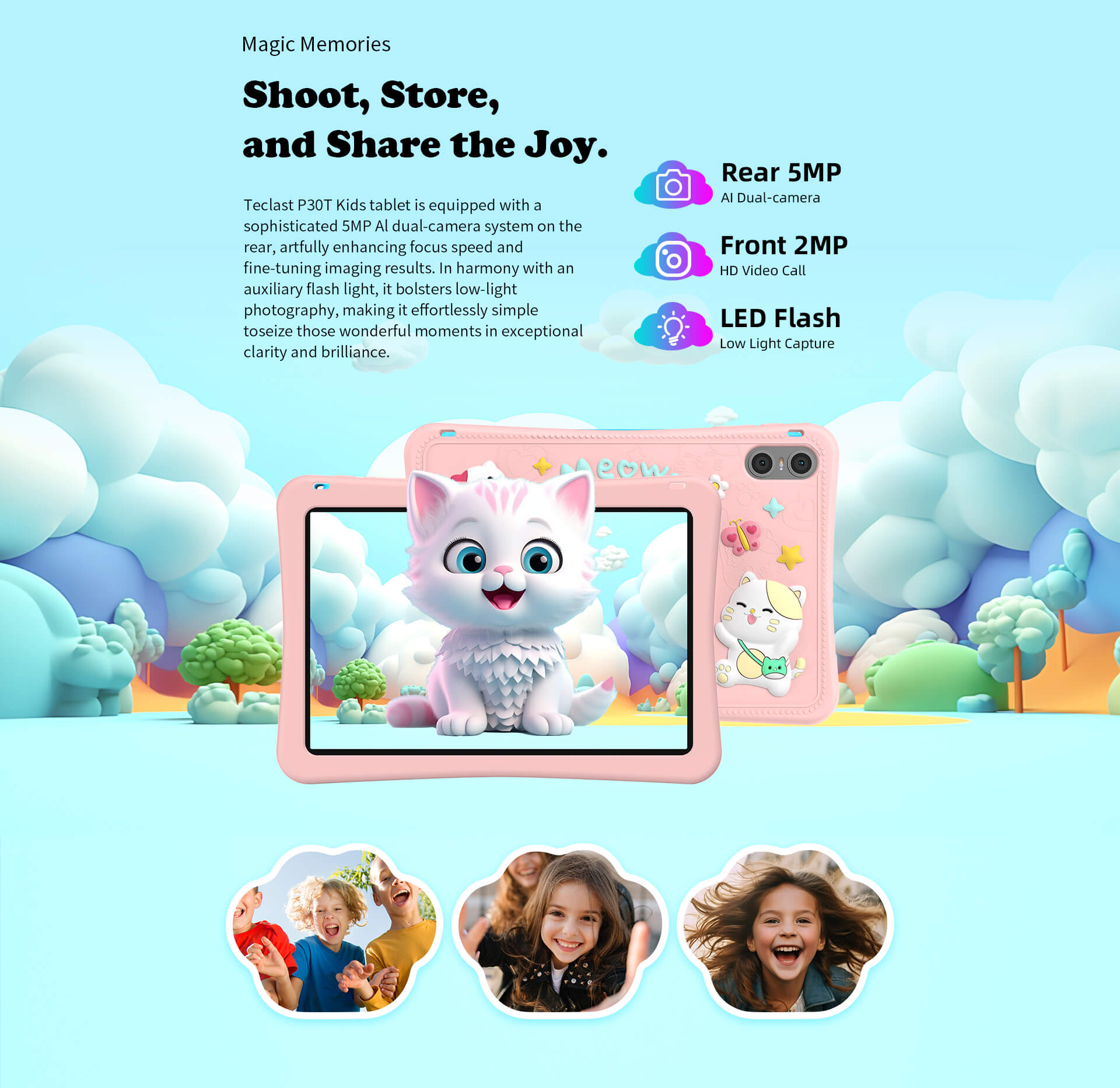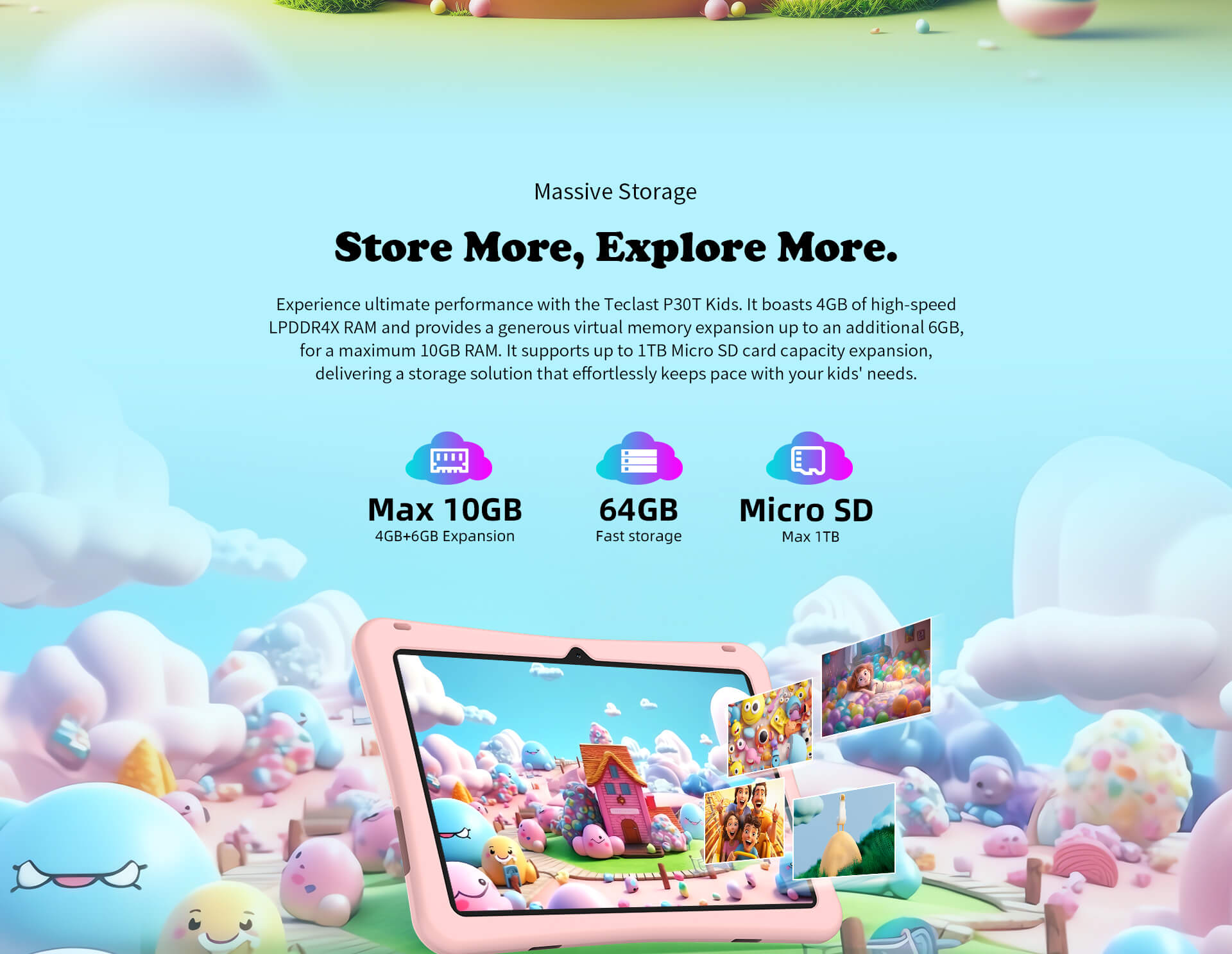 [Performances puissantes] Équipé d'un maximum de 10 Go de RAM (4 Go de base plus 6 Go d'extension) et de 64 Go de stockage, le P30TKids offre des performances fluides et suffisamment d'espace pour des découvertes infinies.
