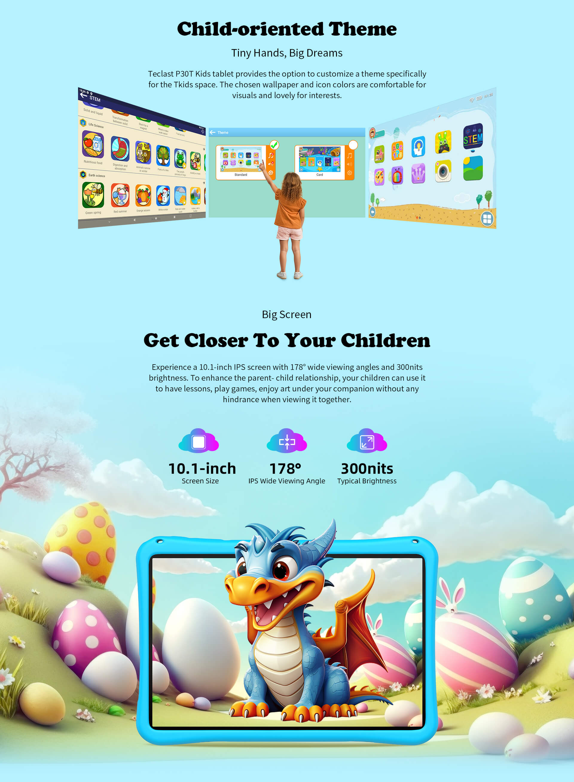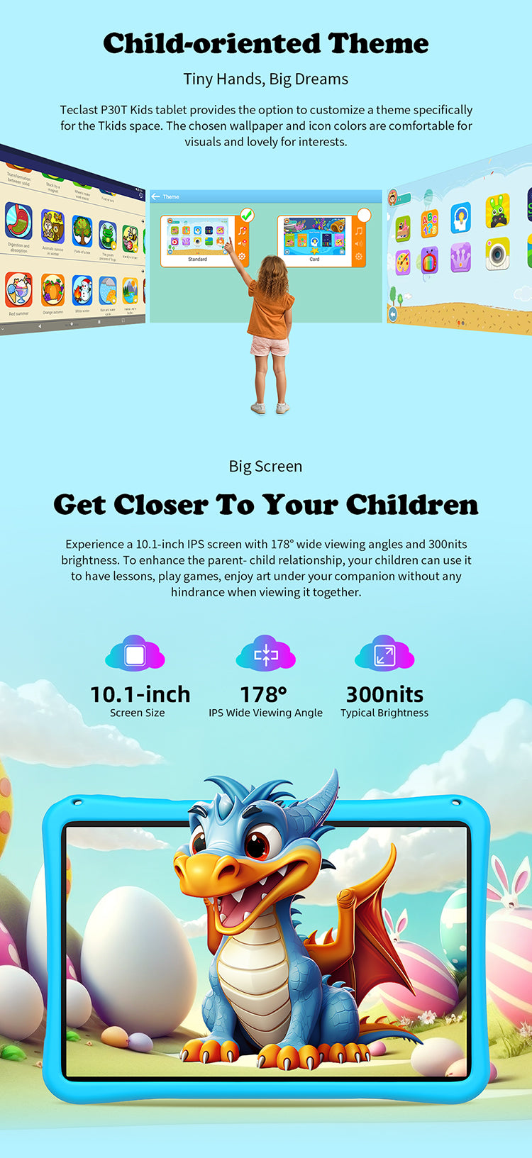 [Android 14] Fonctionnant sous Android 14, la tablette permet de personnaliser les thèmes dans Tkids Space. Sélectionnez des fonds d'écran et des couleurs d'icônes visuellement confortables et attrayantes pour les jeunes utilisateurs, améliorant ainsi leur expérience interactive.