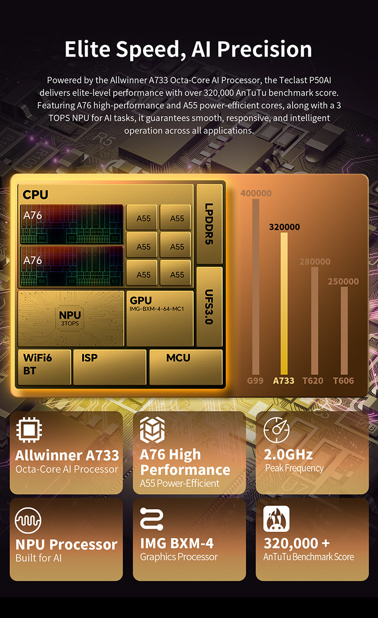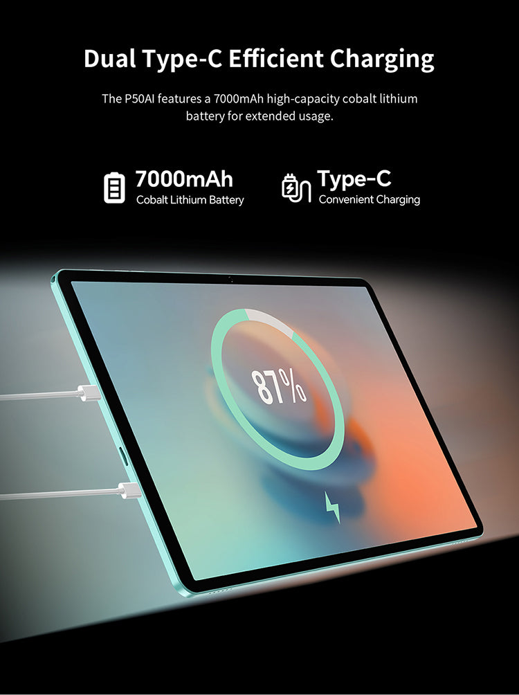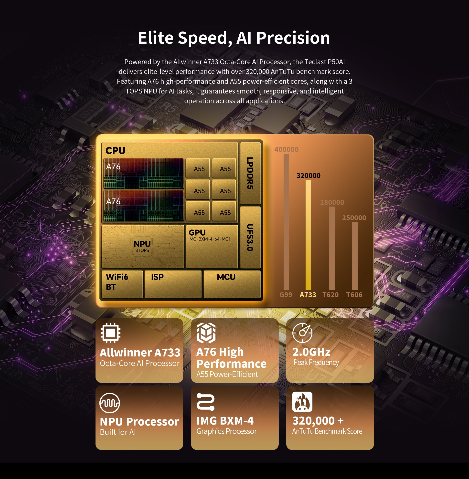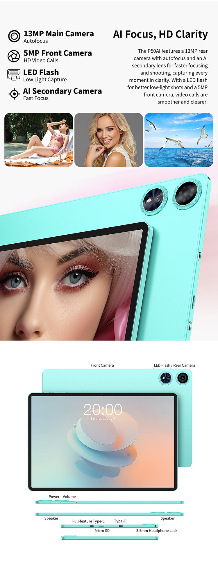 [Allwinner A733 Octa-Core] La tablette P50AI est équipée du puissant processeur Allwinner A733 Octa-Core, offrant un multitâche hautes performances et économe en énergie. Il garantit des temps de réponse rapides, une utilisation plus fluide des applications et des performances optimales pour toutes vos applications.