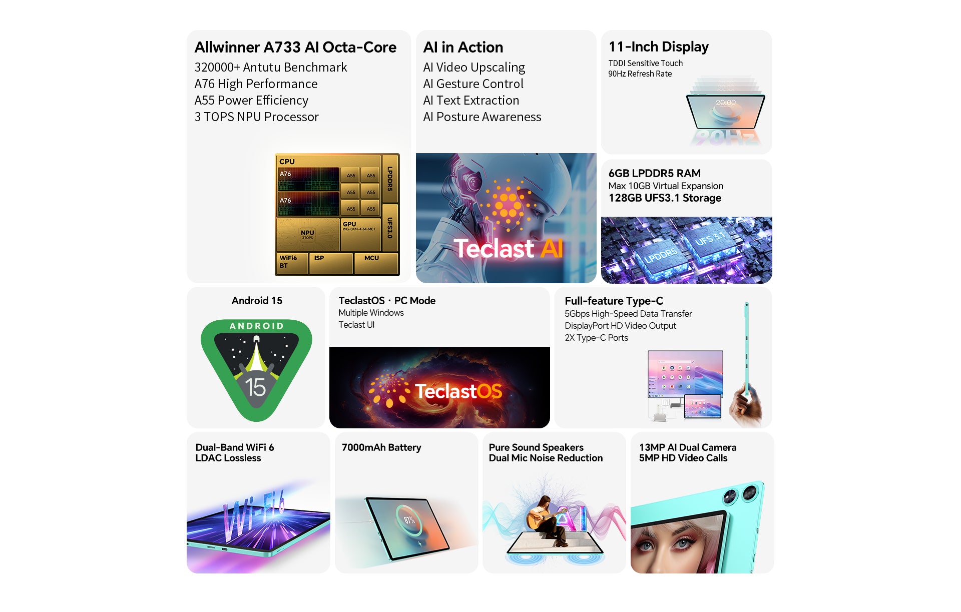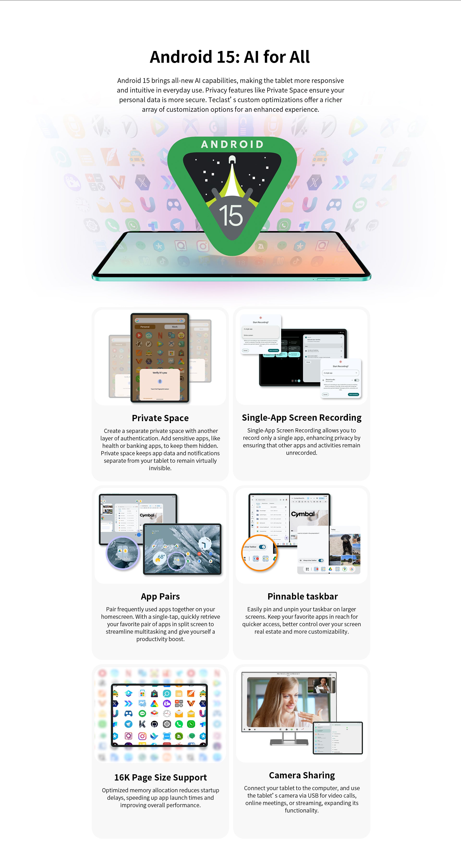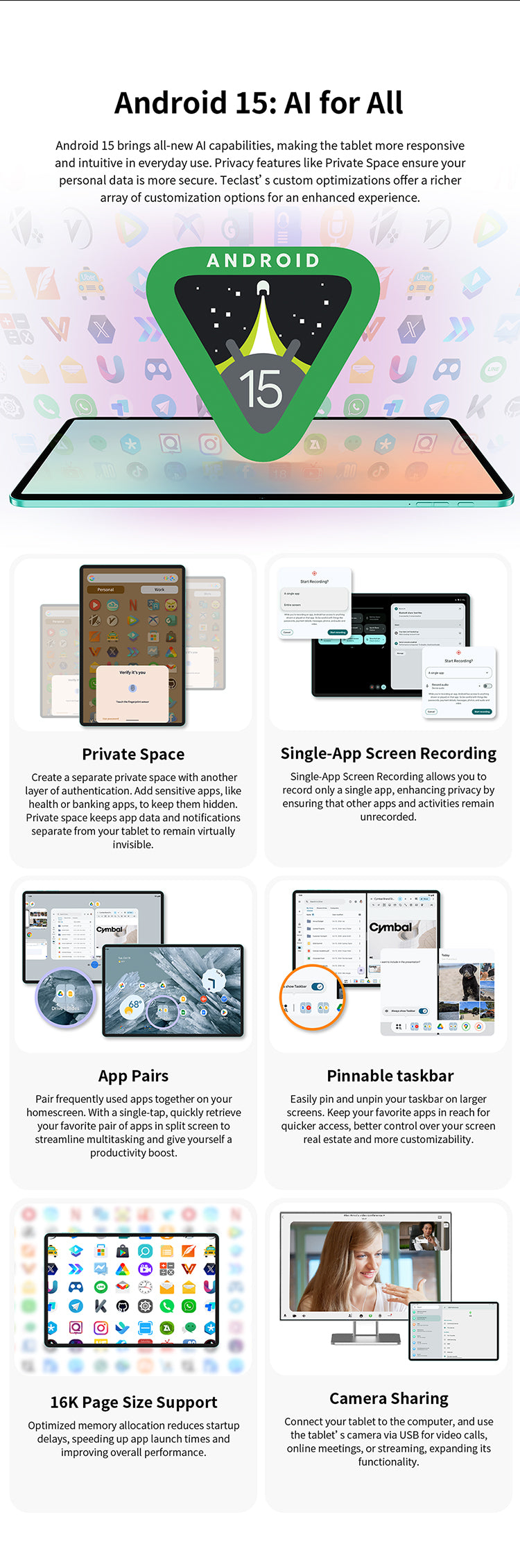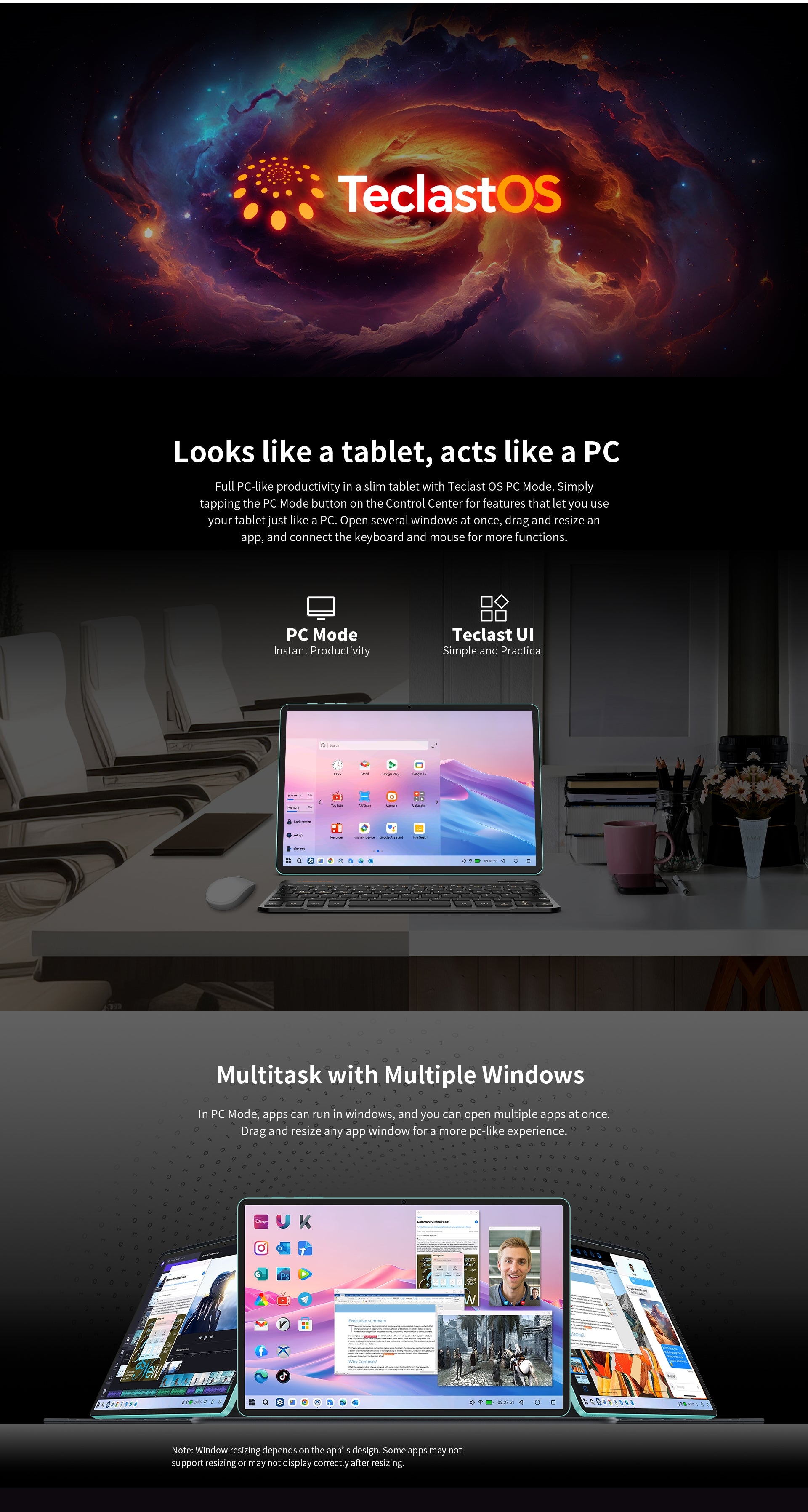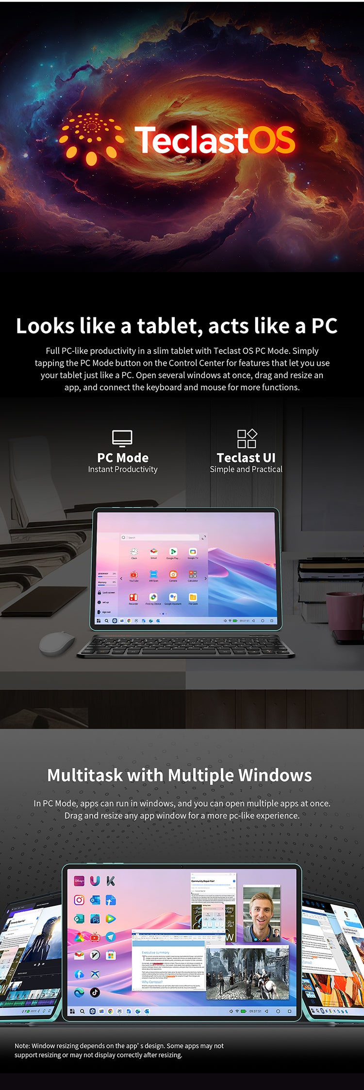 [Android 15 avec TeclastOS ] Alimenté par Android 15, TeclastOS offre un mode PC, une gestion multi-fenêtre transparente et un enregistrement d'écran via une seule application, permettant une productivité améliorée et une utilisation polyvalente. expérience de tablette pour le travail, le divertissement et l'utilisation quotidienne.