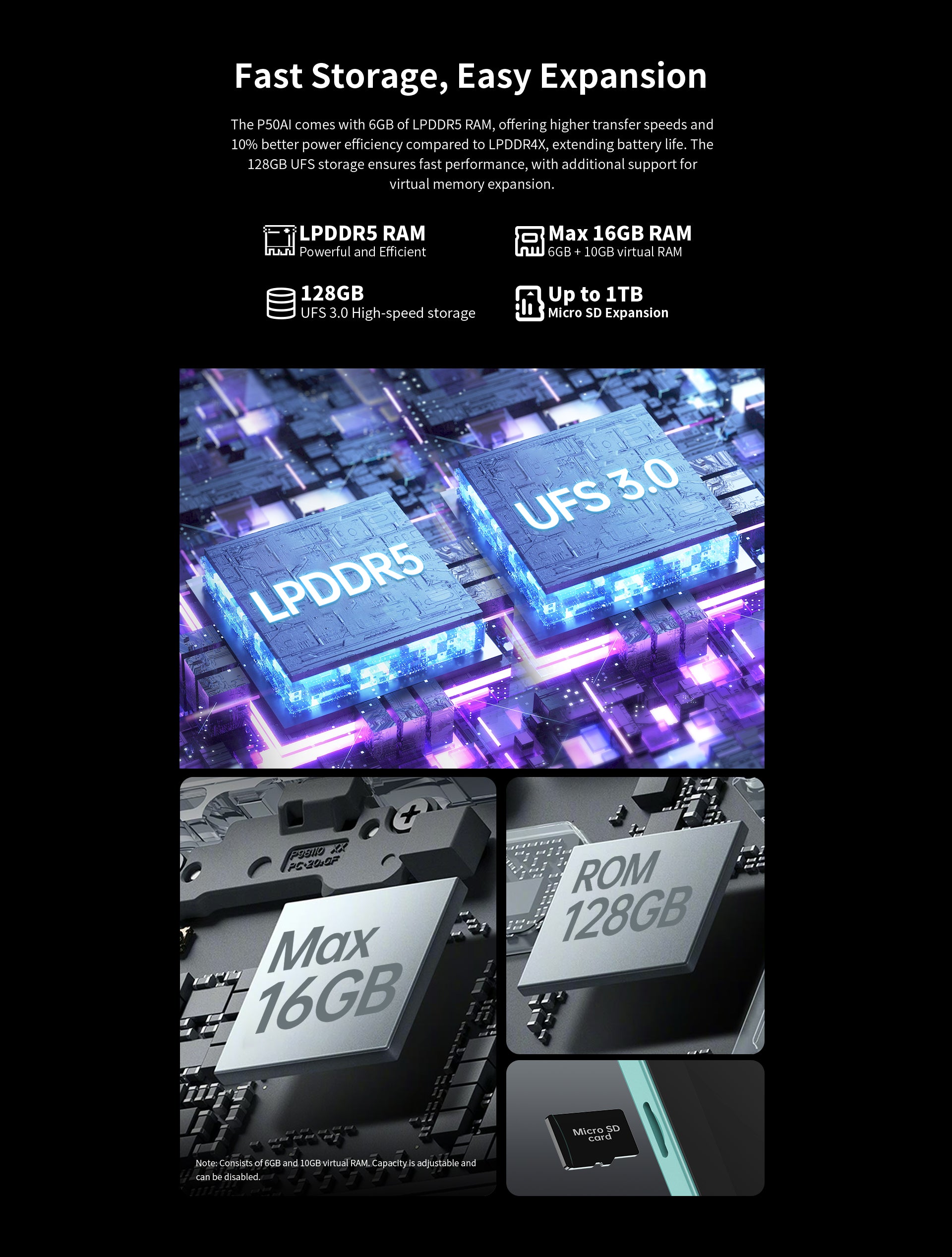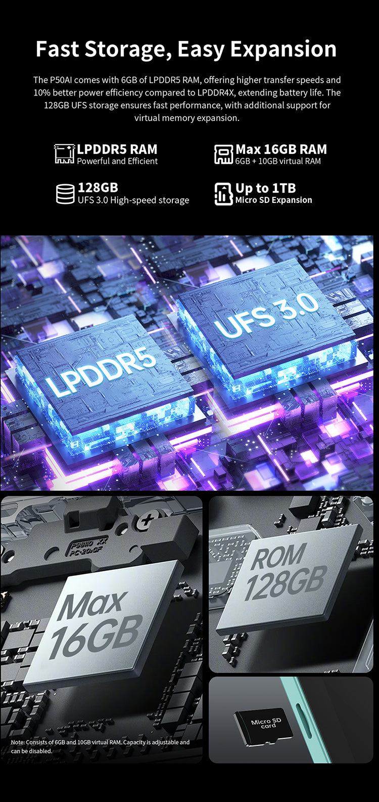 [La mémoire rencontre l'espace] Avec jusqu'à 16 Go de RAM (6 Go LPDDR5 plus 10 Go virtuels) et 128 Go de stockage UFS3.0, le P50AI offre un accès rapide aux données et suffisamment d'espace, garantissant multitâche fluide et espace de stockage suffisant pour les applications et les médias.