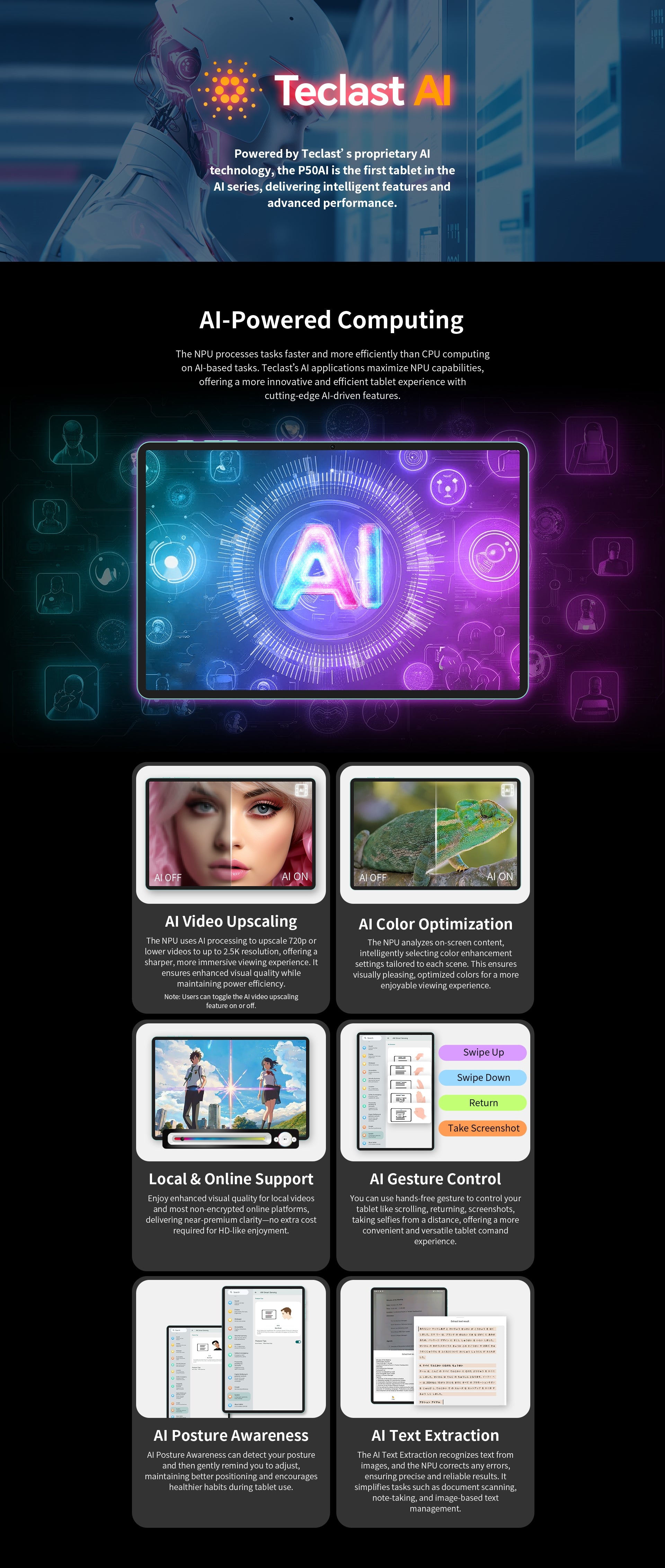 [AI en action] Découvrez des fonctionnalités intelligentes telles que la mise à l'échelle vidéo IA pour des visuels améliorés, le contrôle gestuel IA pour une interaction sans contact, l'extraction de texte IA pour une reconnaissance efficace du texte et la détection de la posture IA, favorisant une expérience de tablette plus saine.