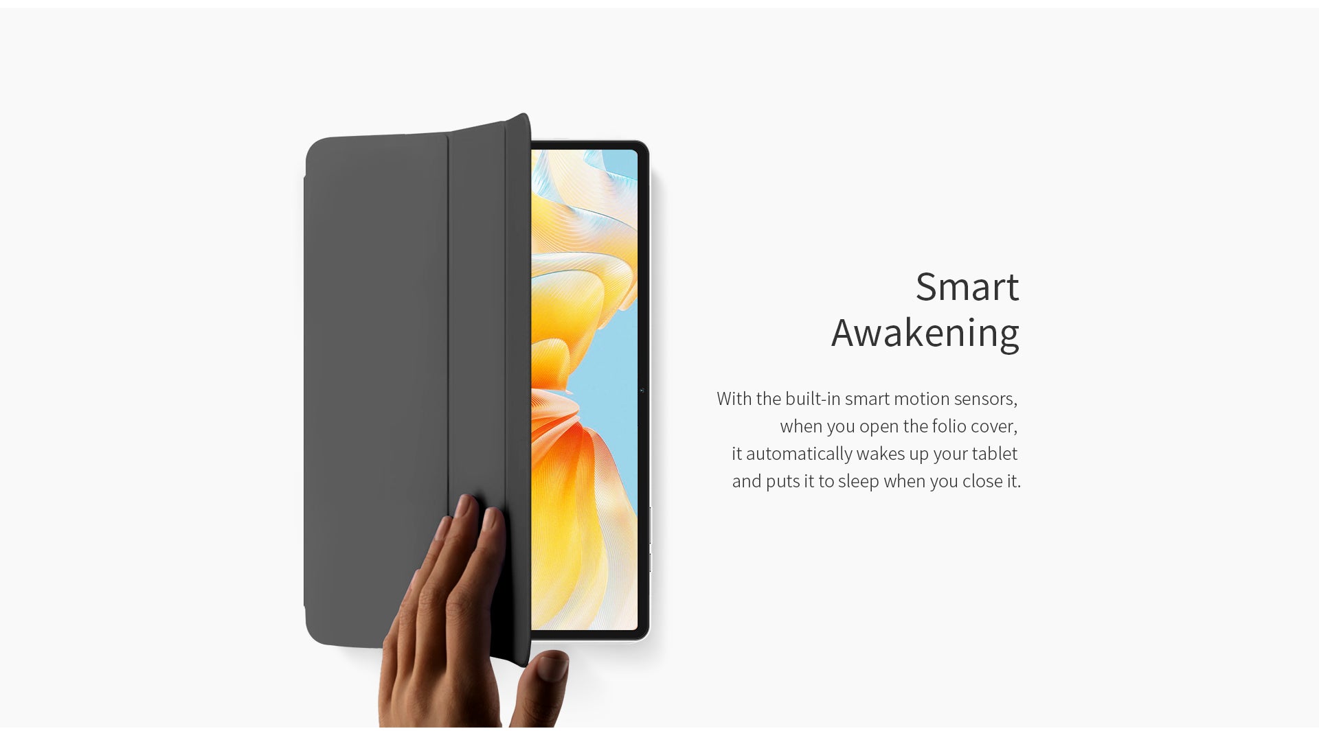 Grâce aux capteurs de mouvement intelligents intégrés, lorsque vous ouvrez l'étui folio, il réveille automatiquement votre tablette et la met en veille lorsque vous la fermez.