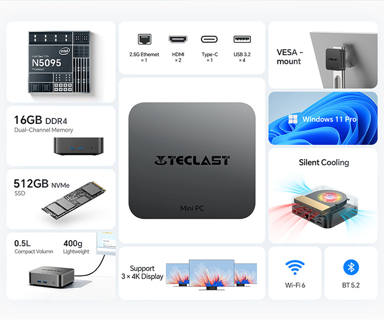 [CPU ad alte prestazioni] L'N20 vanta un processore Intel N5095 della serie Jasper Lake , con una configurazione quad-core con un picco di 2,9 GHz per prestazioni più veloci.