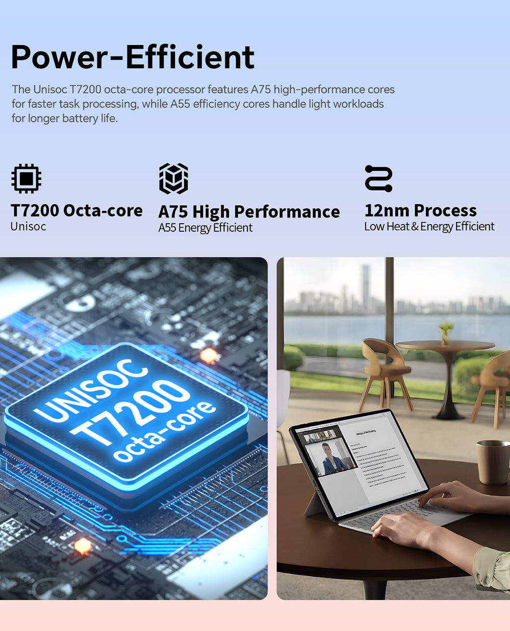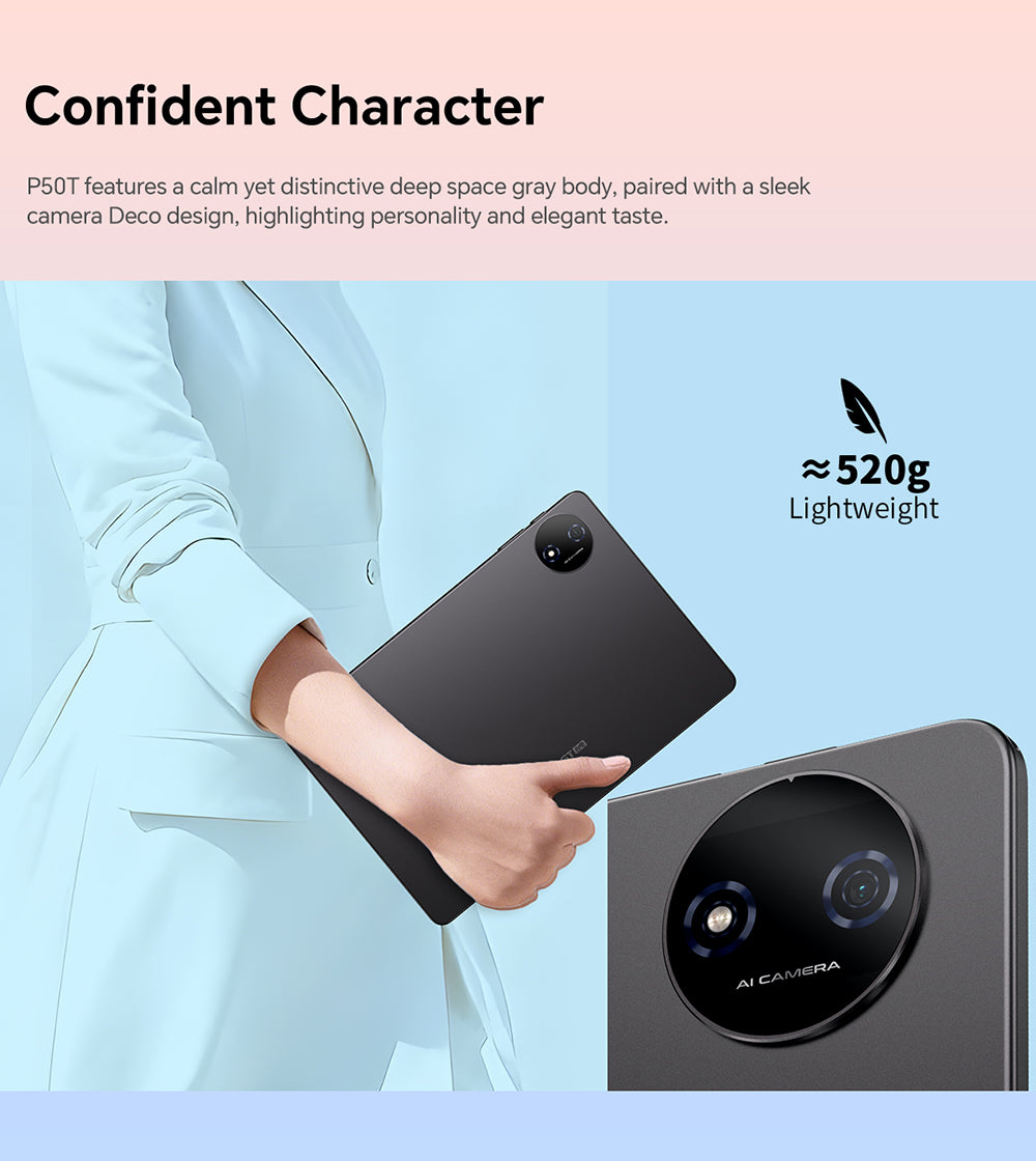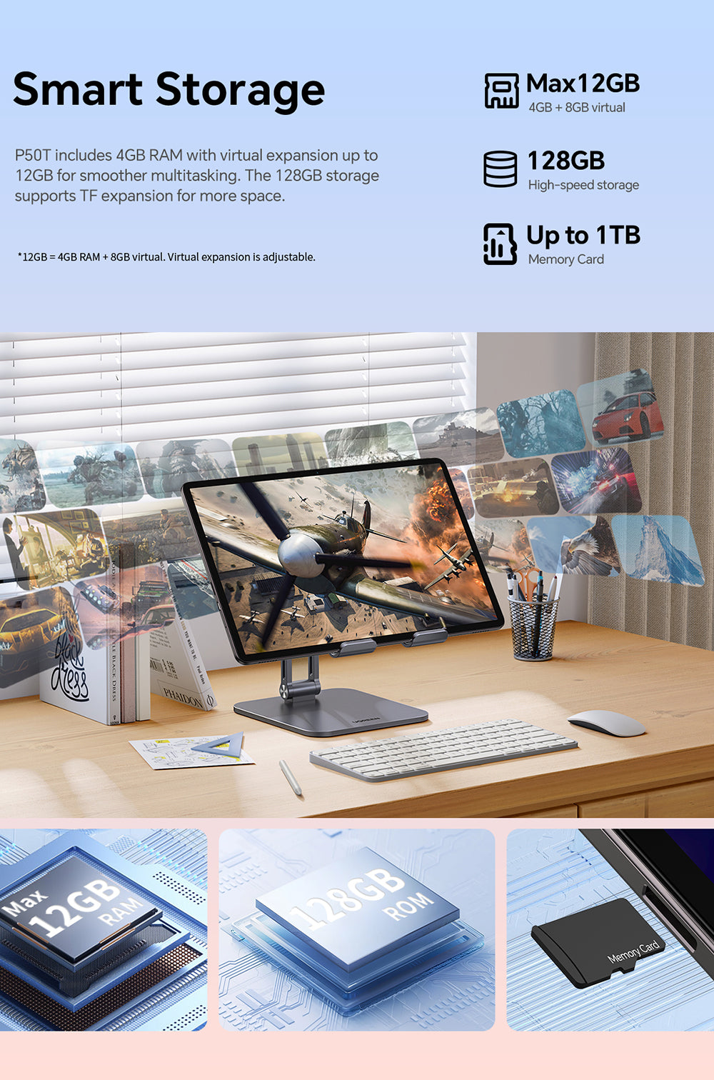 [Powerful Performance] Powered by the Unisoc T7200 Octa-Core processor and Mali-G57 GPU, the P50T handles up to 12GB RAM (4GB base with 8GB expansion) and 128GB storage, delivering fast multitasking performance and ample storage for apps, media, and more.