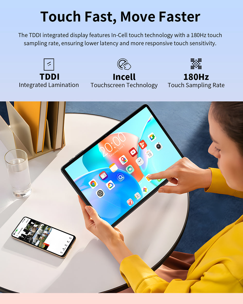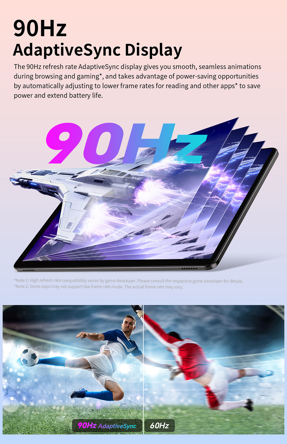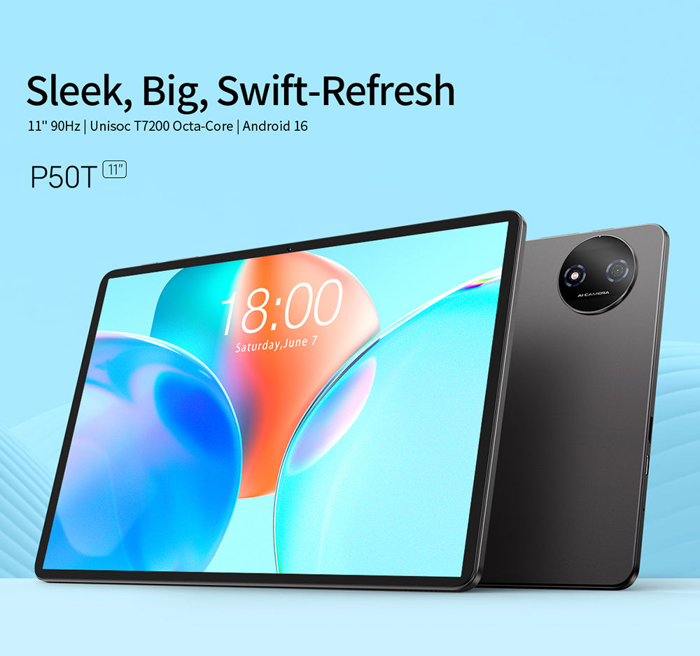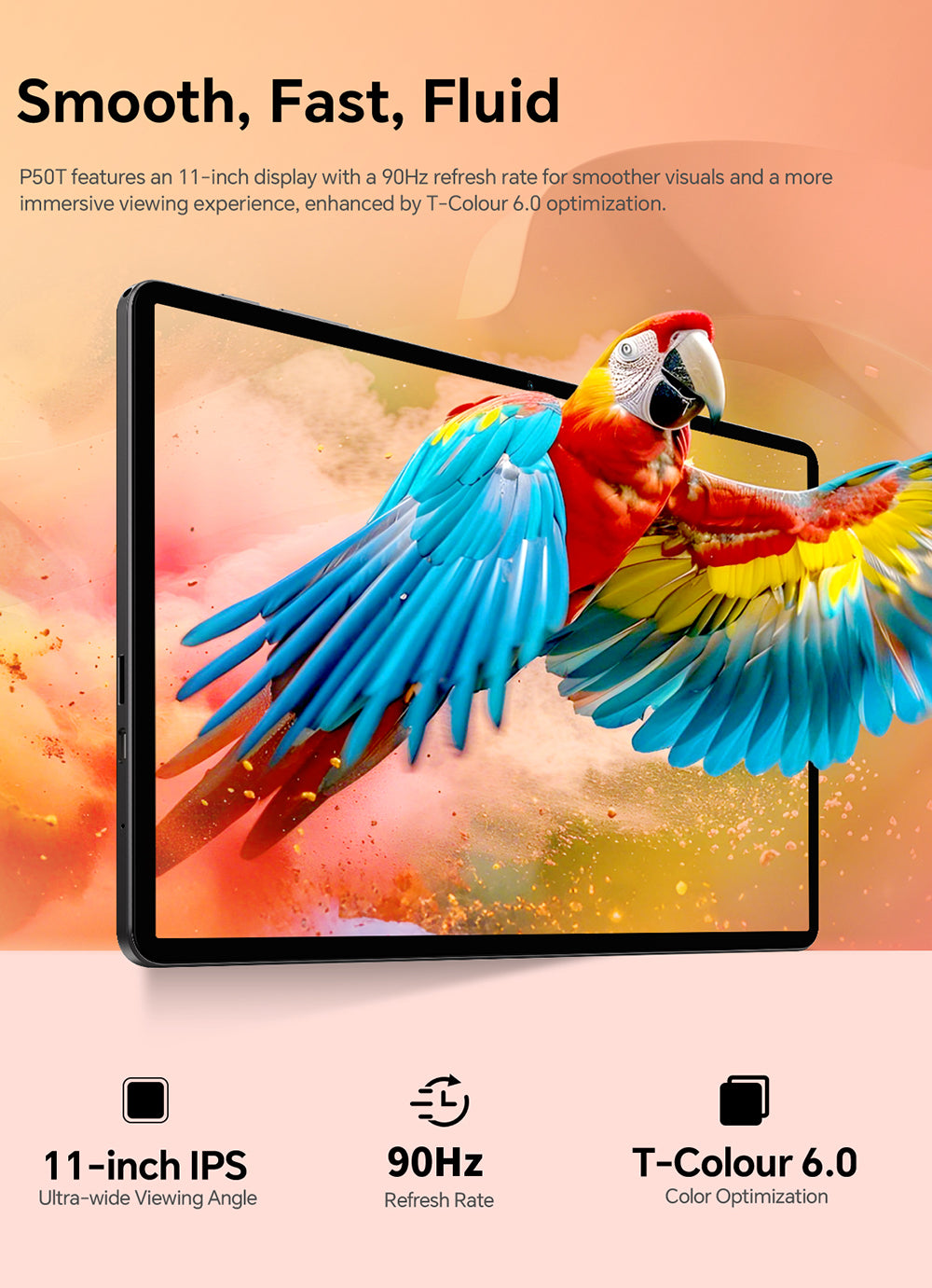 [Vibrant 11-inch Display] The Teclast P50T features an 11-inch screen with a 16:10 aspect ratio and 1280x800 resolution, offering vibrant visuals with a 90Hz refresh rate for a smooth, eye-friendly viewing experience.
