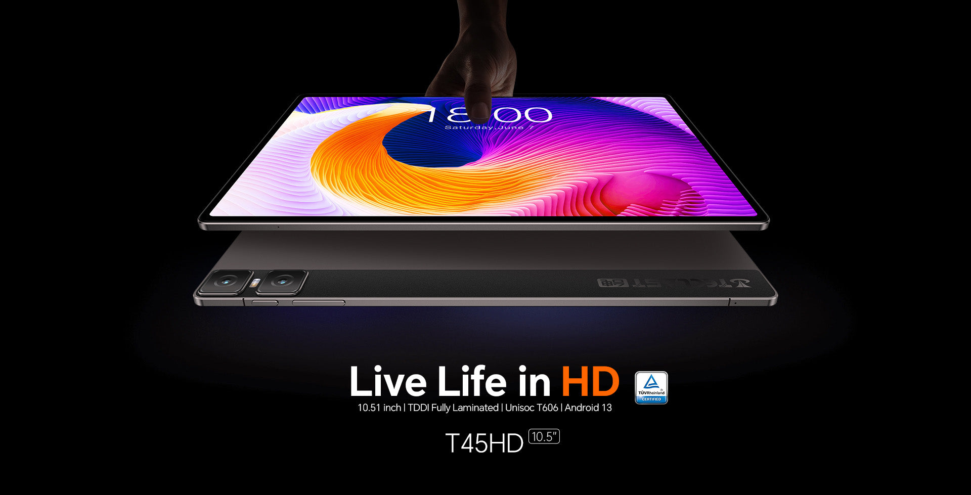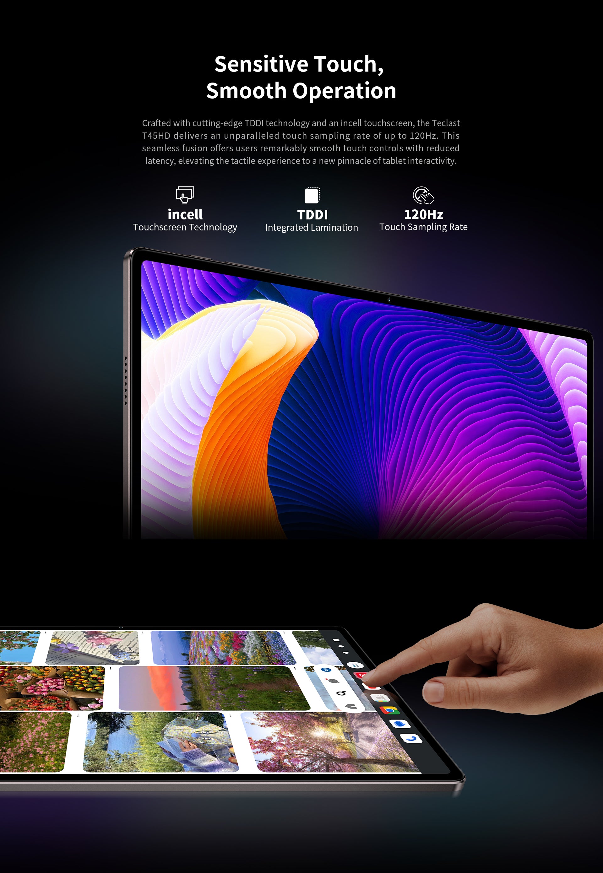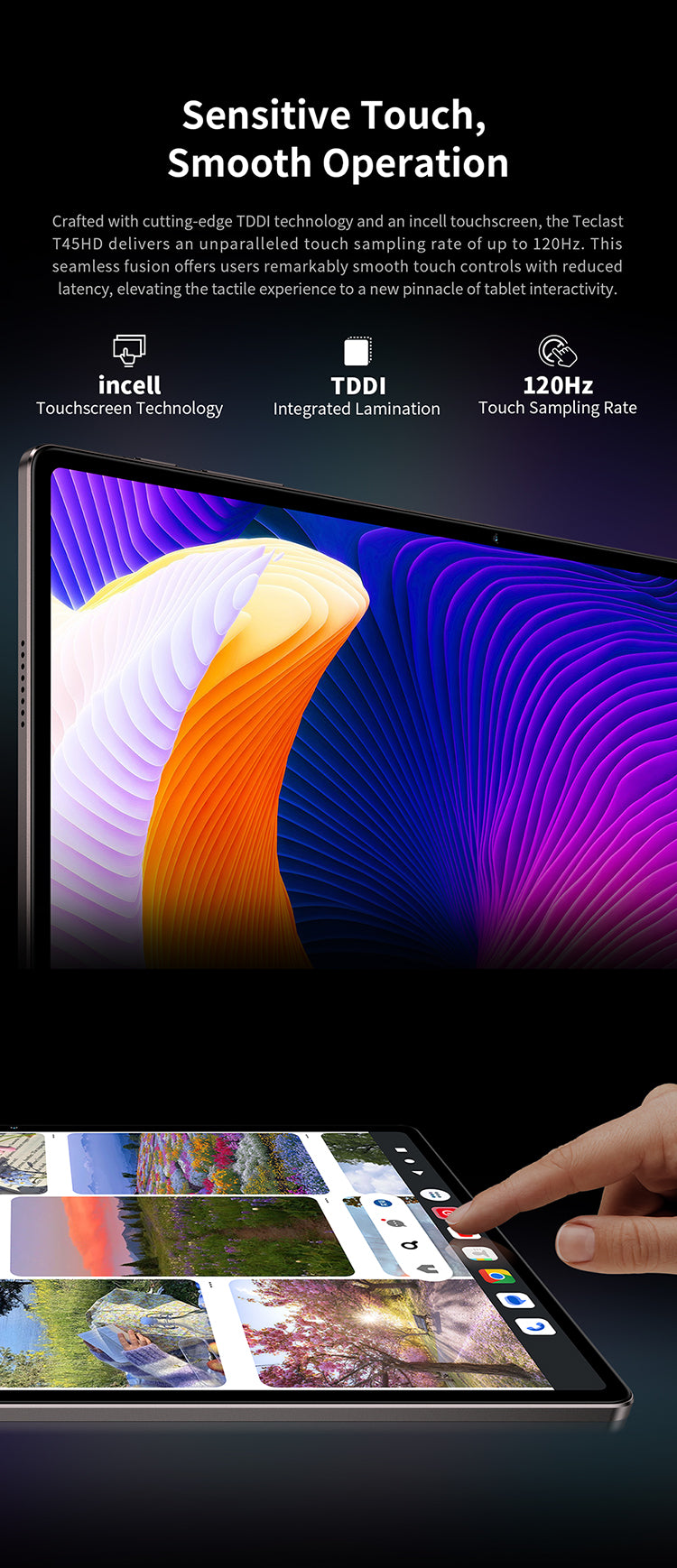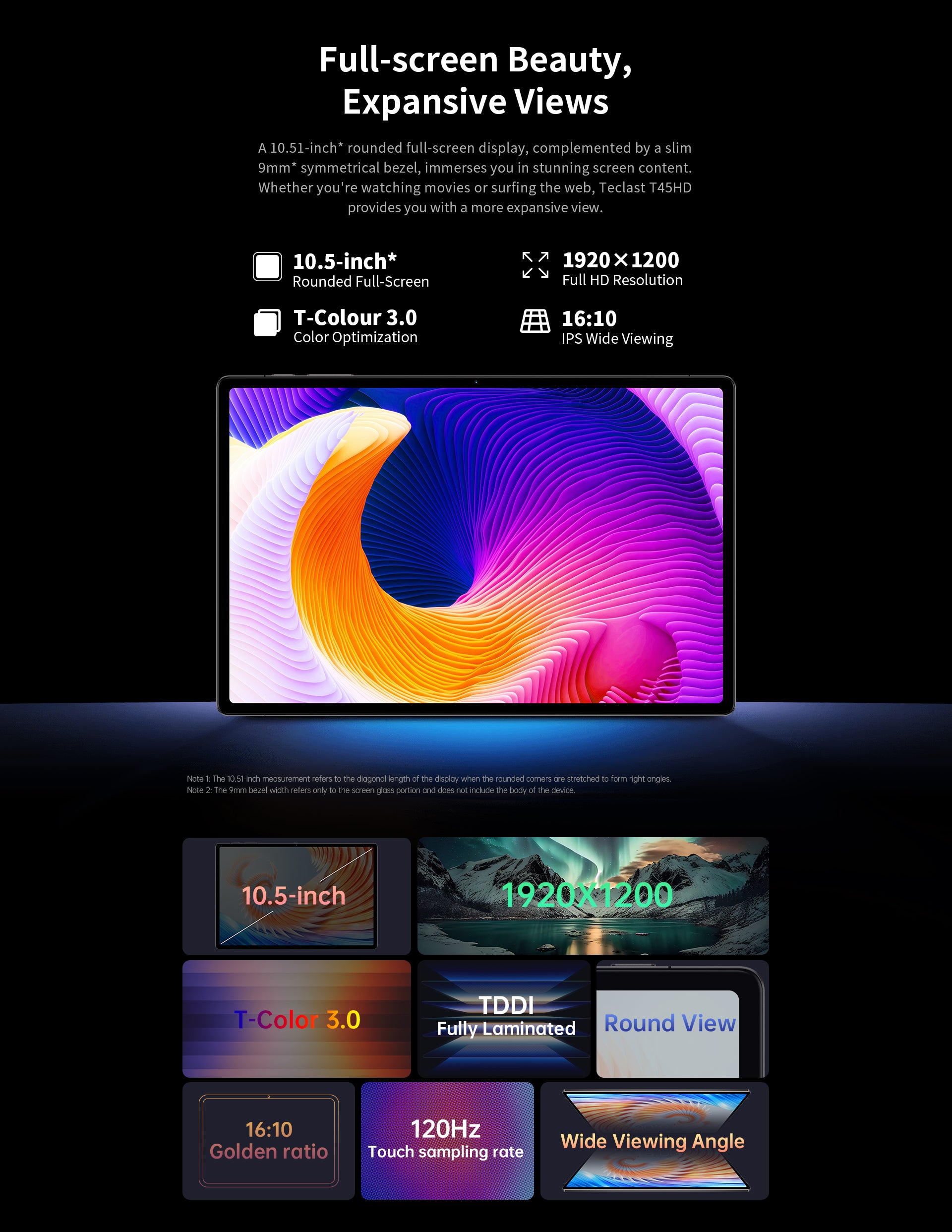 [Visualizzazione 2K realistica] Teclast T45HD presenta un display da 10.Display curvo a schermo intero 2K da 5 pollici, incorniciato da una sottile cornice simmetrica da 9 mm. Migliorato con la tecnologia TDDI e T-Color 3.0, offre un'esperienza visiva coinvolgente.