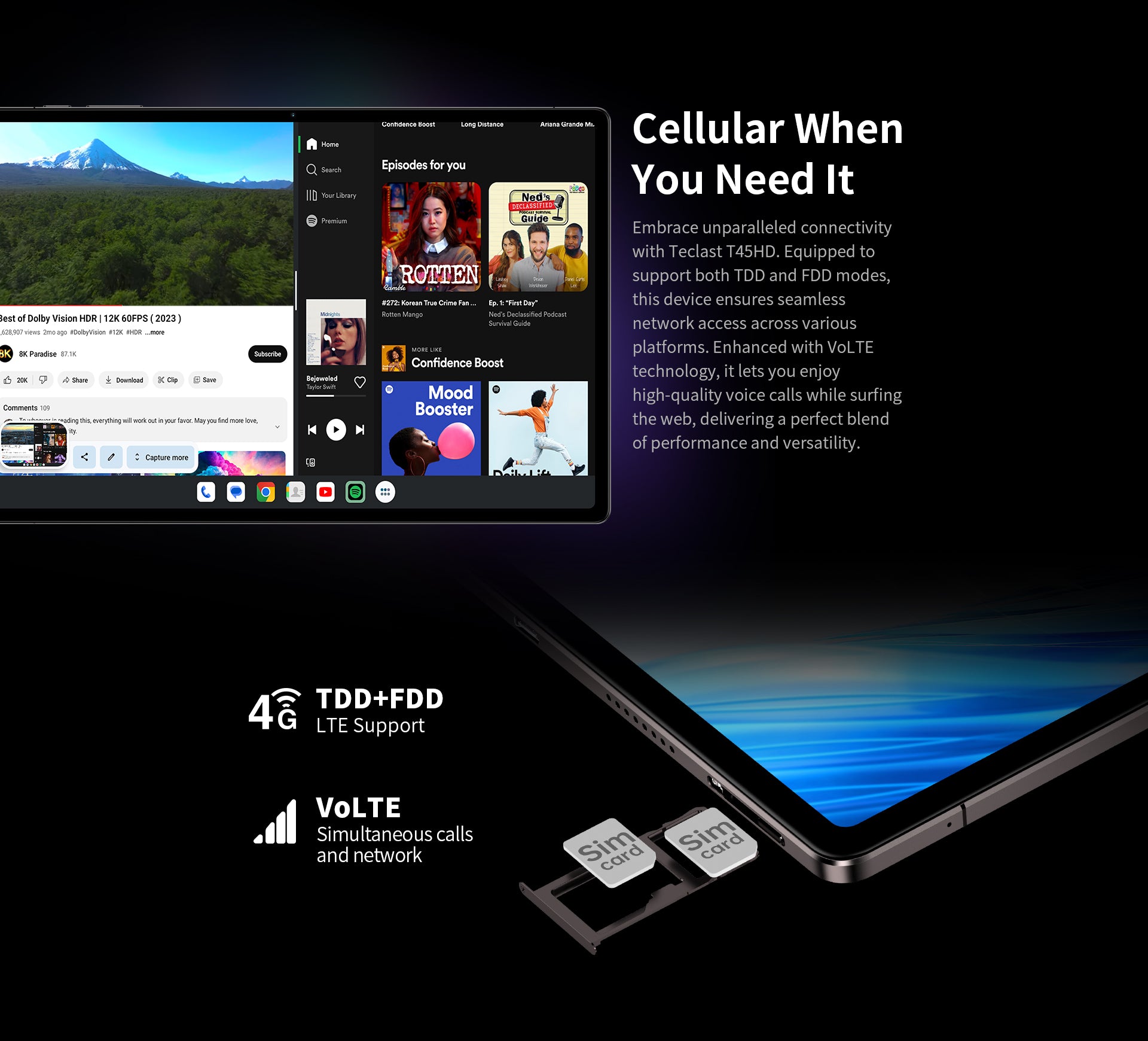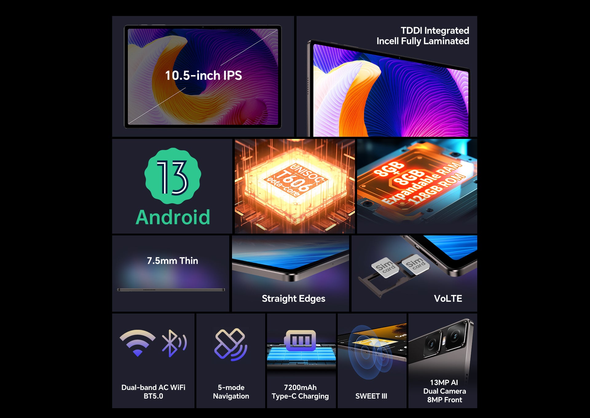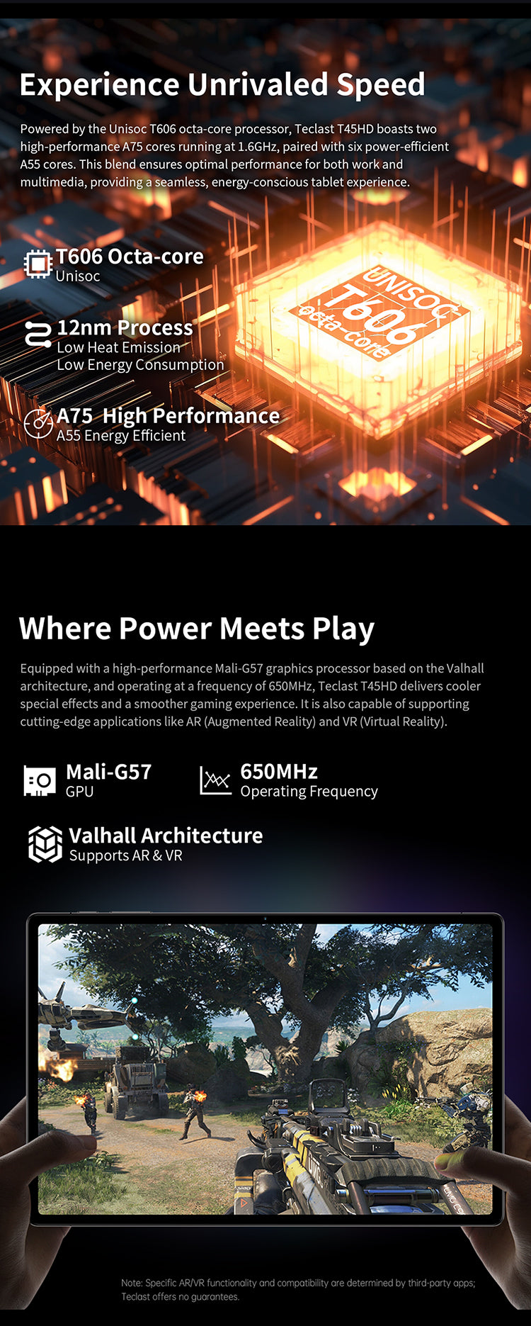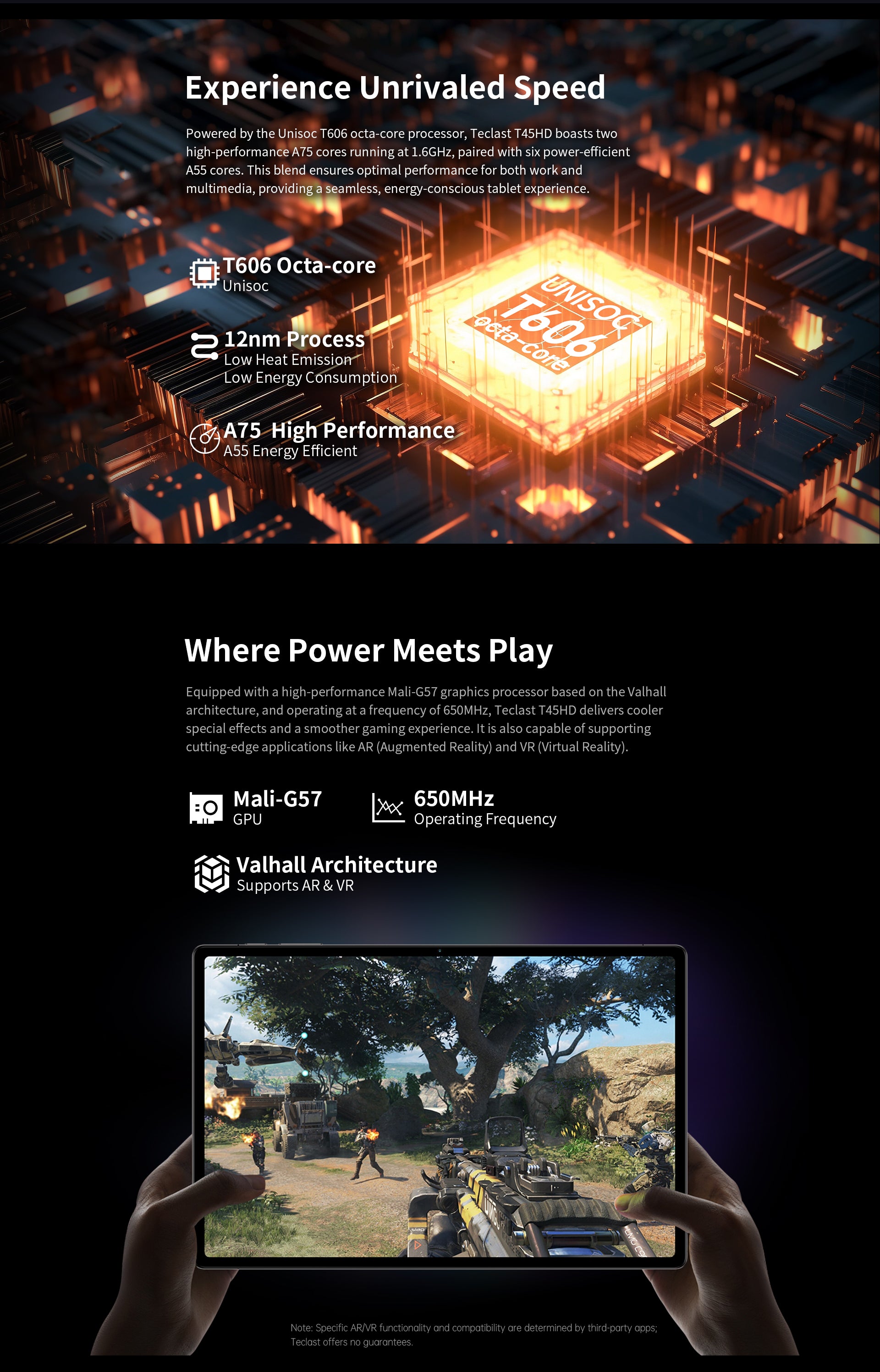 [Robuste prestazioni Octa-Core] Teclast T45HD è alimentato dall'UNISOC Tiger T606 e vanta fino a 16 GB di RAM (8 GB con un'espansione di RAM da 8 GB) e 128 GB di spazio di archiviazione, espandibile a 1 TB tramite una scheda Micro SD.