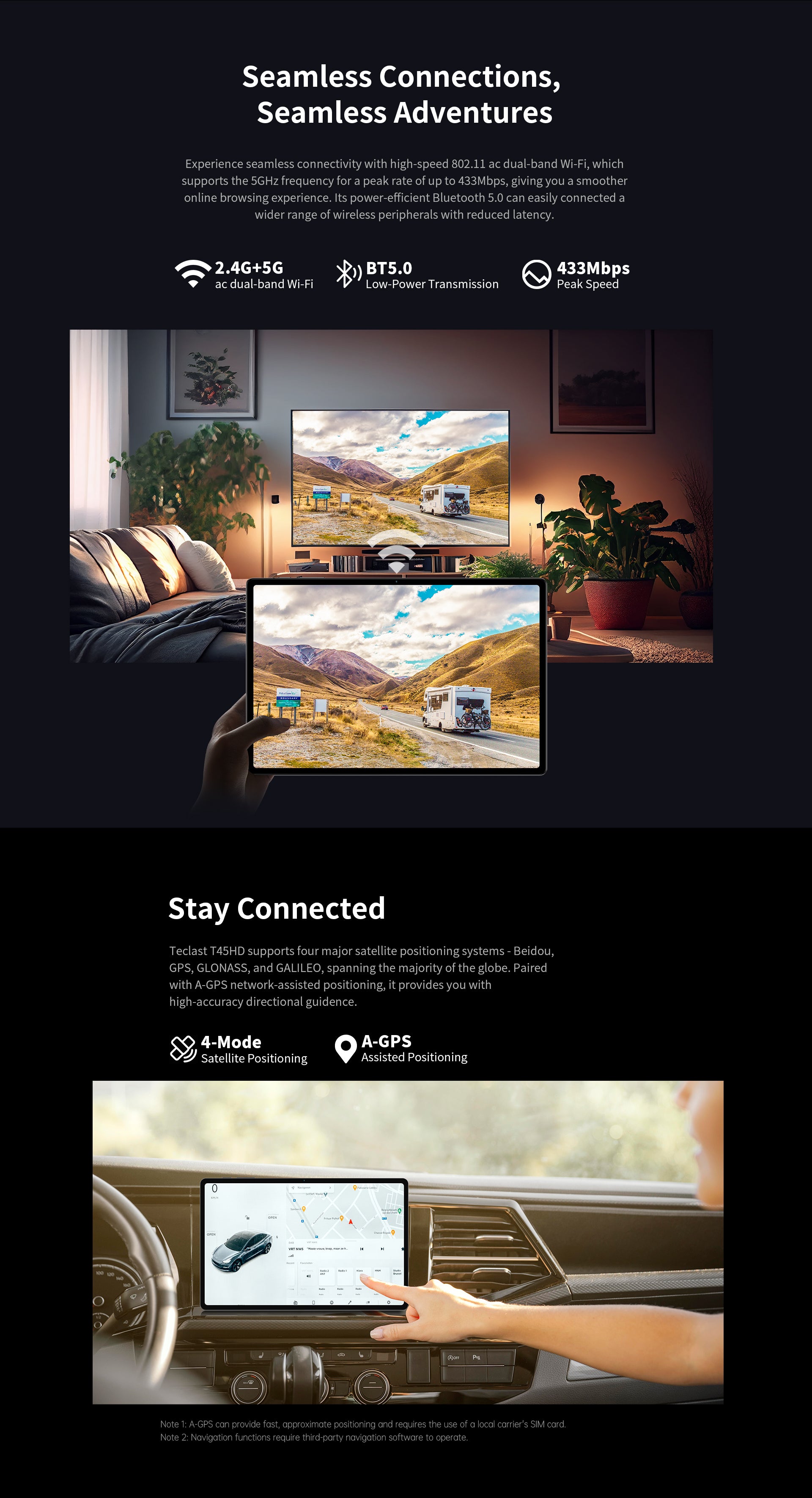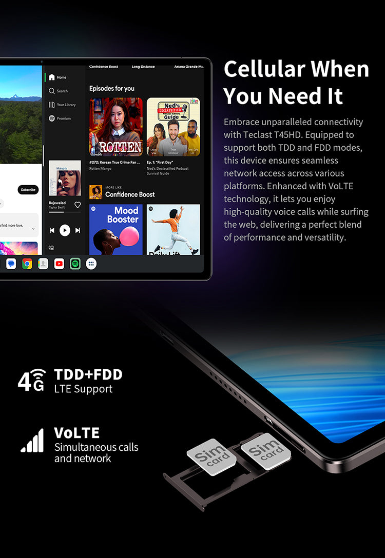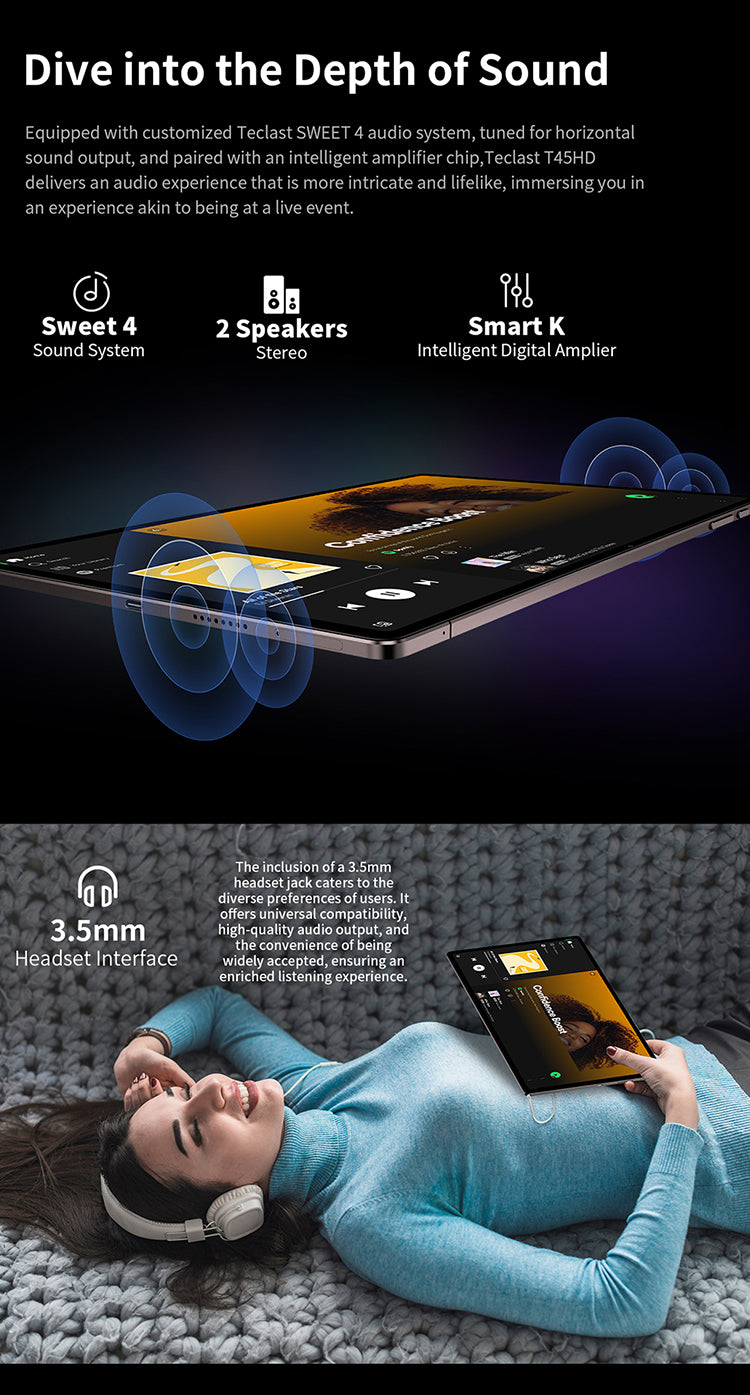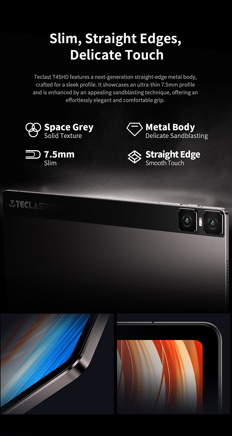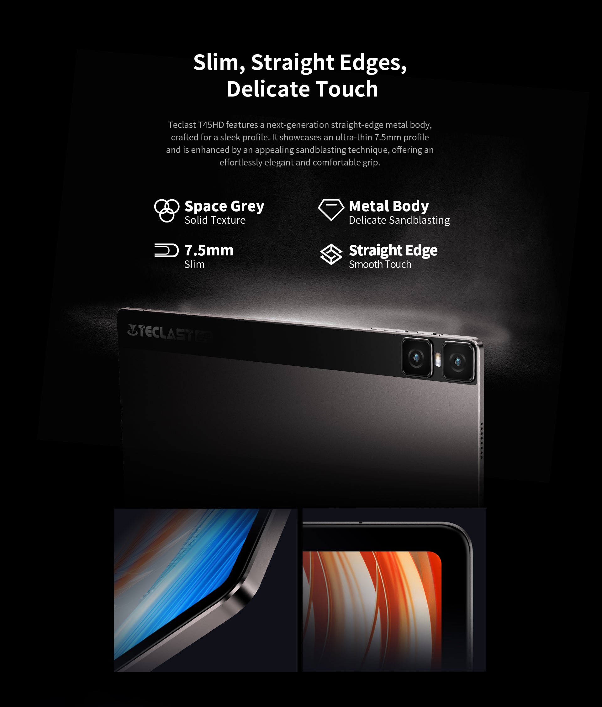 [Delicate Straight Edges] Teclast T45HD presenta un corpo in metallo con bordo dritto di nuova generazione, realizzato per un profilo elegante.Con un sottile 7.Spessore 5 mm, il suo aspetto è ulteriormente elevato da una caratteristica finitura sabbiata.